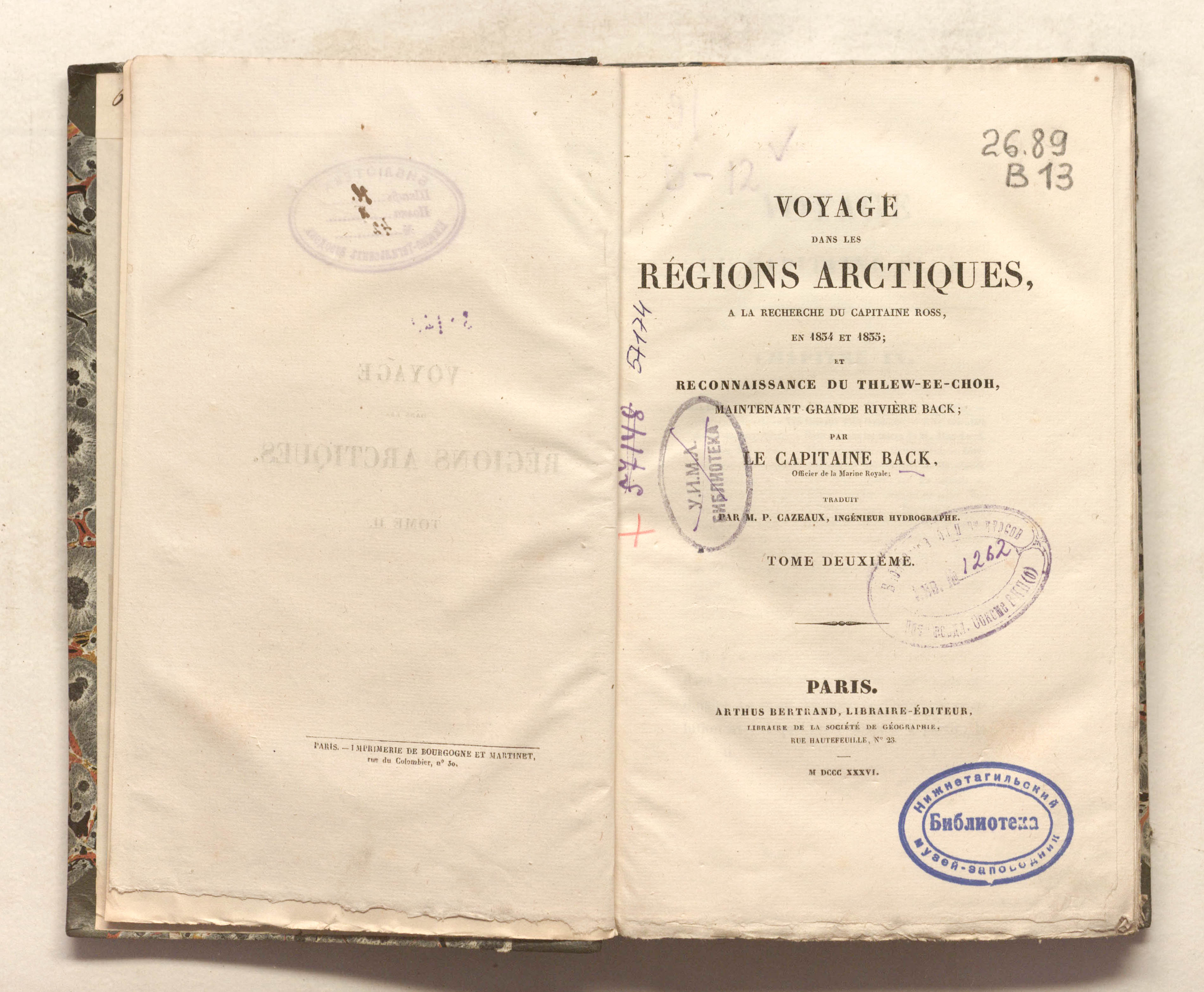 Voyage dans les regions arctiques, a la recherche du capitaine Ross, en 1834 et 1835, et reconnaissance du Thlew-ee-Choh, maintenant grande riviere Back / Par le capitaine Back ... ; traduit par M. P. Cazeaux ... – 2 t. – T. 2. - Paris : Arthus Bertrand , 1836. - 407 p. ; 15х22,5 cm.