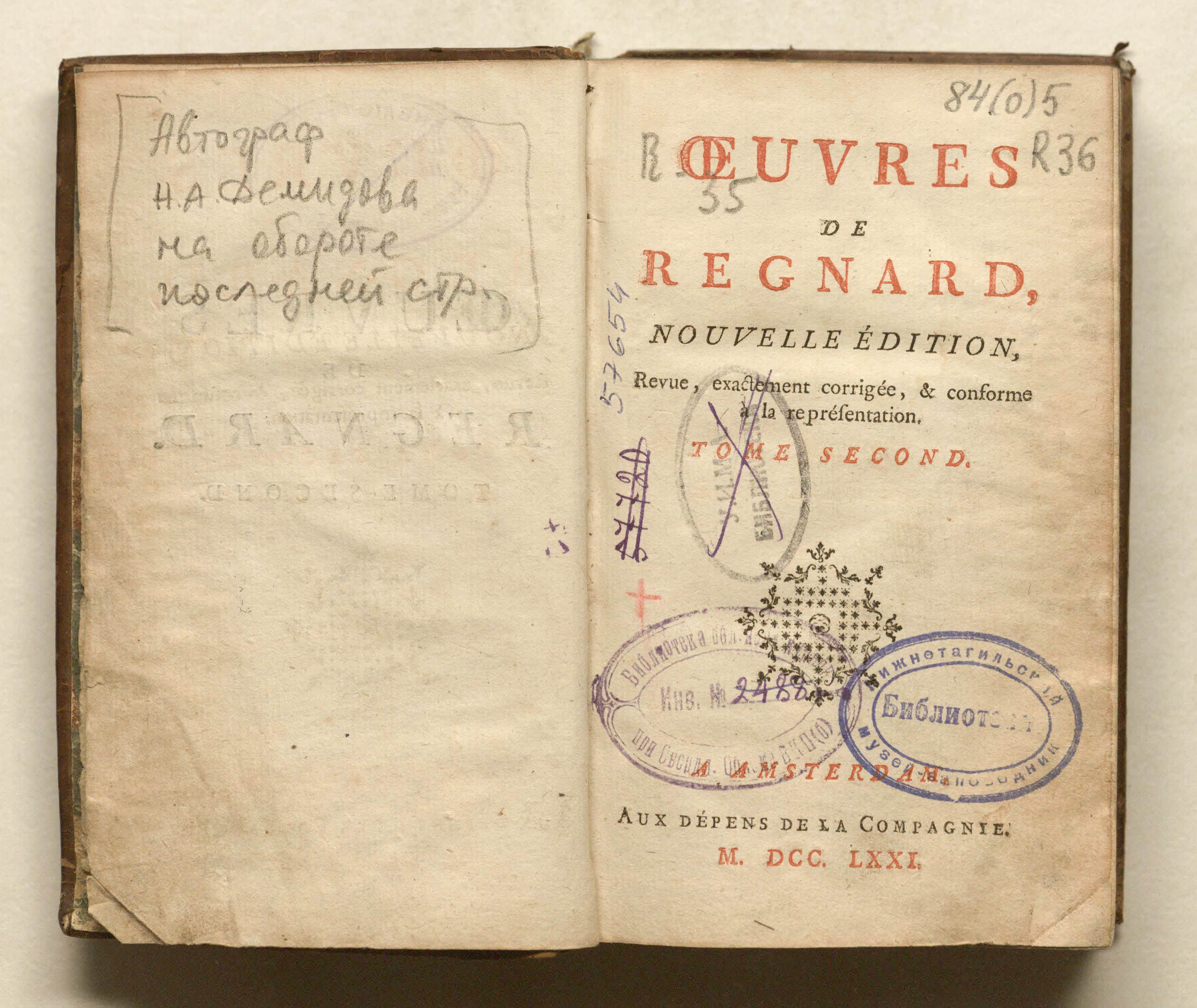 Oeuvres de Regnard, nouvelle edition ...  – 3 t. - T. 2. - Amsterdam : Aux depens de la Compagnie, 1771. - [4], 467, [1] p.; 10,5x16,5 cm.