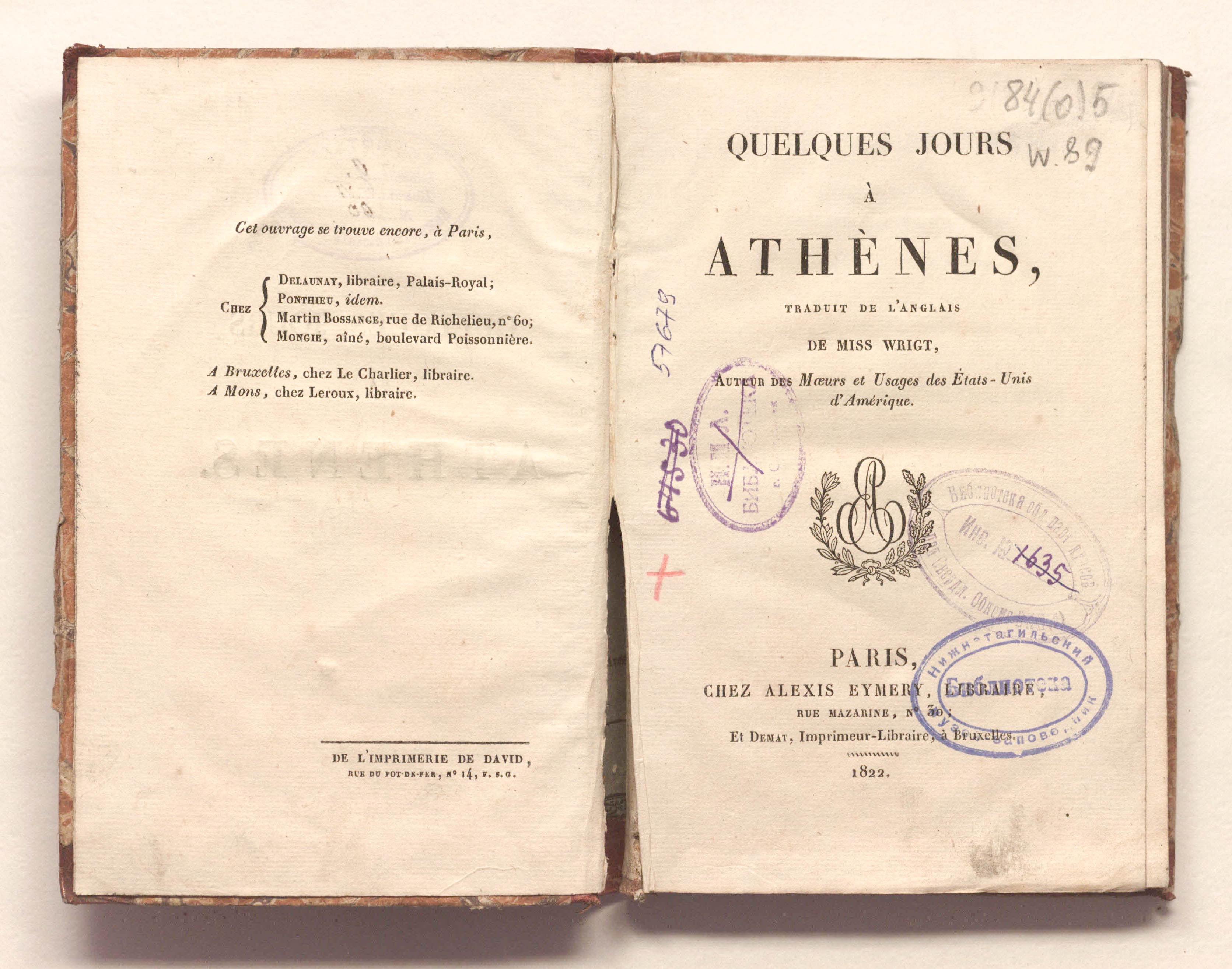 Quelques jours a Athenes, traduit de l'anglais de Miss Wrigt (sic!). – Paris : A. Eymery, 1822. – VII, 175 p. ; 12,5x19 cm.