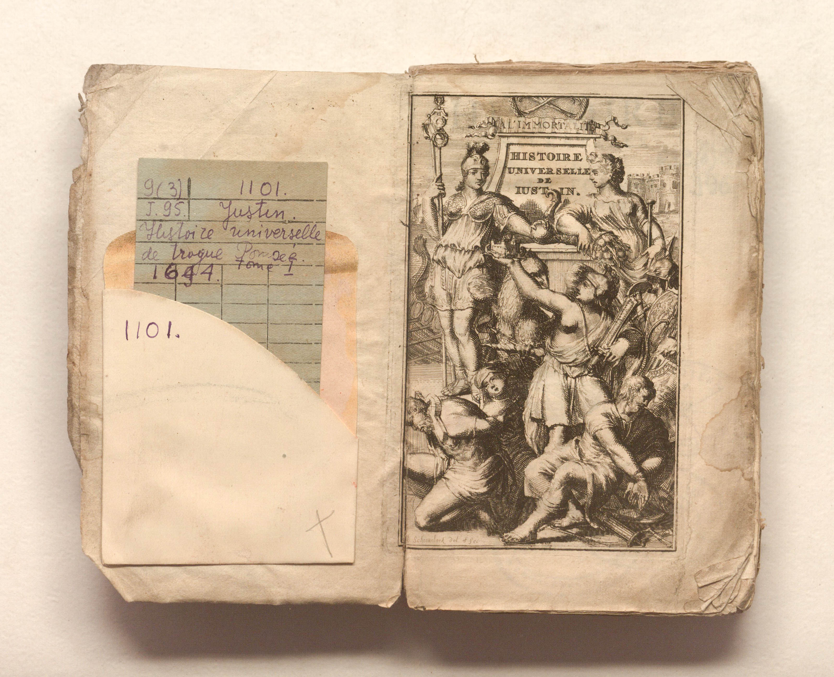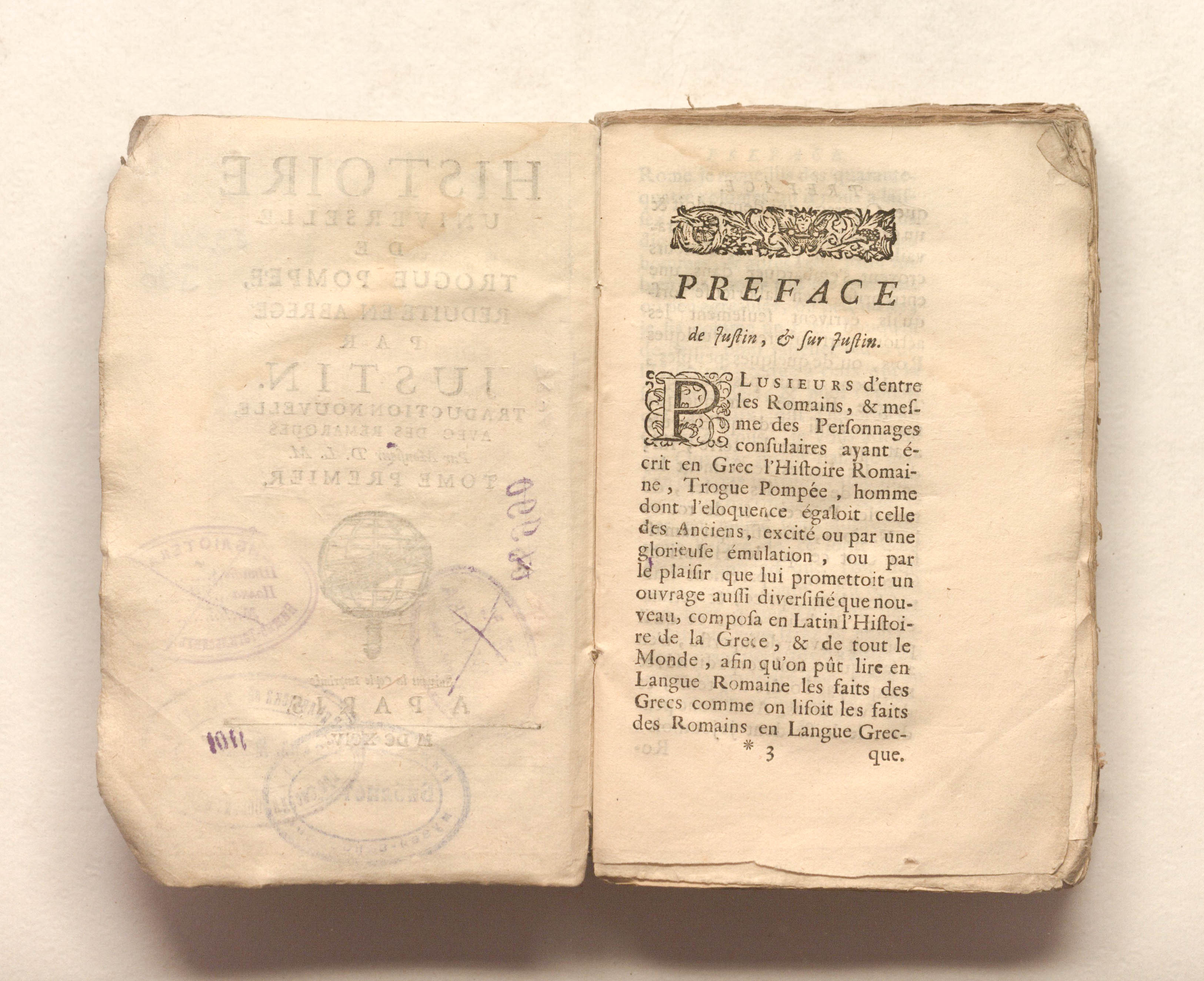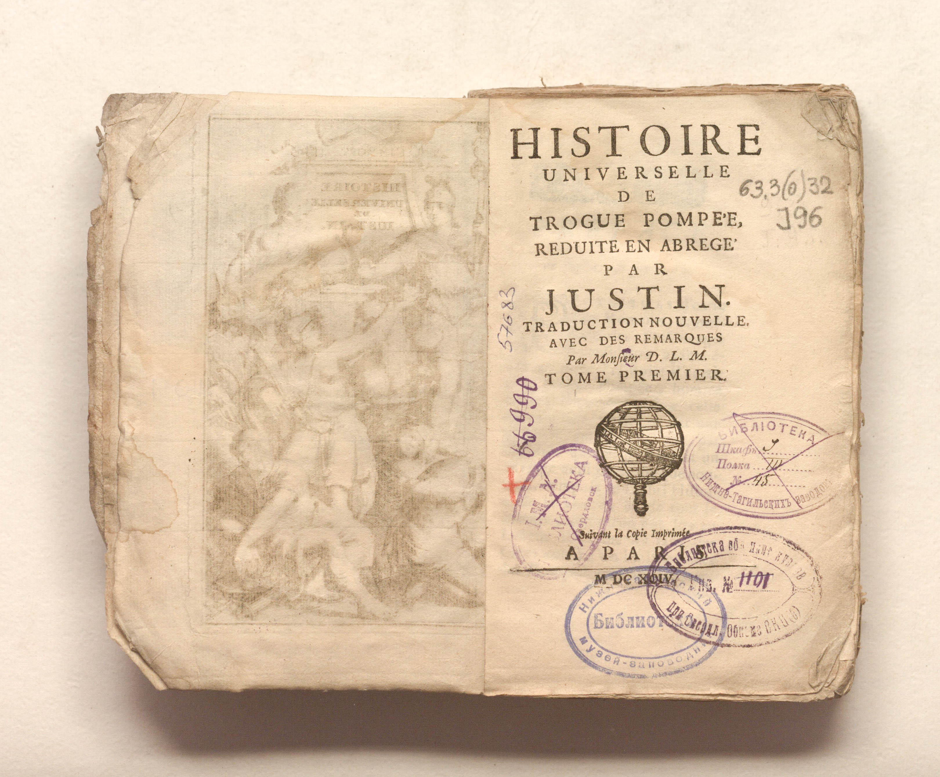 Универсальная история Трога Помпея, сокращенная Юстином. Новый перевод. С замечаниями г-на Д.Л.М. [Луиса Ферье де Ла Мартиньера (1652-1721)]. — Т. 1. — Париж: [б. и.], 1694. — [14], 407. [26], грав. авант. ; 11х17,5 см.