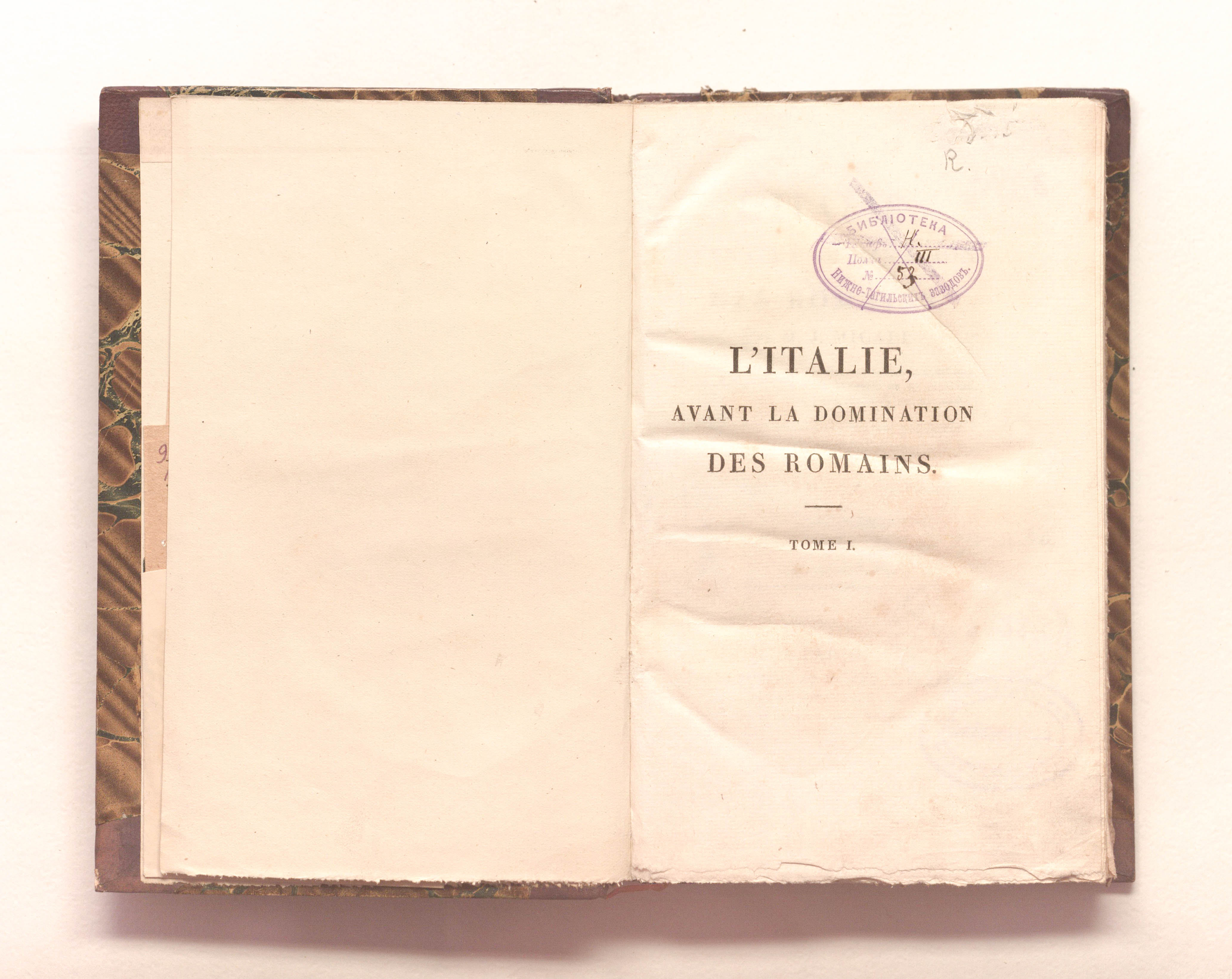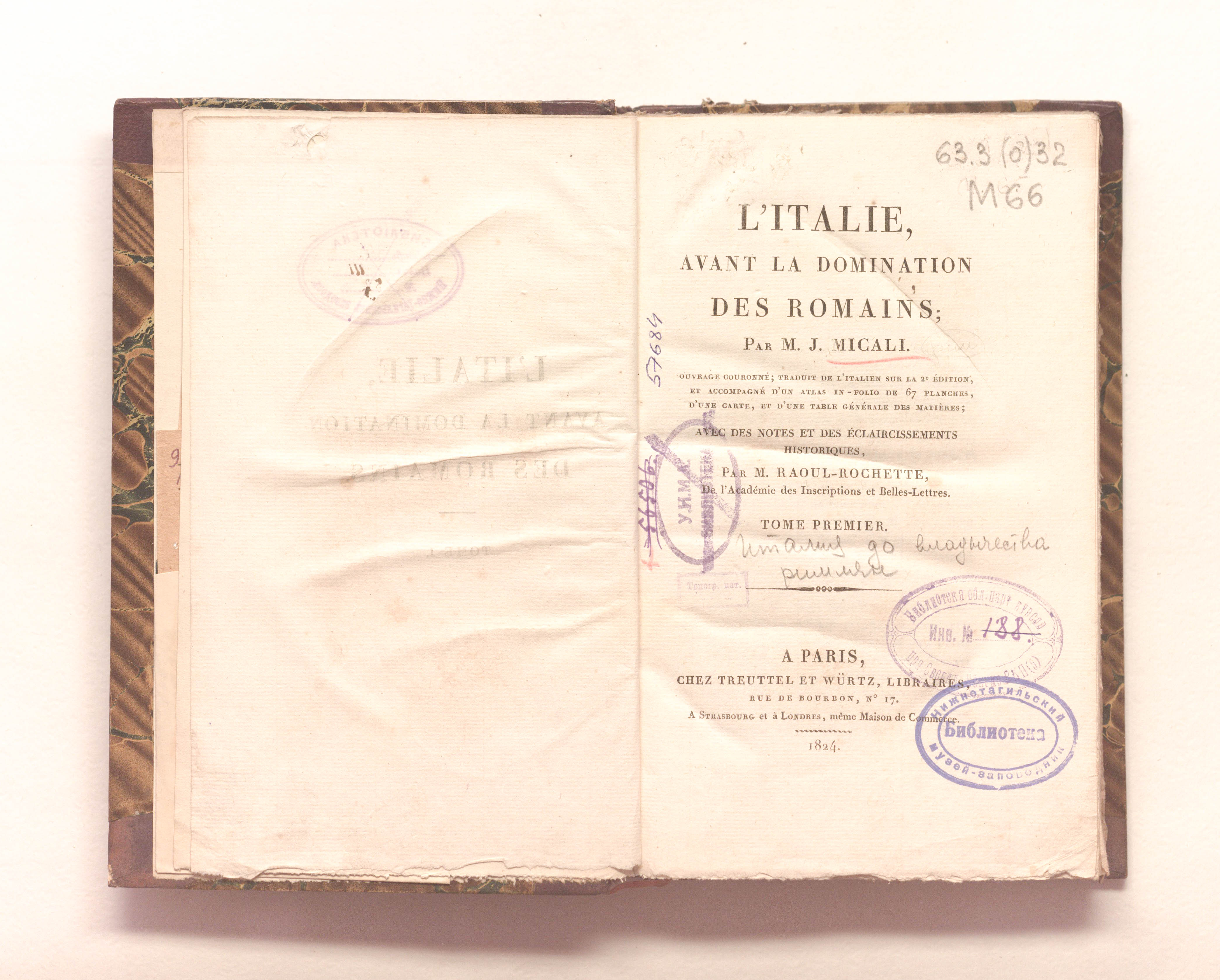 Италия до господства римлян, г-на Дж. Микали. Капитальный труд, переведенный с итальянского языка во 2-м издании... с примечаниями и историческими пояснениями г-на Рауля-Рошетта,... Т. 1. – Париж: Тройттель и Вюрц, 1824. - XIV, 370 с.; 14х22 см.