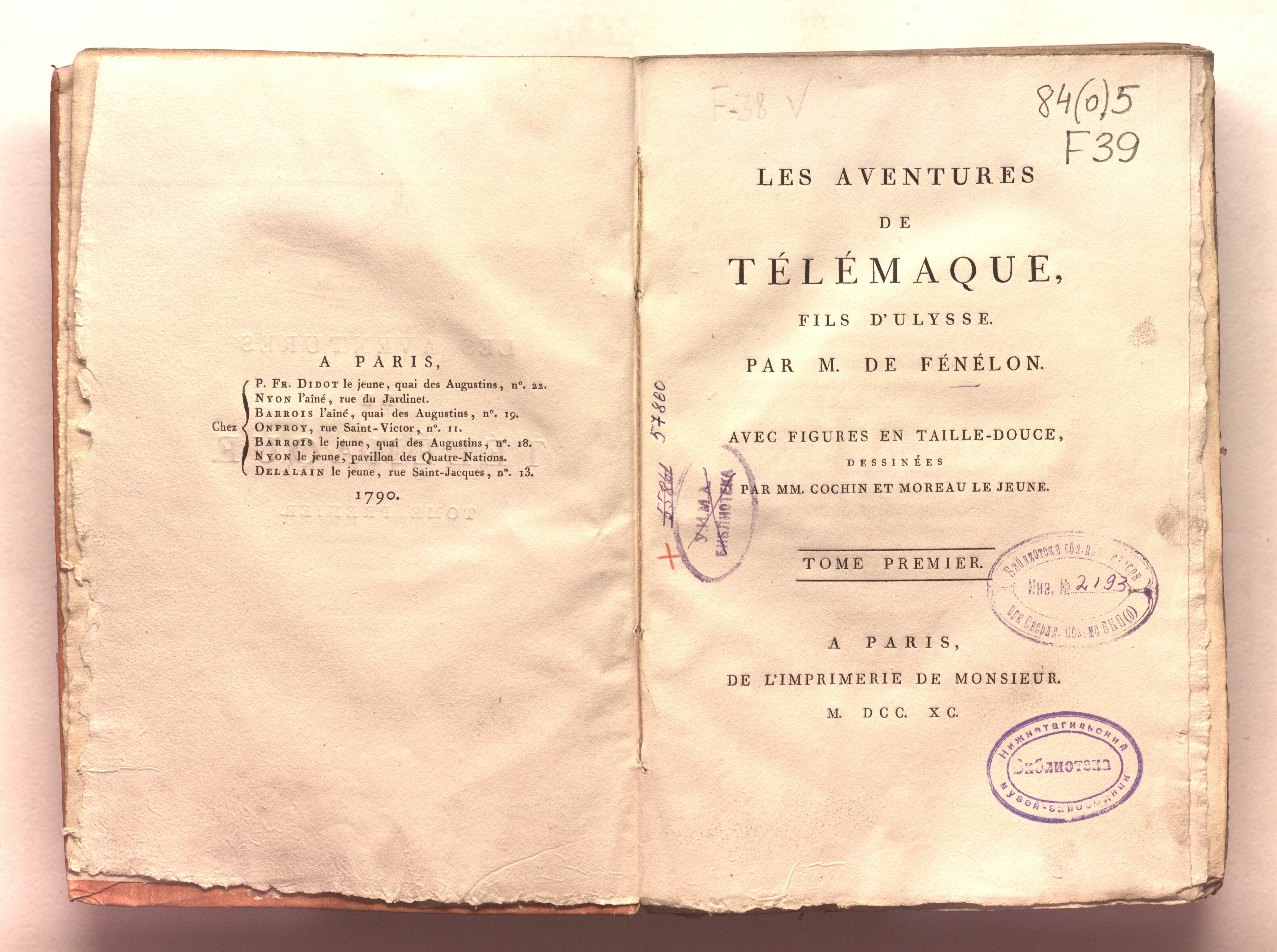 Приключения Телемака, сына Улисса. Сочинение господина де Фенелона. С гравюрами на меди, по рисункам господ Кошена и Моро Младшего. – Т. 1. – Париж : Тип. Месье, 1790. – VIII, [4], 426 с. ; 16,5х24 см.