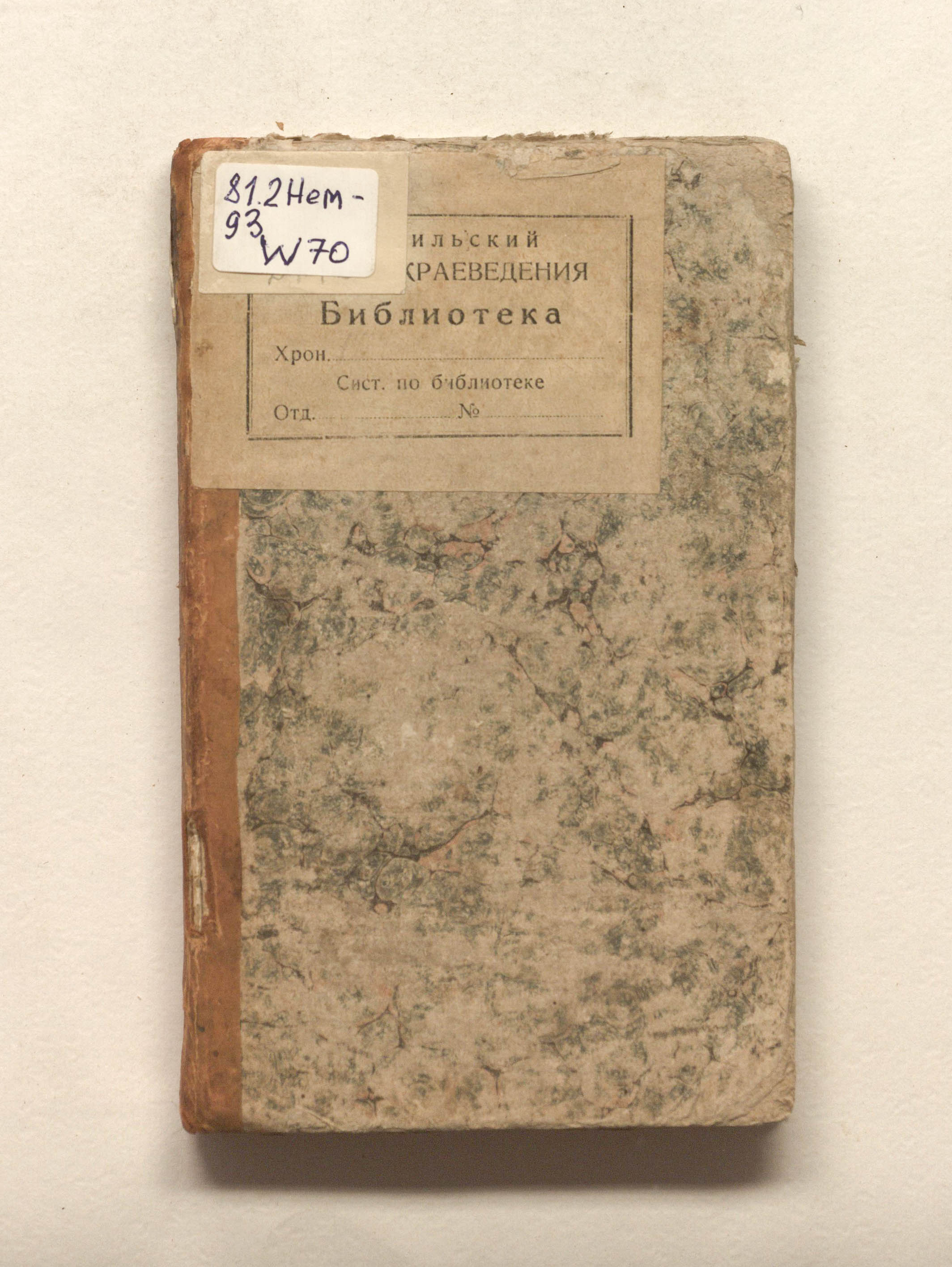 Книга в полукожаном владельческом переплете. На с. I надпись орешковыми чернилами: "Из библиотеки Выйского училища. №1927".