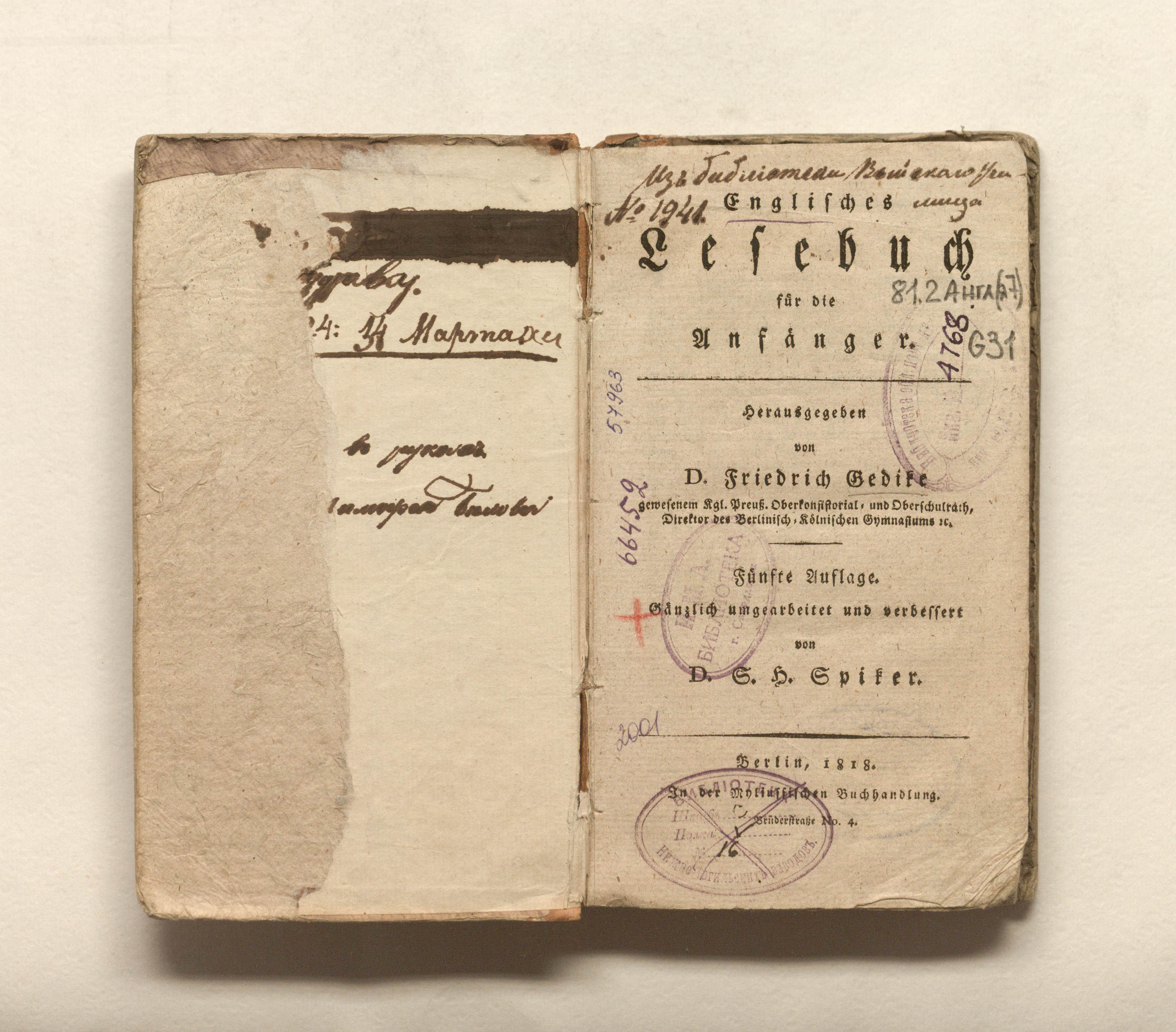 Gedike, Friedrich (1754-1803). Englisches Lesebuch fuer die Anfaenger. Herausgegeben von D. Friedrich Gedike ... Fuenfte Auflage. Gaenzlich umgearbeitet und verbessere von D. G. H. Spiker. — Berlin : Myliussischen Buchhandlung (August Mylius), 1818. — IV, 281 s. ; 10х18 cm.