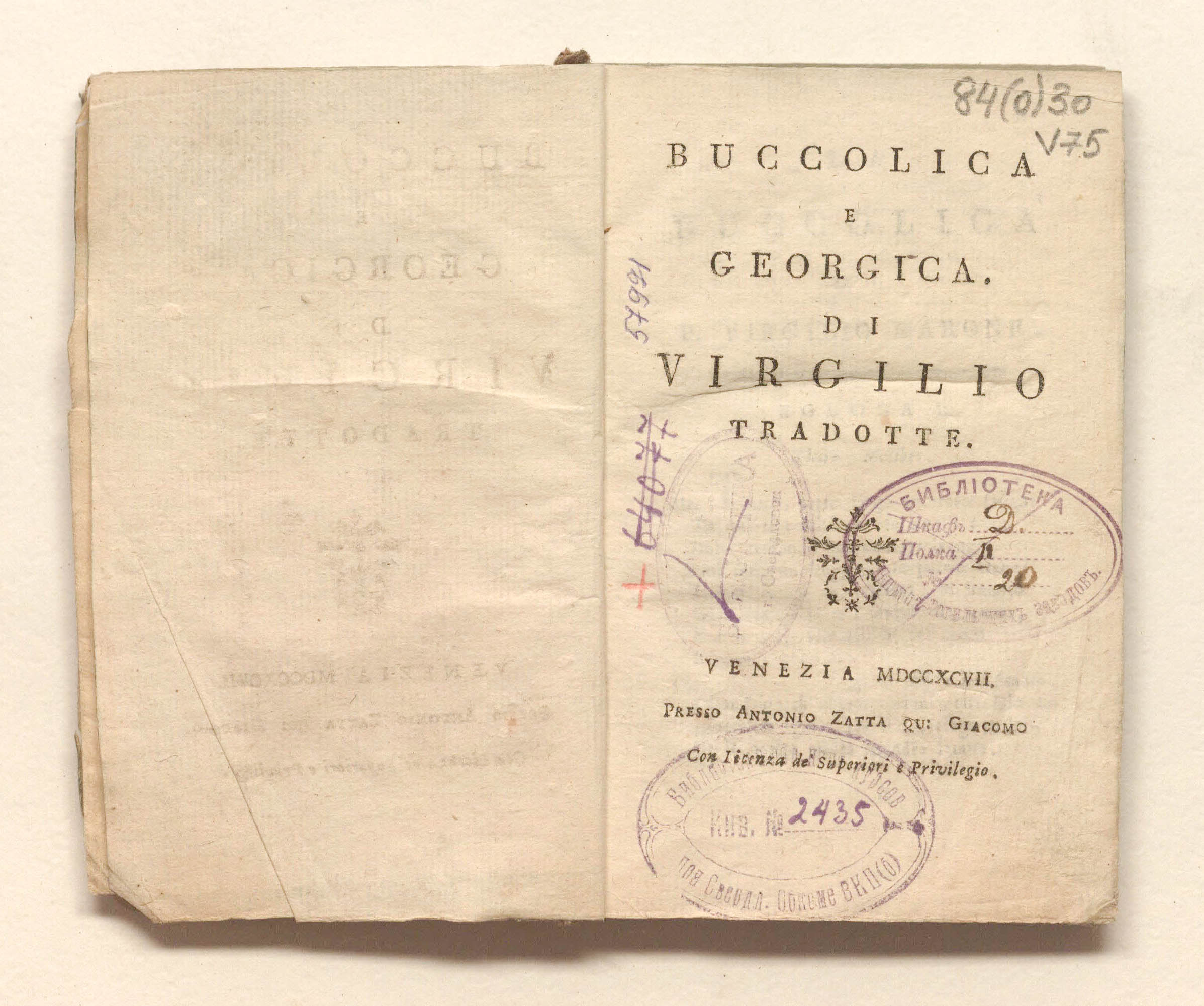 «Буколика» и «Георгика» Виргилия, в переводе. – Венеция : А. Затта, 1797. – 199 с.; 9,5х14 см.