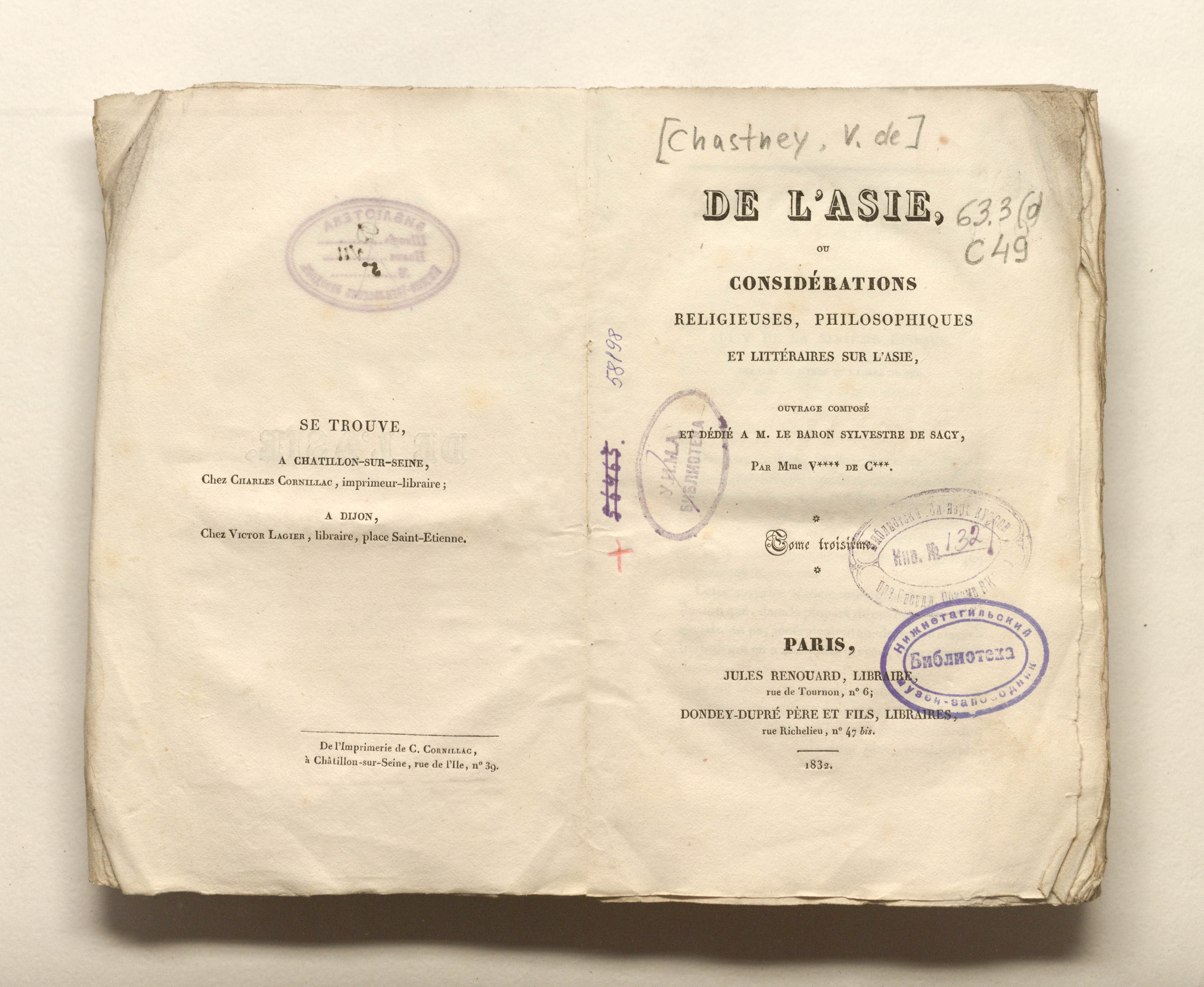 Об Азии, или Религиозные, философские и литературные соображения об Азии, работа, написанная и посвященная г-ну барону Сильвестру де Саси г-жой В**** де К***.