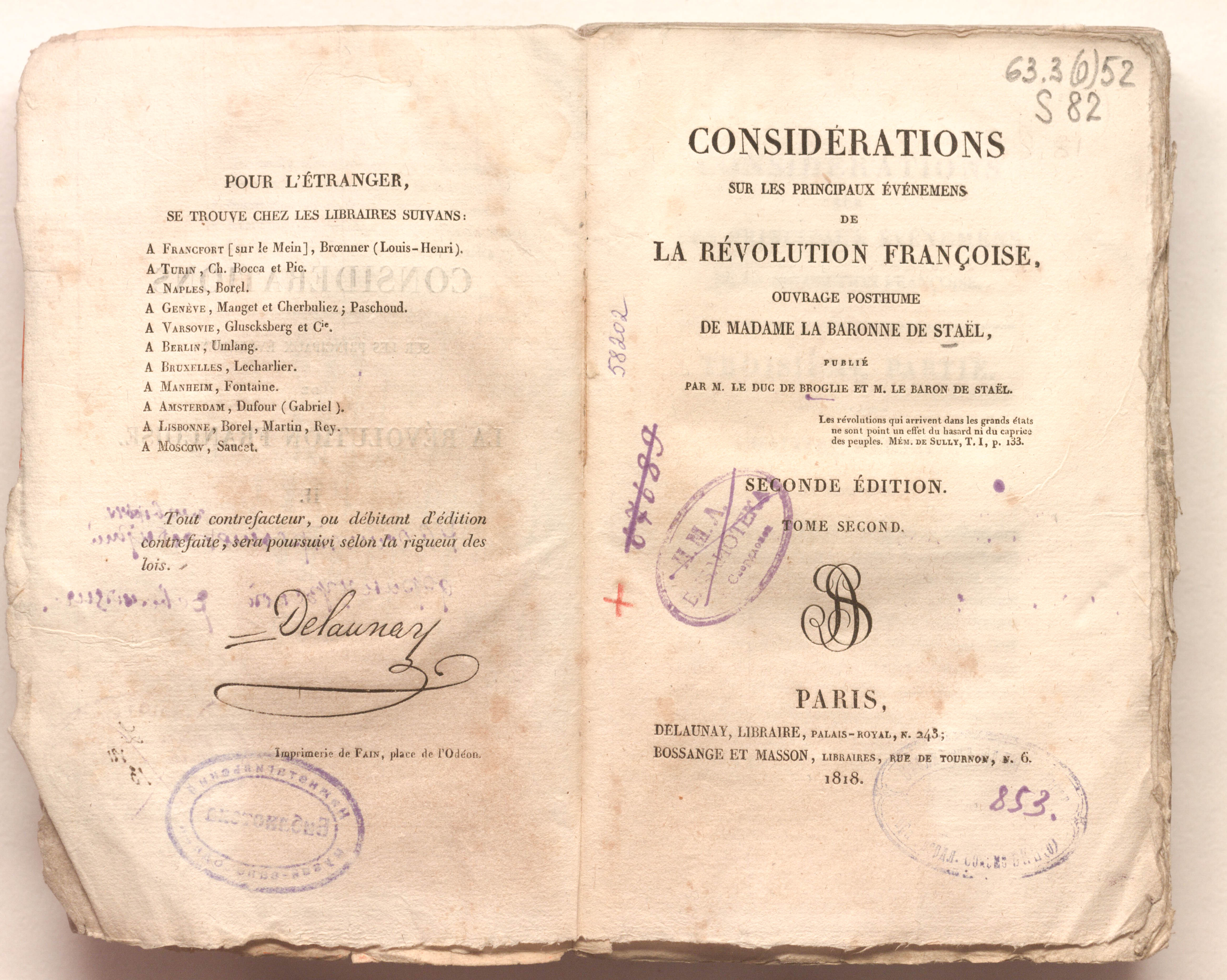 Considerations sur les principaux evenemens de la Revolution francoise, ouvrage posthume de madame la baronne de Stael, publie par M. le duc de Broglie et M. le baron de Stael. 2 t. - T. 2. - 2nd ed. - Paris : Delaunay; Bossange et Masson, 1818. - 424 p. ; 13,5x21 cm.