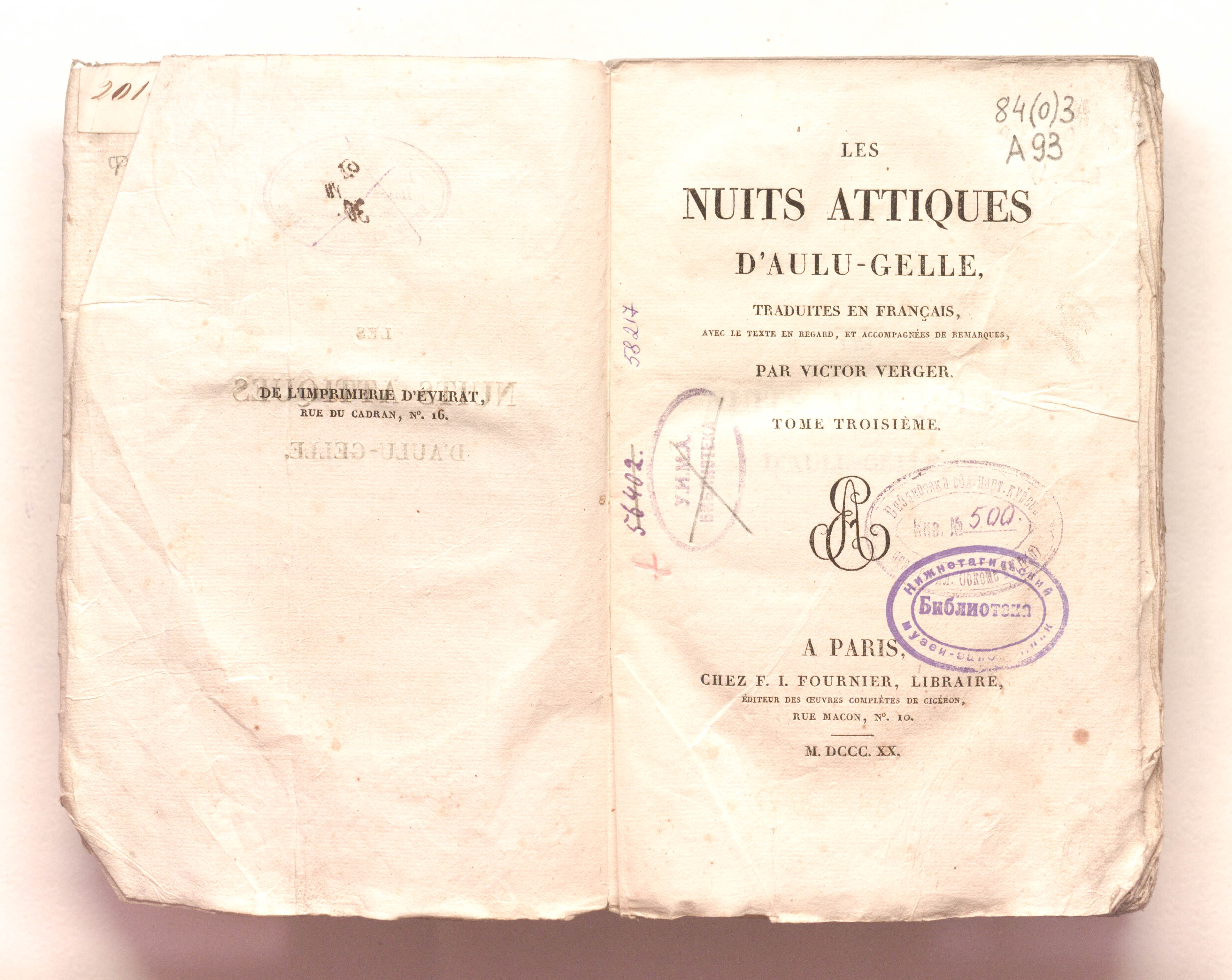 Аттические ночи Авла Геллия, перевод на французский язык с параллельным текстом, сопровождаемый примечаниями, Виктора Верже. – 3 т. – Т. 3. – Париж : Ф.И.Фурнье, 1820. – 553 с. ; 13,5х21 см.