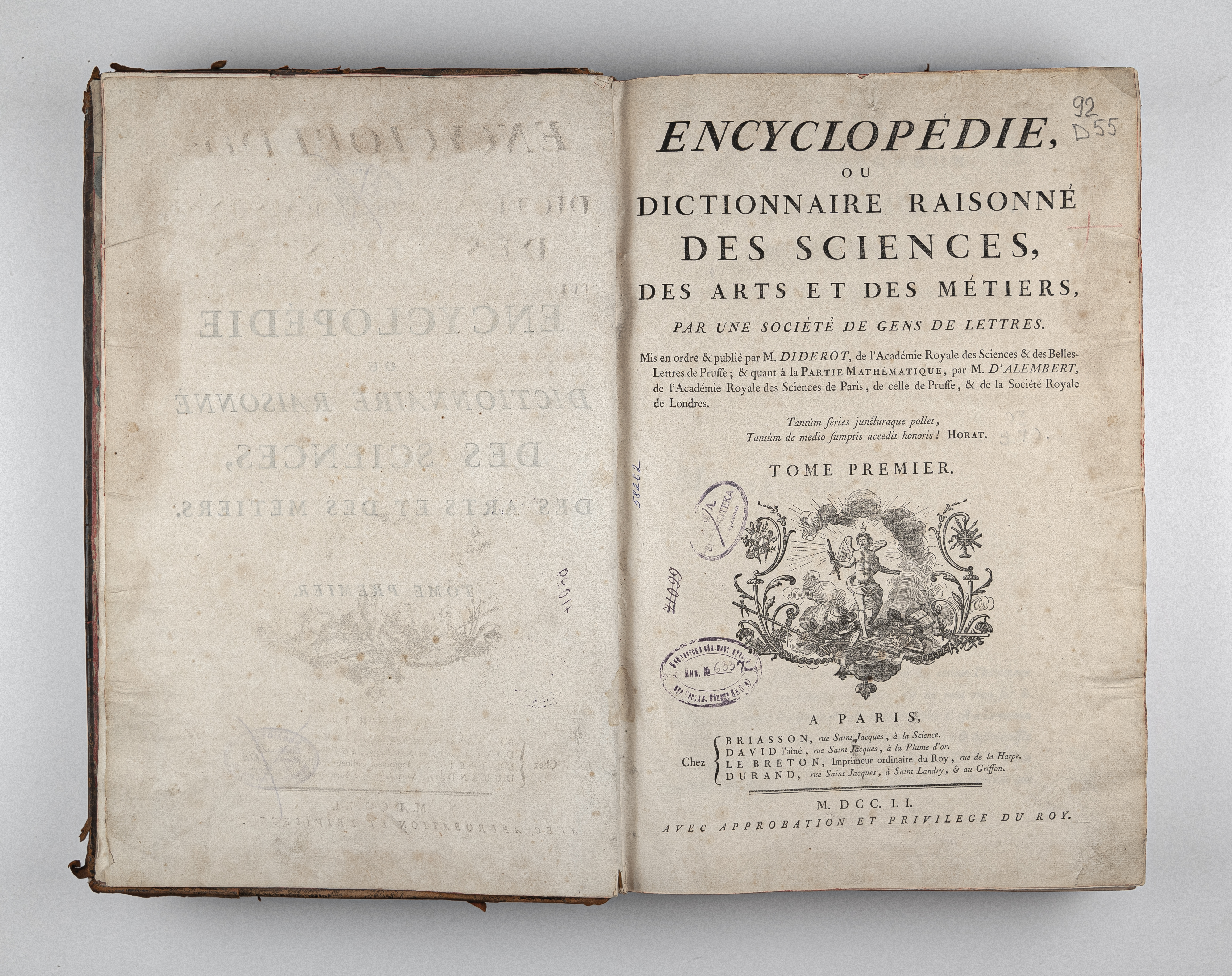 Дидро, Дени (1713-1784), Даламбер, Жан Лерон (1717-1783). Энциклопедия, или Толковый словарь наук, искусств и ремёсел / Общества литераторов. Отредактировано и опубликовано г-ном Дидро…; а что касается математической части, – г-ном Даламбером ... – Париж : Бриассон, 1751-1780. – В 35 т.; 40х26 см.