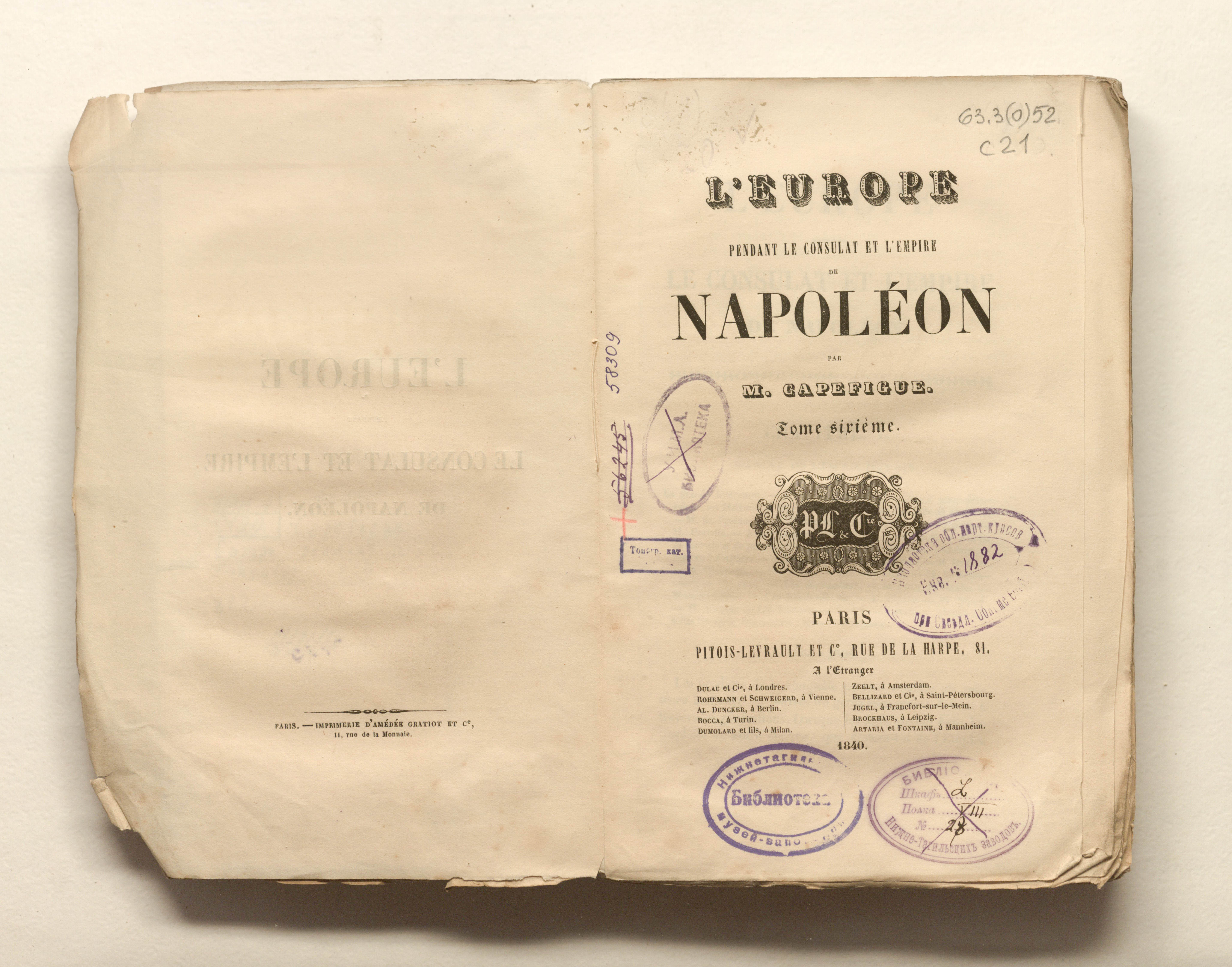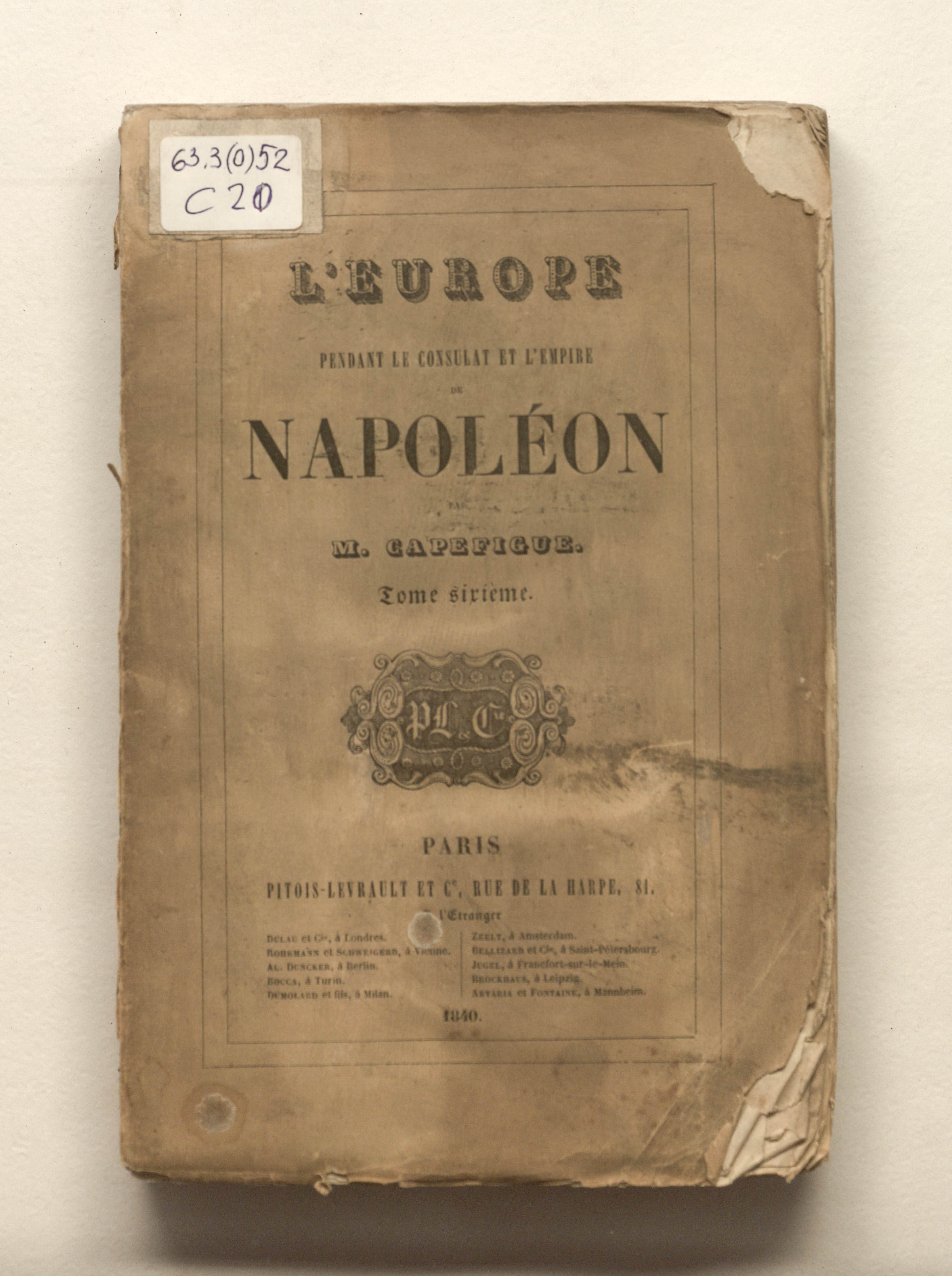 Capefigue, Jean-Baptiste (1801-1872). L'Europe pendant le Consulat et l'Empire de Napoleon, par M. Capefigue. Tome sixieme. - Paris : Pitois-Levrault et Cie, 1840. - 454 p. ; 15х23cm.