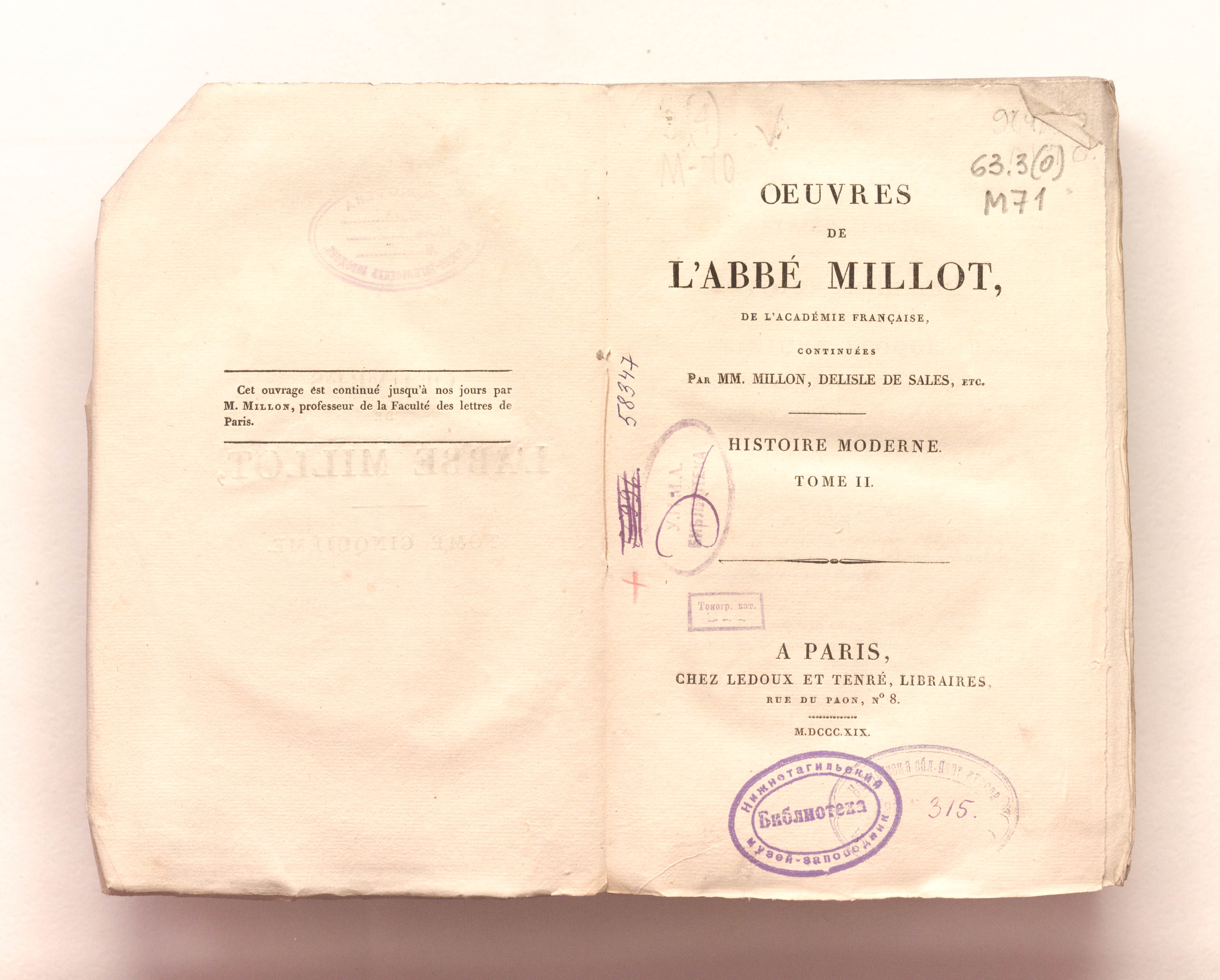 Сочинения аббата Мийо,... в продолжение работ господ Мийона, Делиль де Саль и др. Том пятый. Современная история. Том 2. – Т. 5 (2). – Париж: Леду и Тенре, 1819. – 524 с.; 13х21 см.