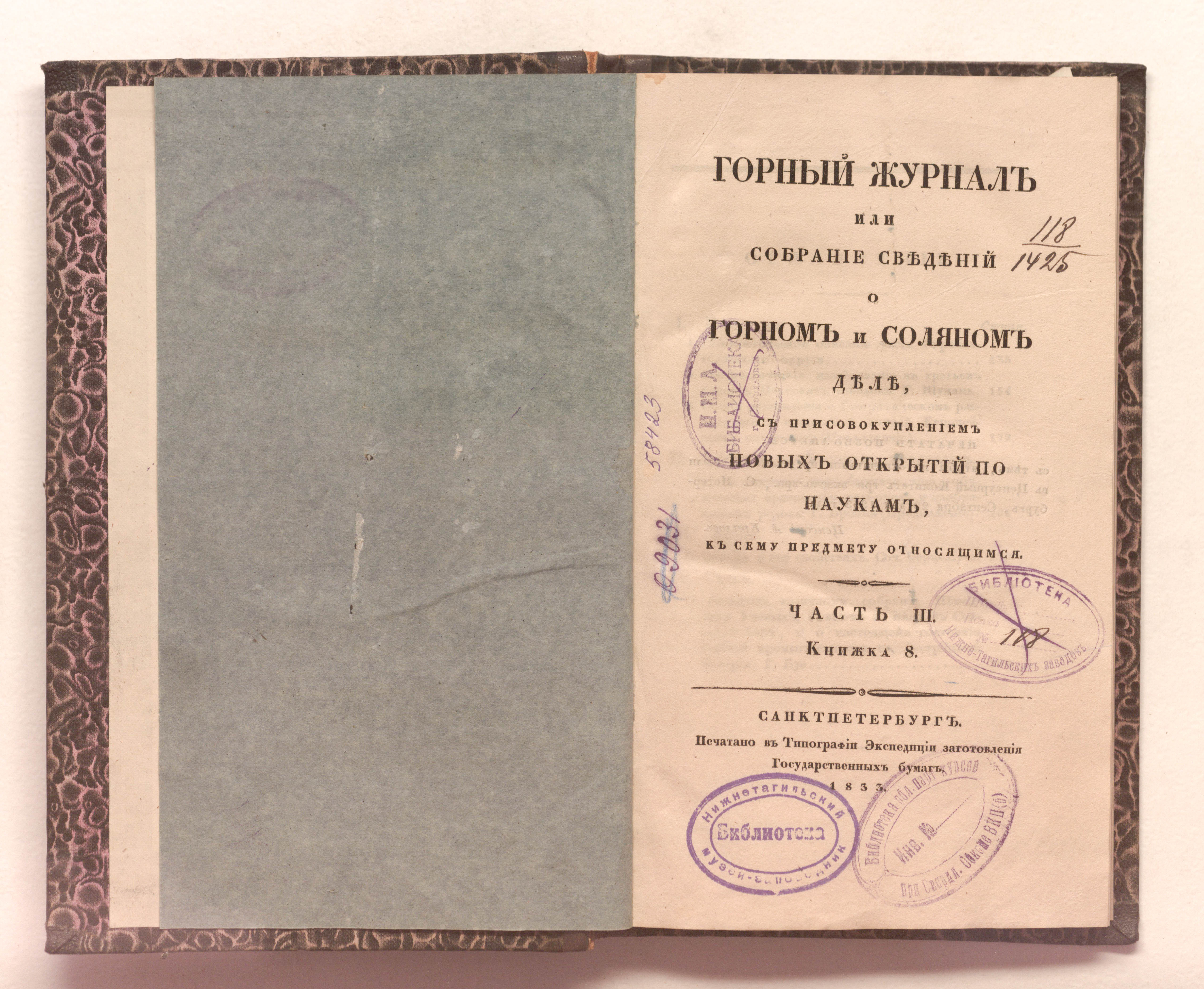 «Библиотека Нижне-Тагильских заводов. № 118» (изд. обл.. тит. л.);