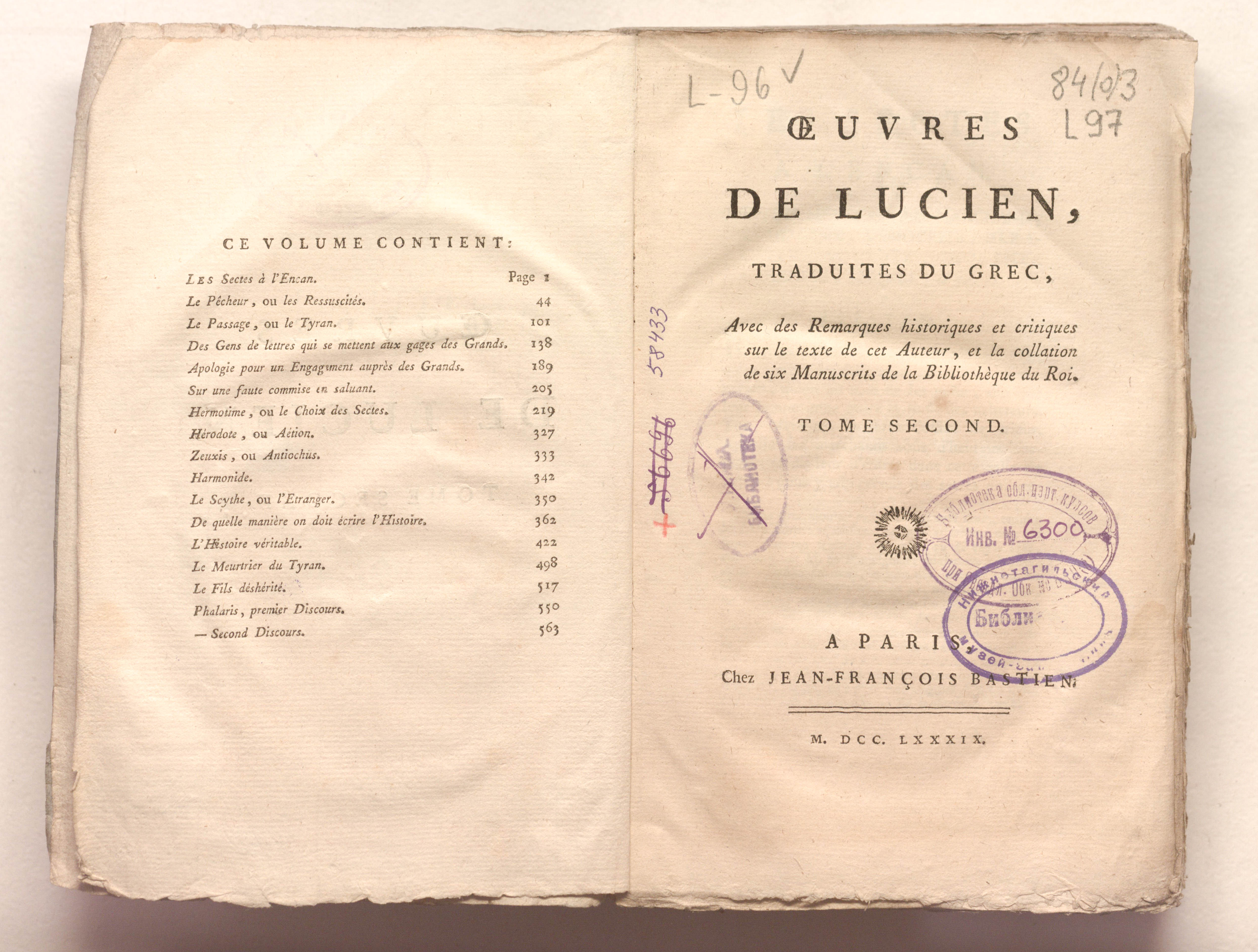 Oeuvres de Lucien, traduites du grec [par Jacques-Nicolas Belin de Ballu], avec des remarques historiques et critiques sur le texte de cet auteur, et la collation de six manuscrits de la Bibliotheque du Roi. – 6 t. – T. 2. – Paris : J.-F. Bastien, 1789. – 568 p.; 14х21,5 cm.