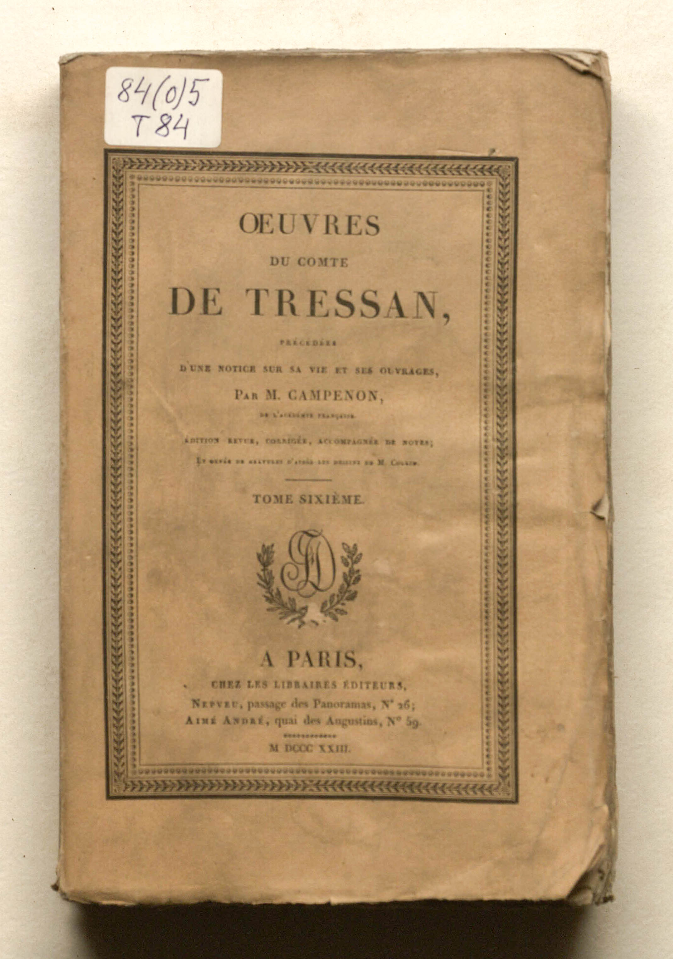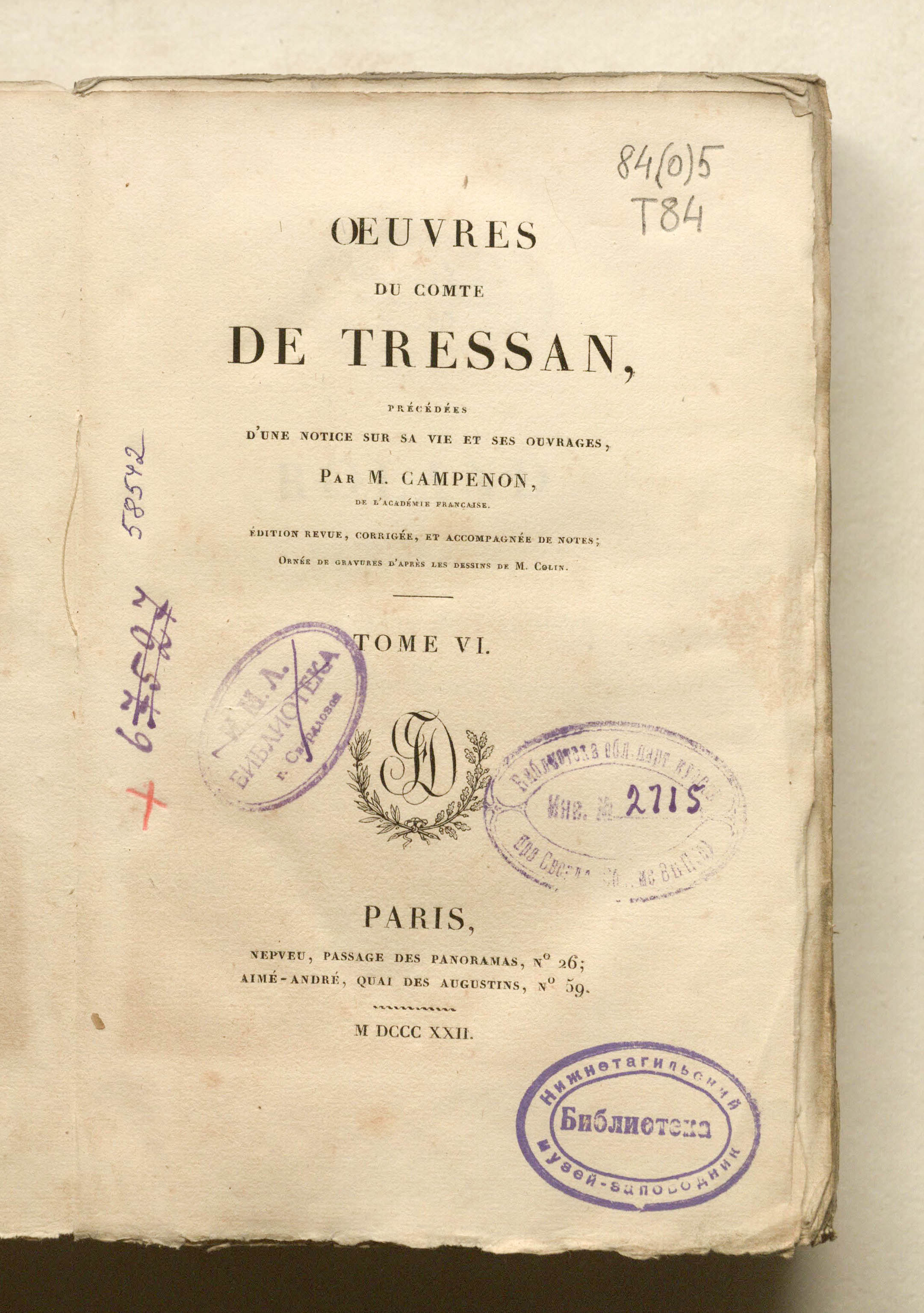 Сочинения графа Трессана, предварённые запиской о его жизни и творчестве, написанной М. Кампеноном, членом Французской академии. Переработанное, исправленное издание с примечаниями, украшенное гравюрами по рисункам М. Колена. – 10 т. – Т. 6. – Париж : Непвё; Эме-Андре, 1822. – 480 с. : 1 ил., грав. фронт.; 14х22 см.