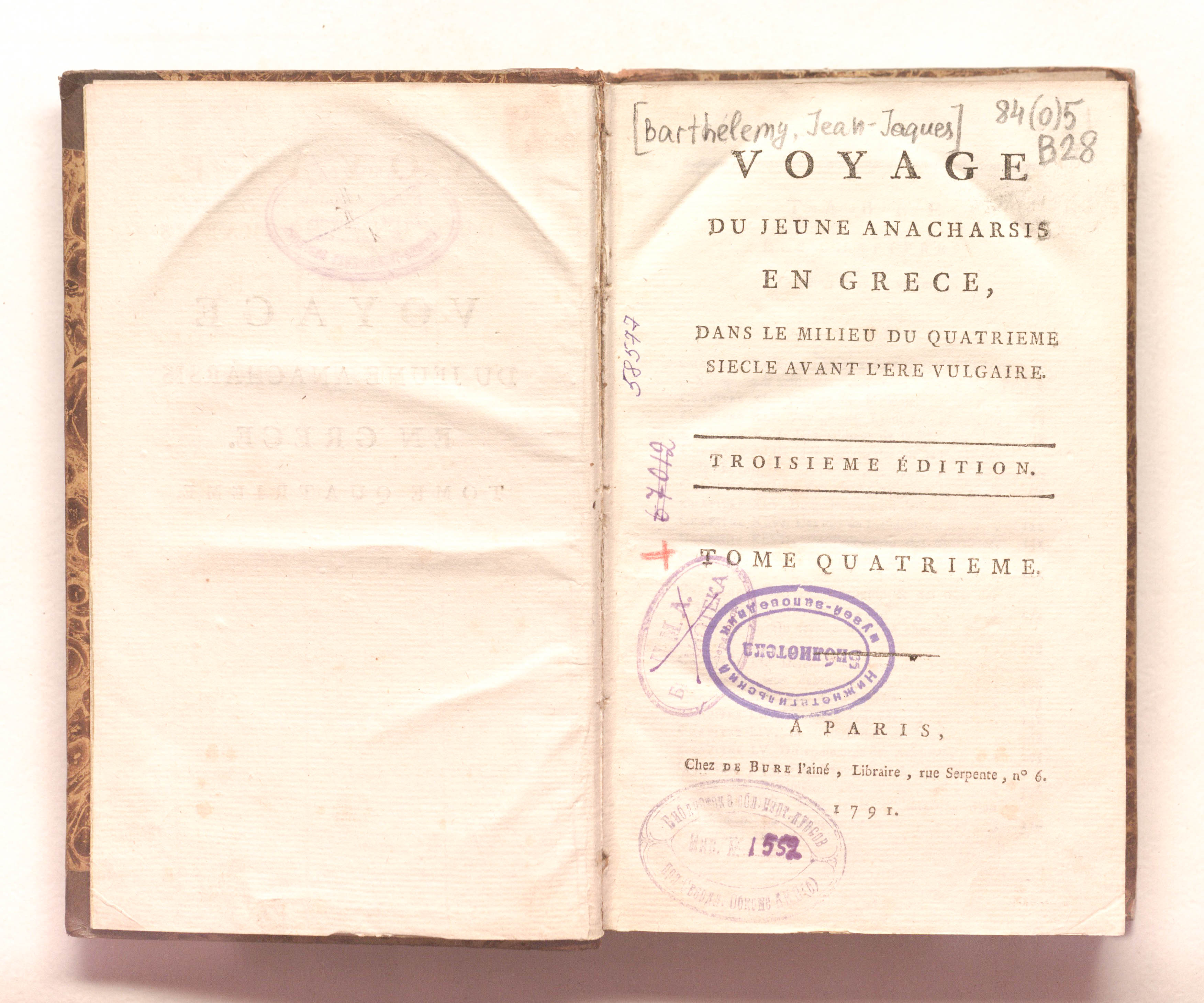 Voyage du jeune Anacharsis en Grece dans le milieu du quatrieme siecle avant l'ere. – 7 t. – 3me ed. T. 4. – Paris : Bure l’aine, 1791. – [2], 411 p. ; 12,8 х20,3 cm.