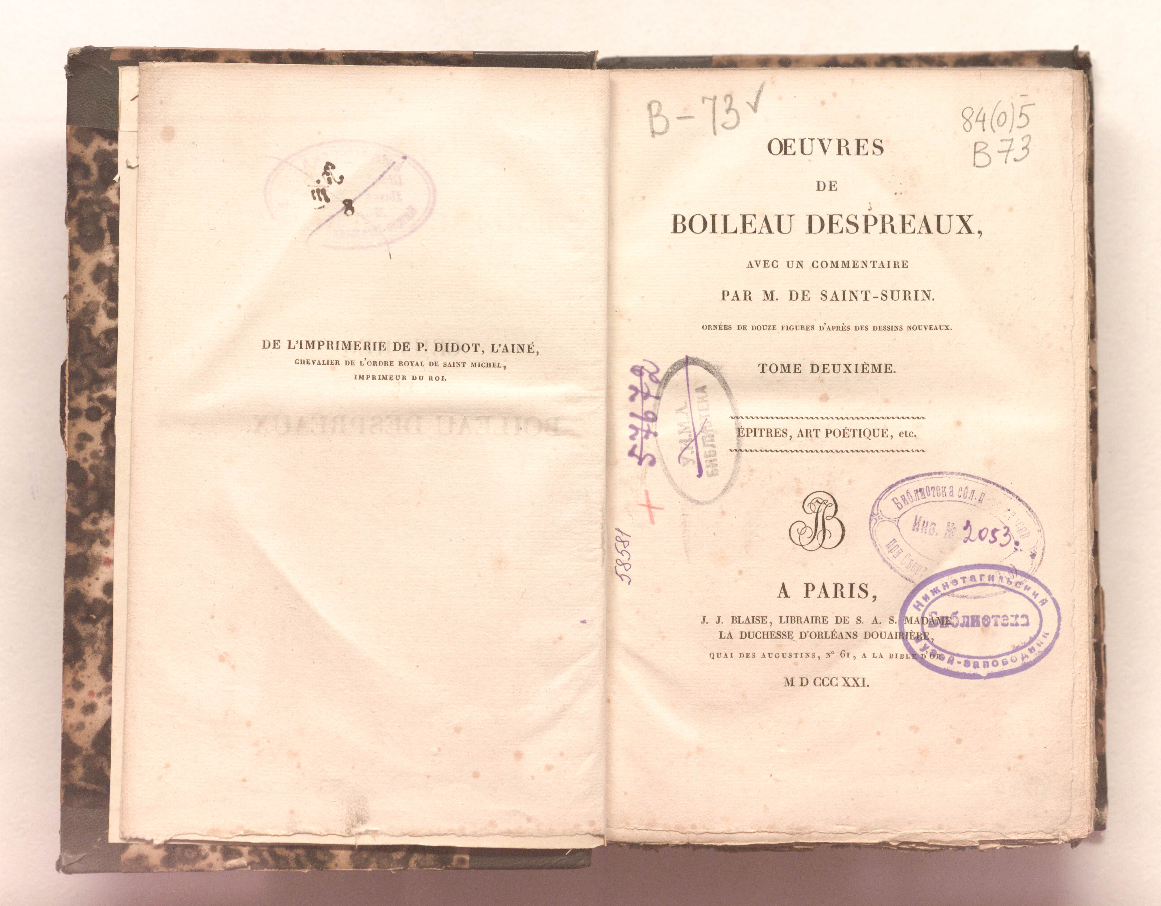 Oeuvres de Boileau Despreaux, avec un commentaire par M. de Saint-Surin...Tome deuxieme. Epitres, art poetique, etc. – 4 t. – T. 2. – Paris : J. J. Blaise, 1821. – 634 p. : 14 pl. ; 14,5х22 cm.