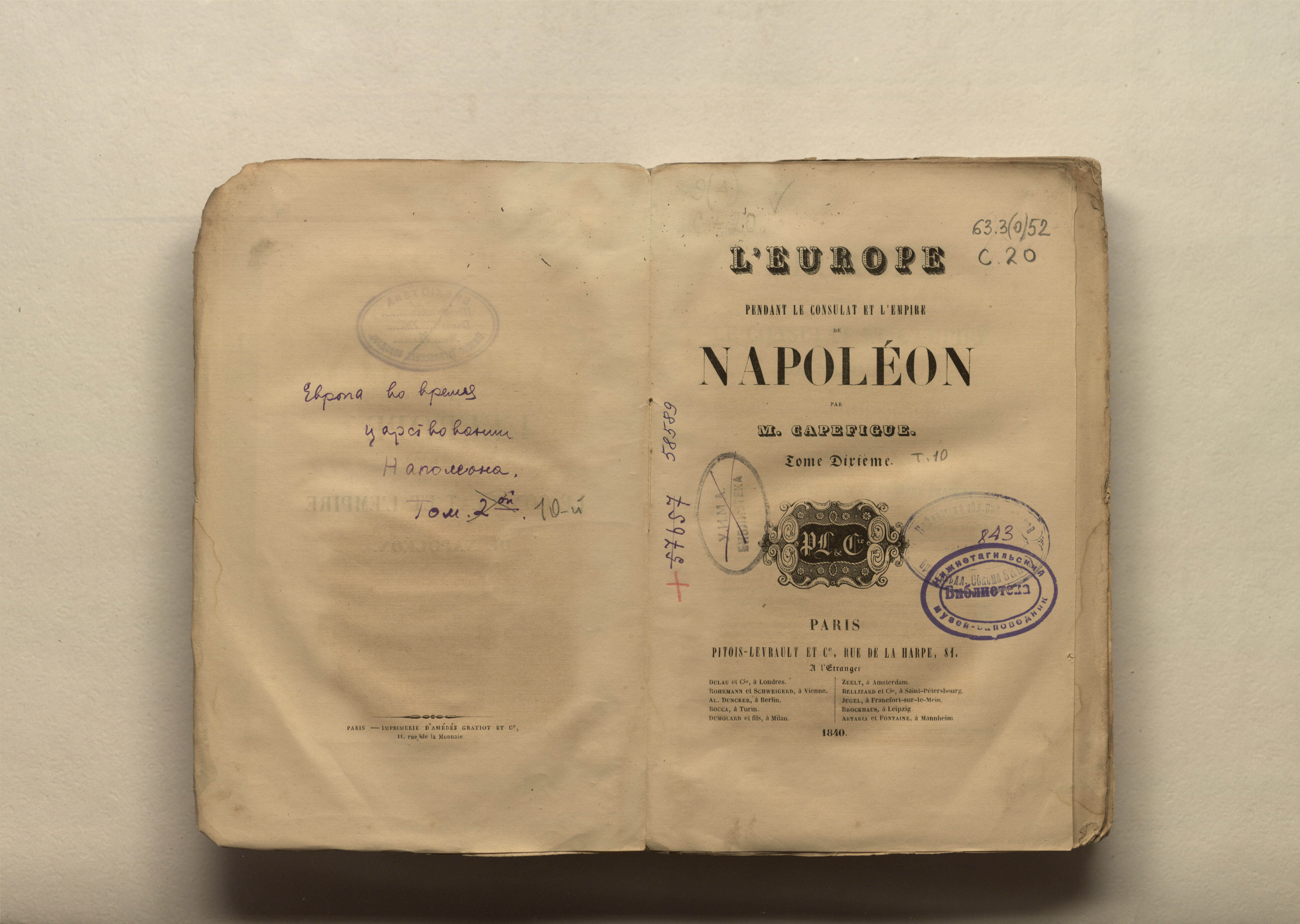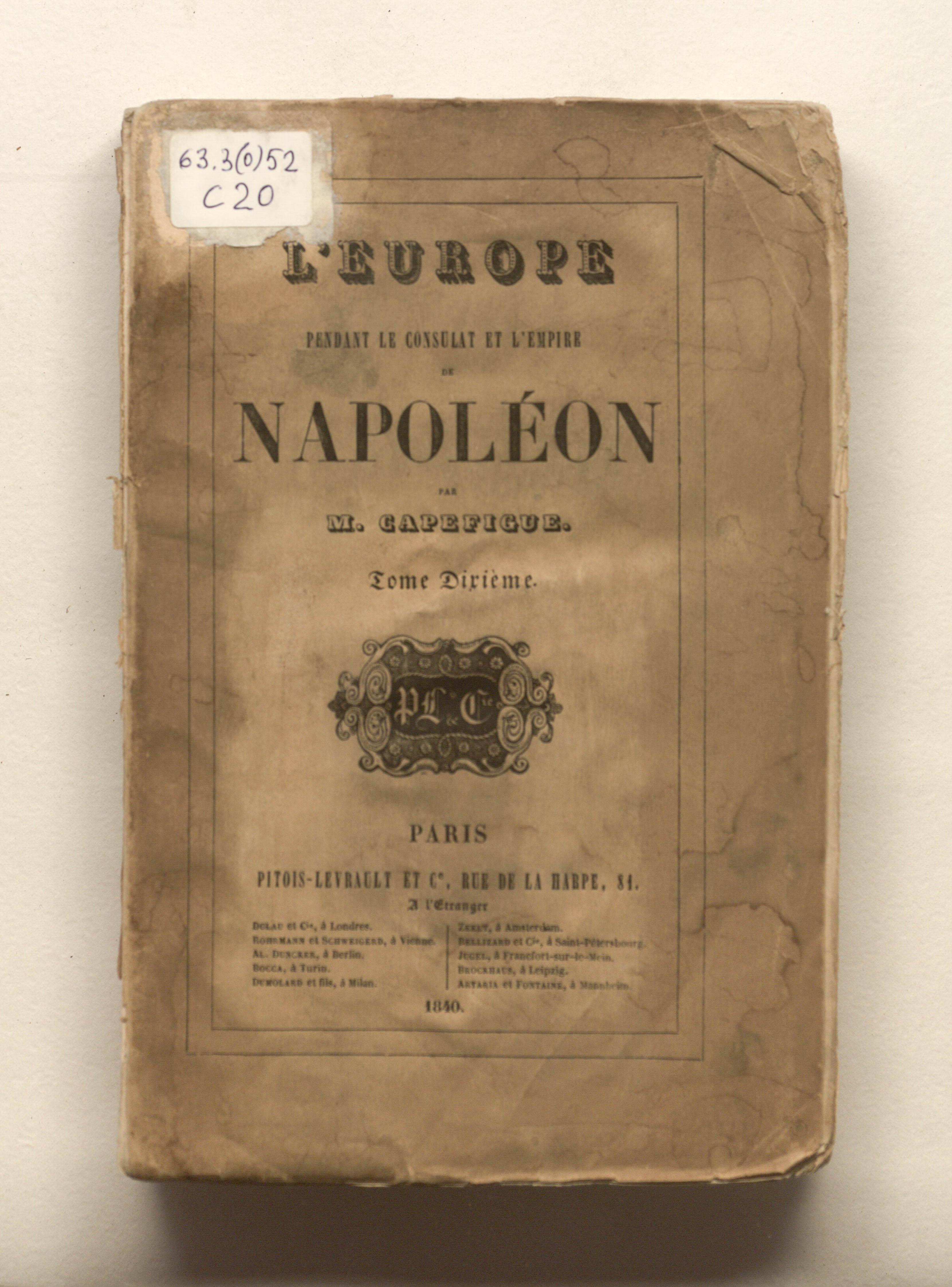 Capefigue, Jean-Baptiste (1801-1872). L'Europe pendant le Consulat et l'Empire de Napoleon, par M. Capefigue. Tome dixieme. - Paris : Pitois-Levrault et Cie, 1840. - 531 p. ; 15х23cm.