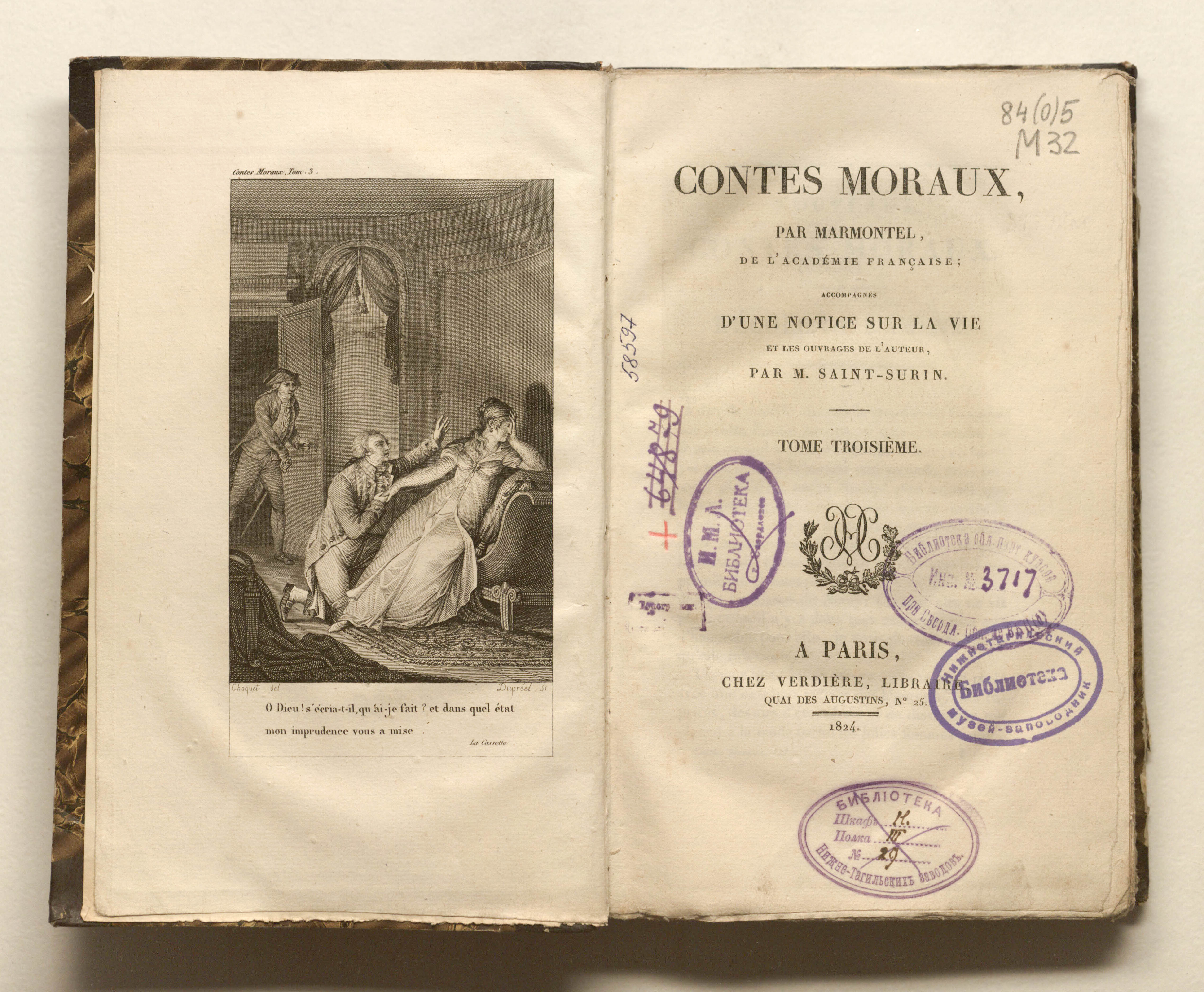 Contes moraux, par Marmontel, de L'Academie Francaise; accompagnes d'une notice sur la vie et les oeuvres de l'auteur par M. Saint-Surin. – 10 t. – T. 3. - Paris : Verdiere, 1824. - 353 p. : 1 pl. ; grav. front.; 14,5x22 cm.