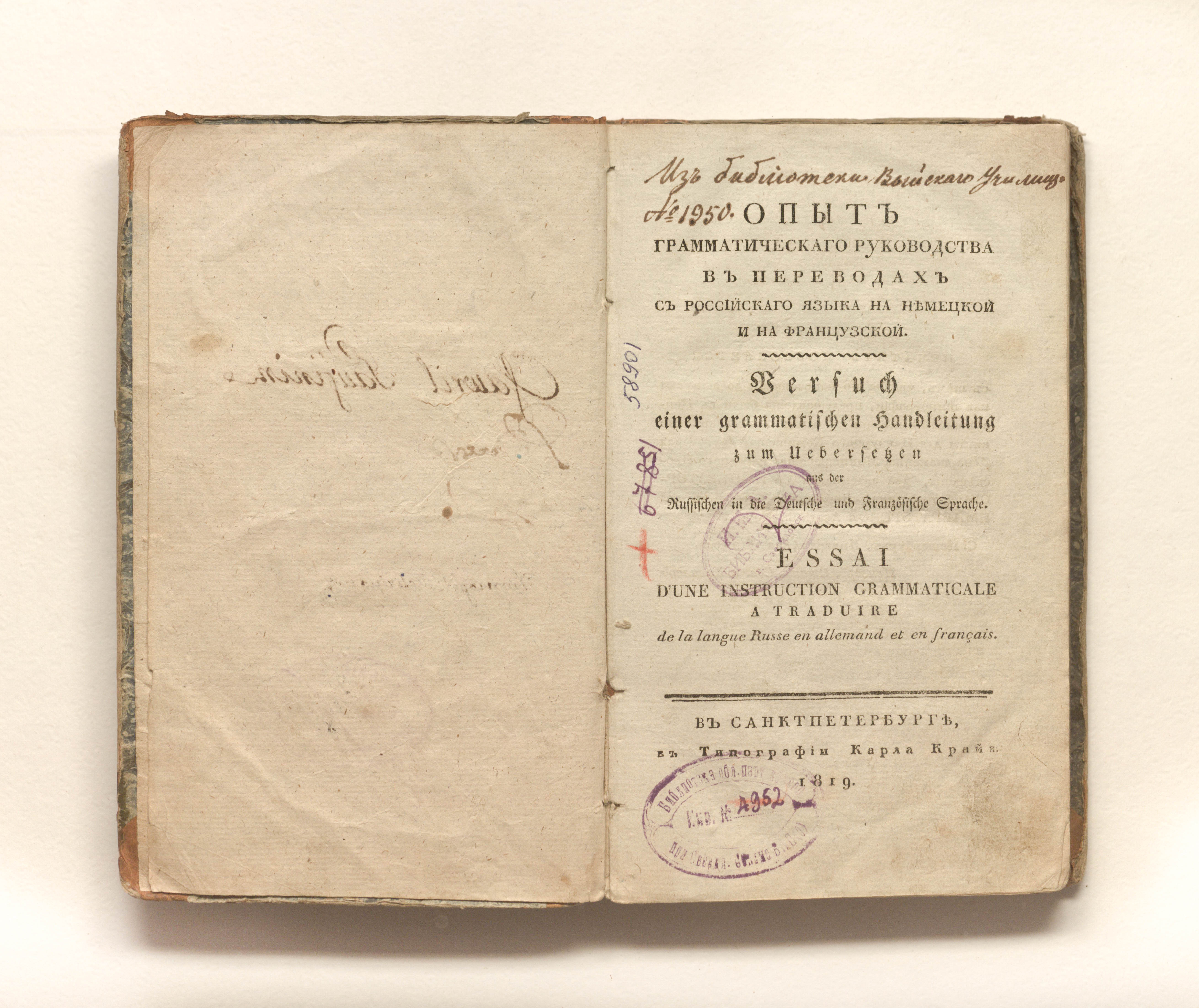 Шлейснер, Павел Христианович (ок. 1760-1838). Опыт грамматическаго руководства в переводах с российскаго языка на немецкой и на французской / П. Х. Шлейснер. — Санкт-Петербург : типография Карла Крайя, 1819. — 181,19 с. ; 1 л. табл. ; 21х12,5 см.