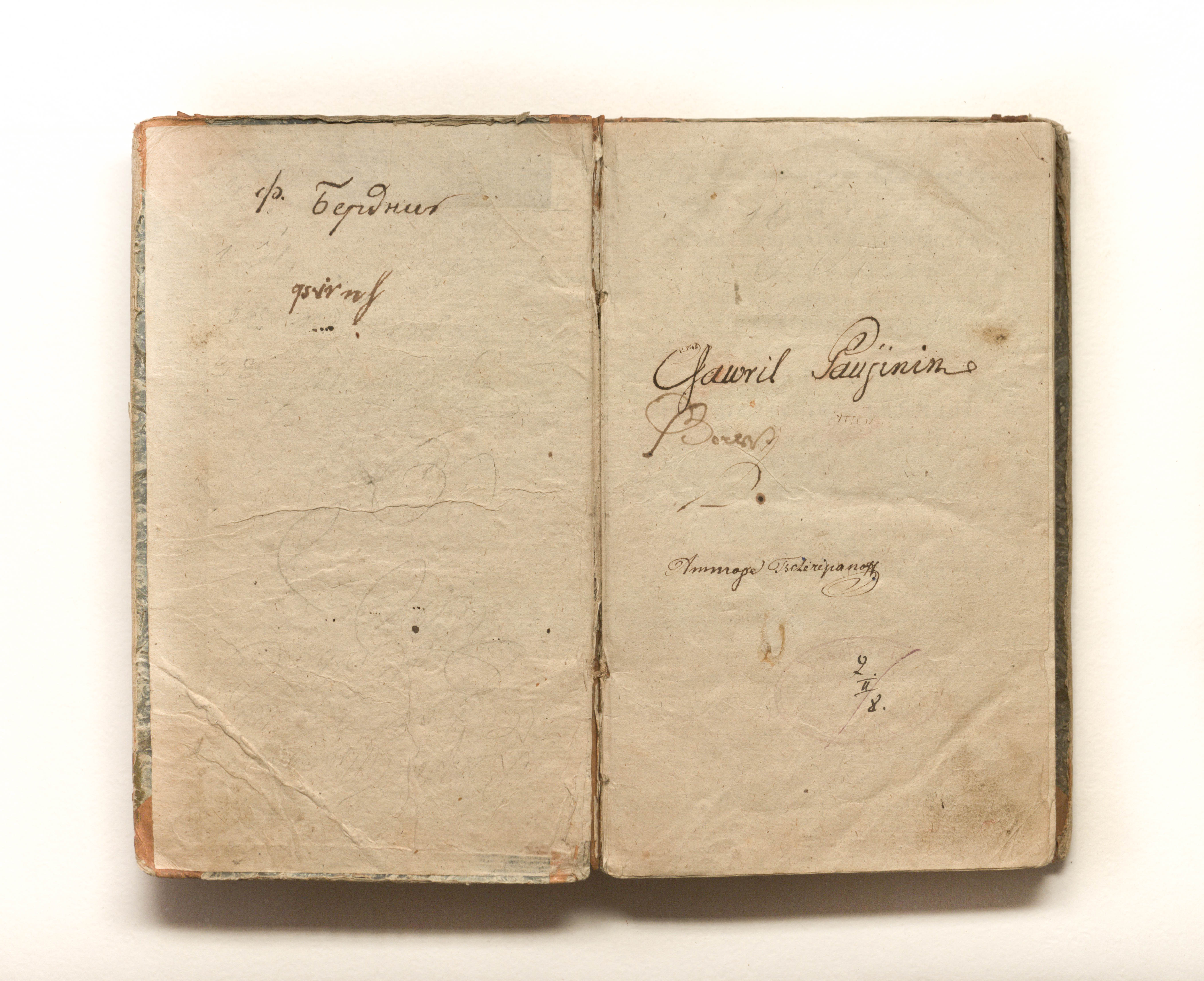 Книга в полукожаном владельческом переплете. Крышки переплета обтянуты бумагой с рисунком «под мрамор». Бумага верже.