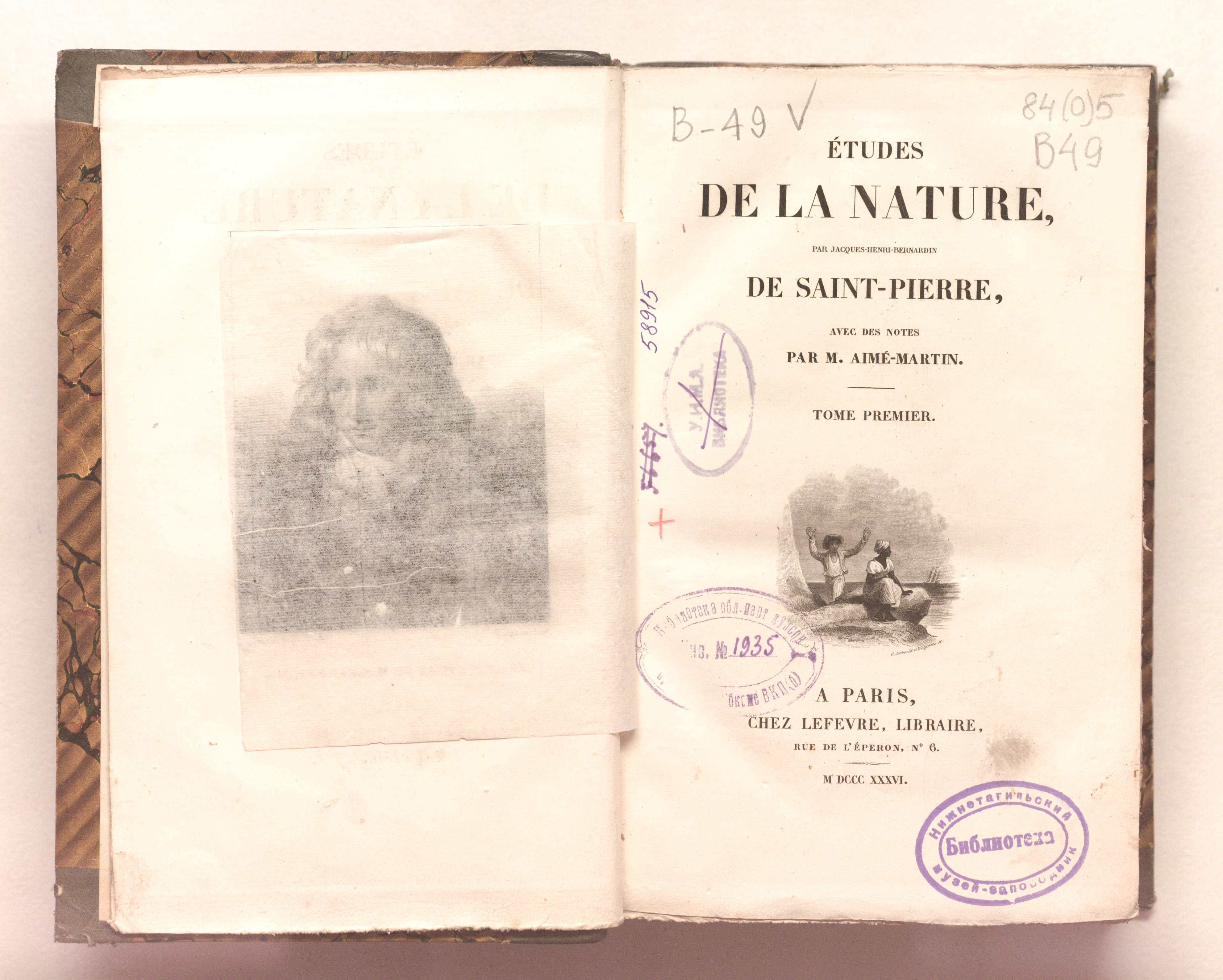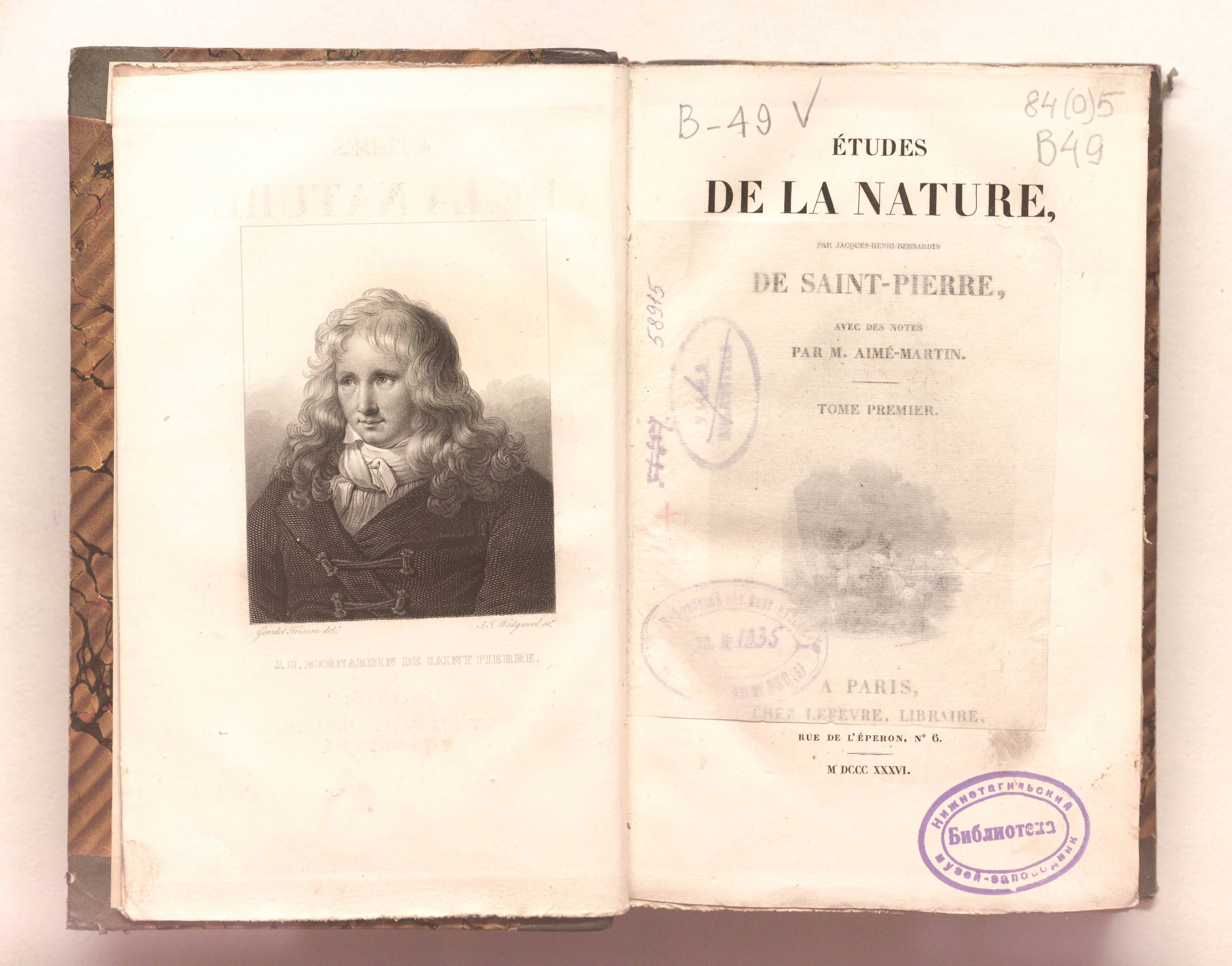 Etudes de la nature, par Jacques-Henri Bernardin de Saint-Pierre, avec des notes par M. Aime-Martin. Tome premier. – 2 t. – T. 1. – Paris : Lefevre, 1836. – XLVI, 656 p. : grav. front. (portr.). ; 14х23 cm.