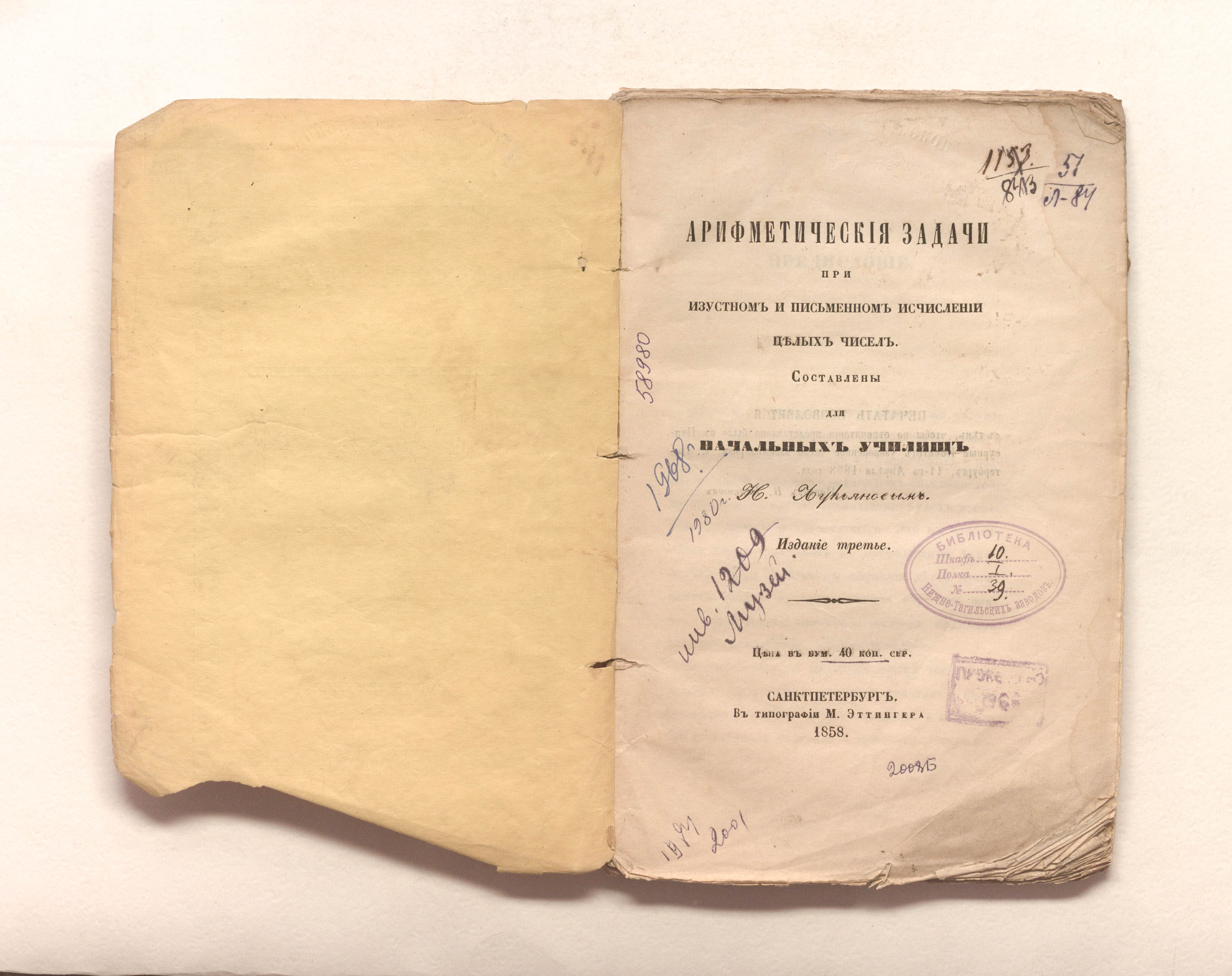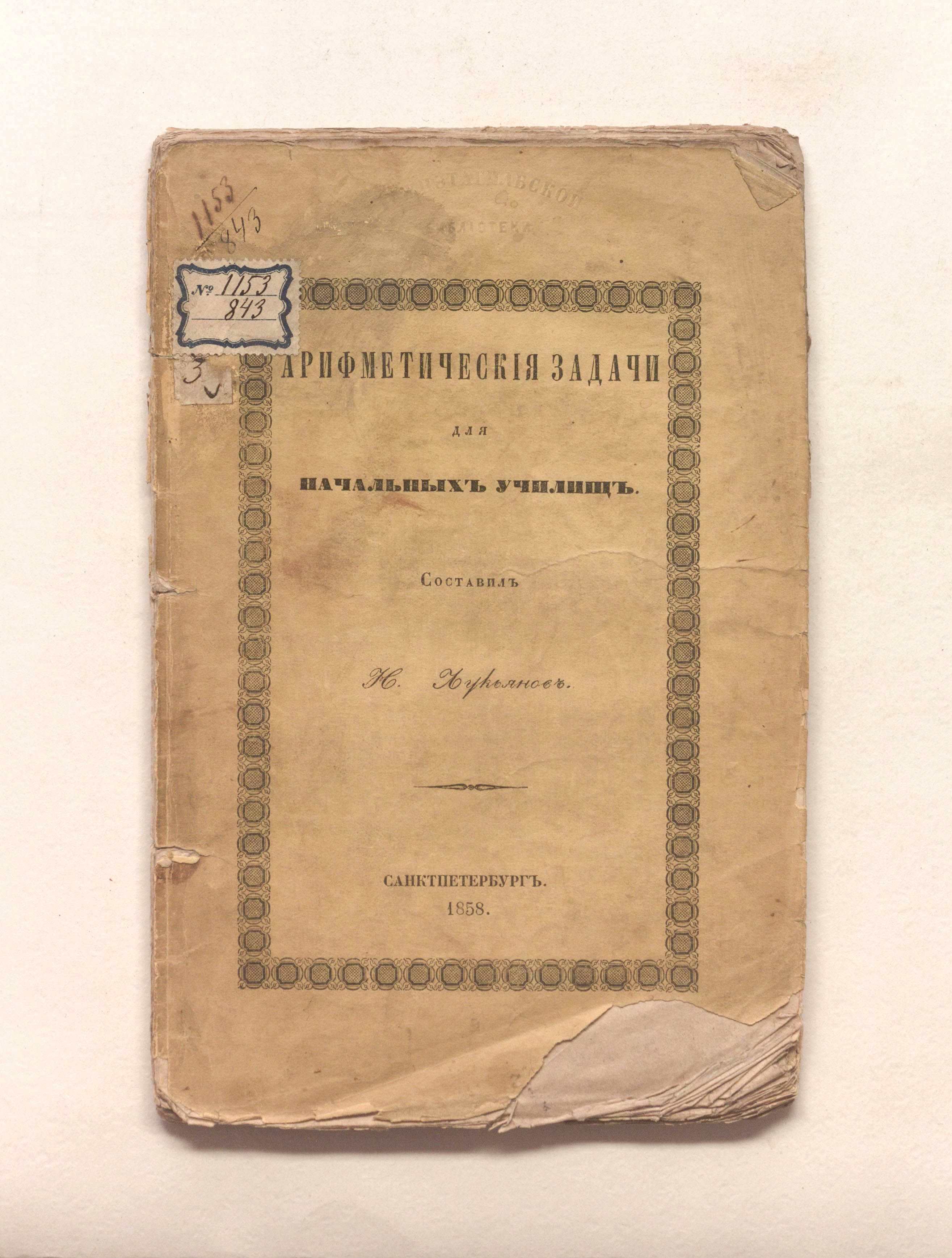 Лукьянов, Николай Лукьянович. Арифметические задачи при изустном и письменном исчислении целых чисел / сост. для первоначал. уч-щ Н. Лукьяновым. — 3-е изд. — Санкт-Петербург : тип. М. Эттингера, 1858. — [4], II, 112, 36 с. ; 23х15 см.