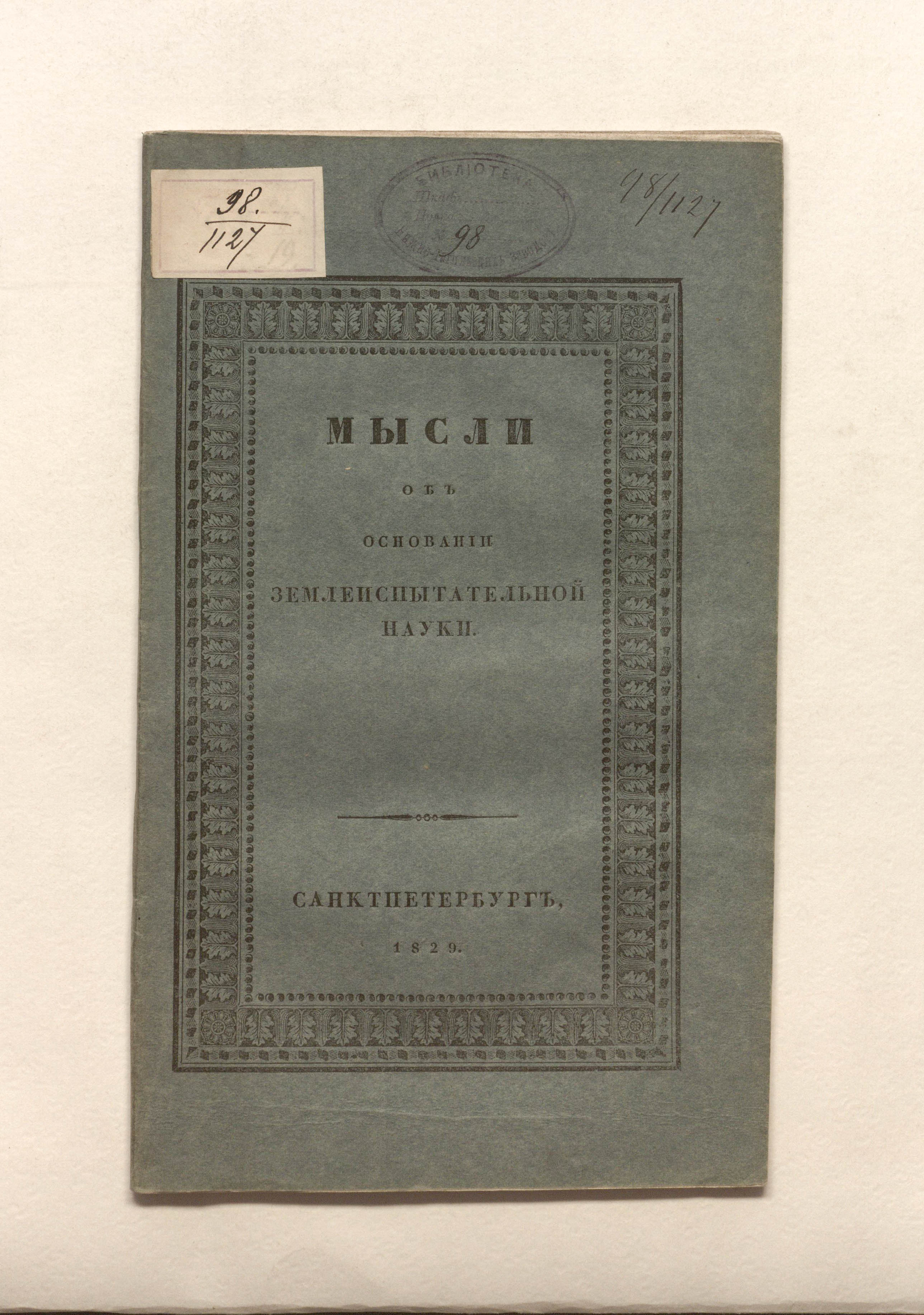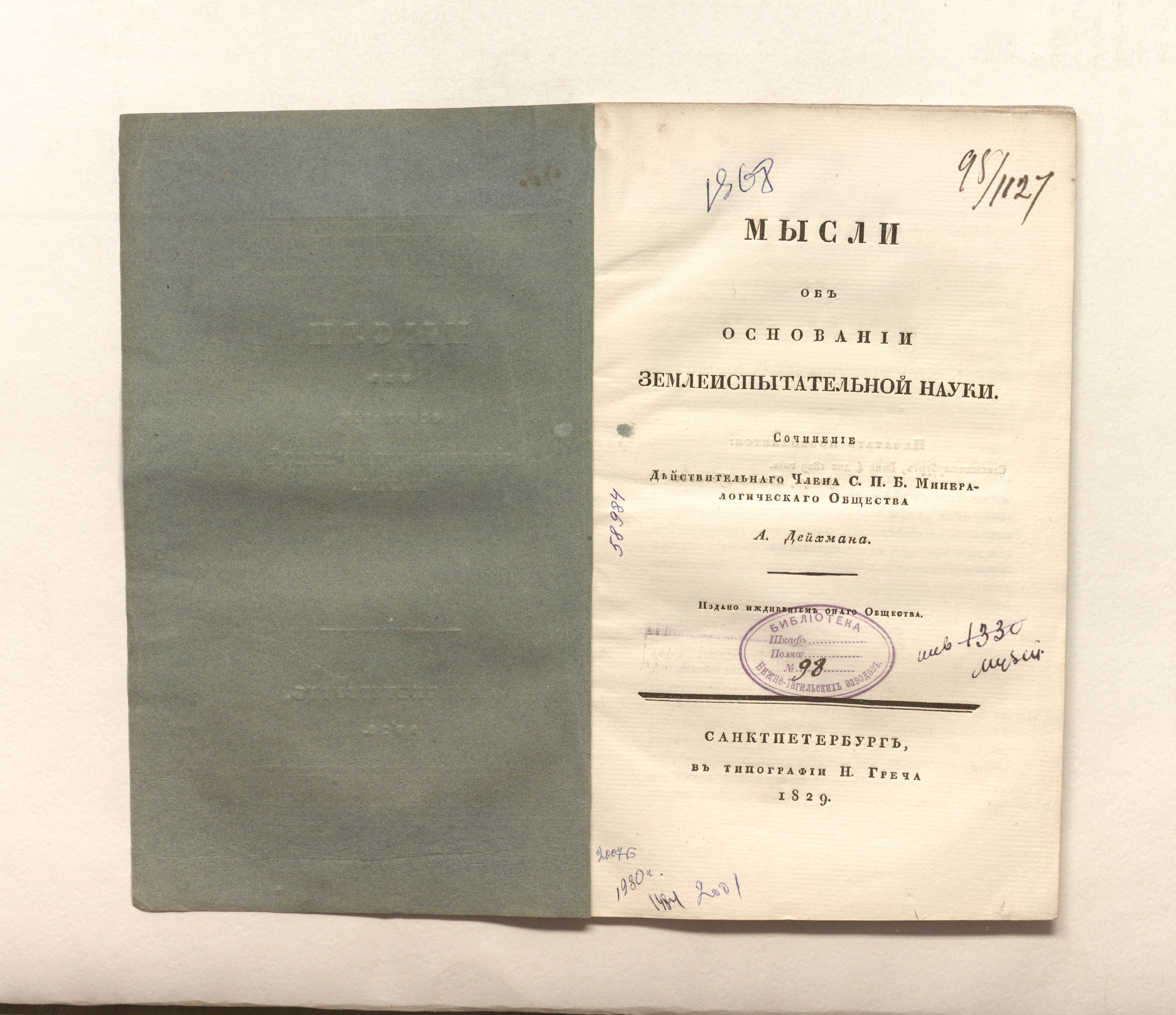 Дейхман, Александр Андреевич (1784- не ранее 1830). Мысли об основании землеиспытательной науки / соч. действ. чл. С. П. Б. минерал. о-ва А. Дейхмана ; изд. иждивением оного О-ва. – Санкт-Петербург : тип. Н. Греча, 1829. – 39 с. ; 24,5х14,5 см.