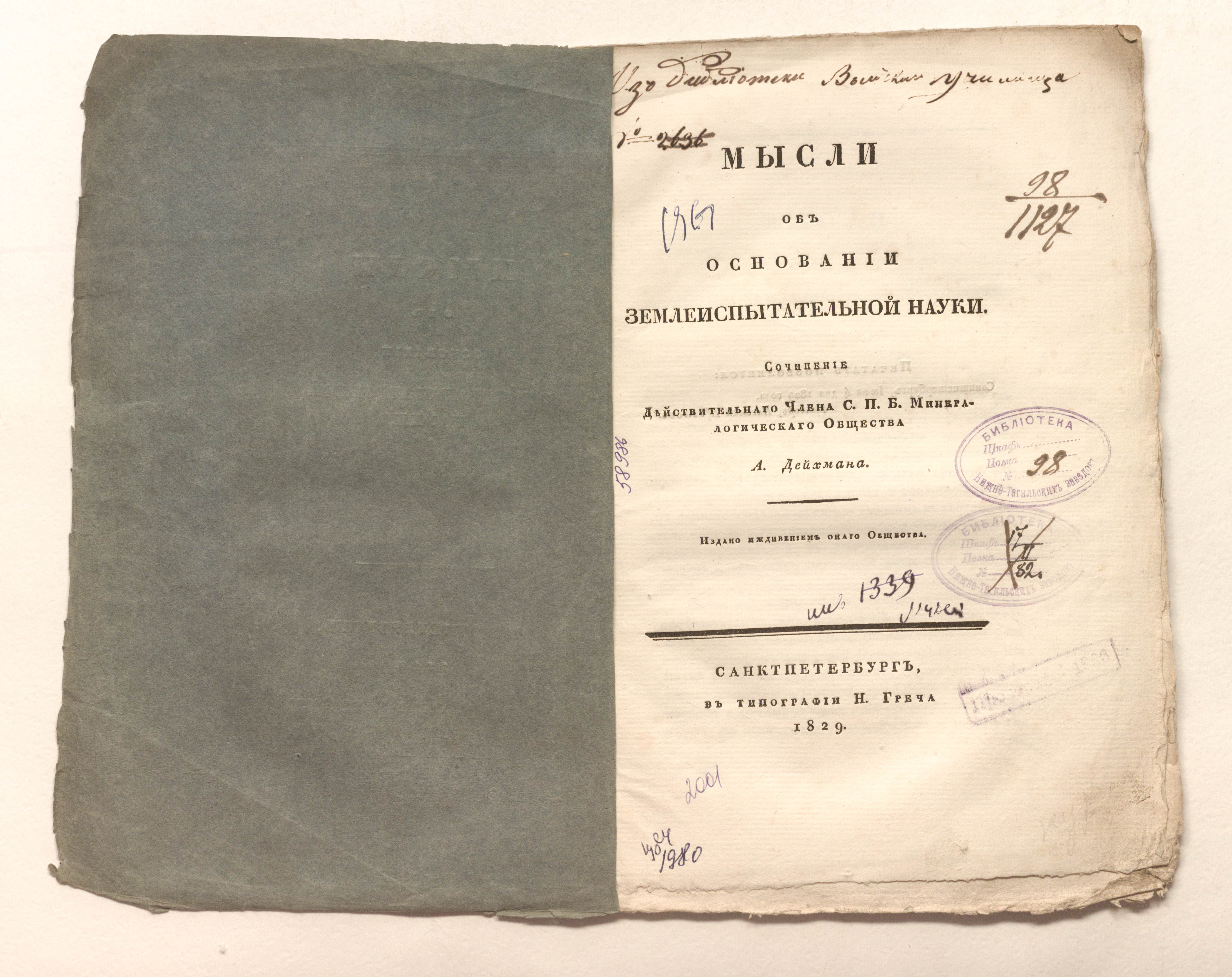 Дейхман, Александр Андреевич (1784- не ранее 1830). Мысли об основании землеиспытательной науки / соч. действ. чл. С. П. Б. минерал. о-ва А. Дейхмана ; изд. иждивением оного О-ва. – Санкт-Петербург : тип. Н. Греча, 1829. – 39 с. ; 26х17,5 см.