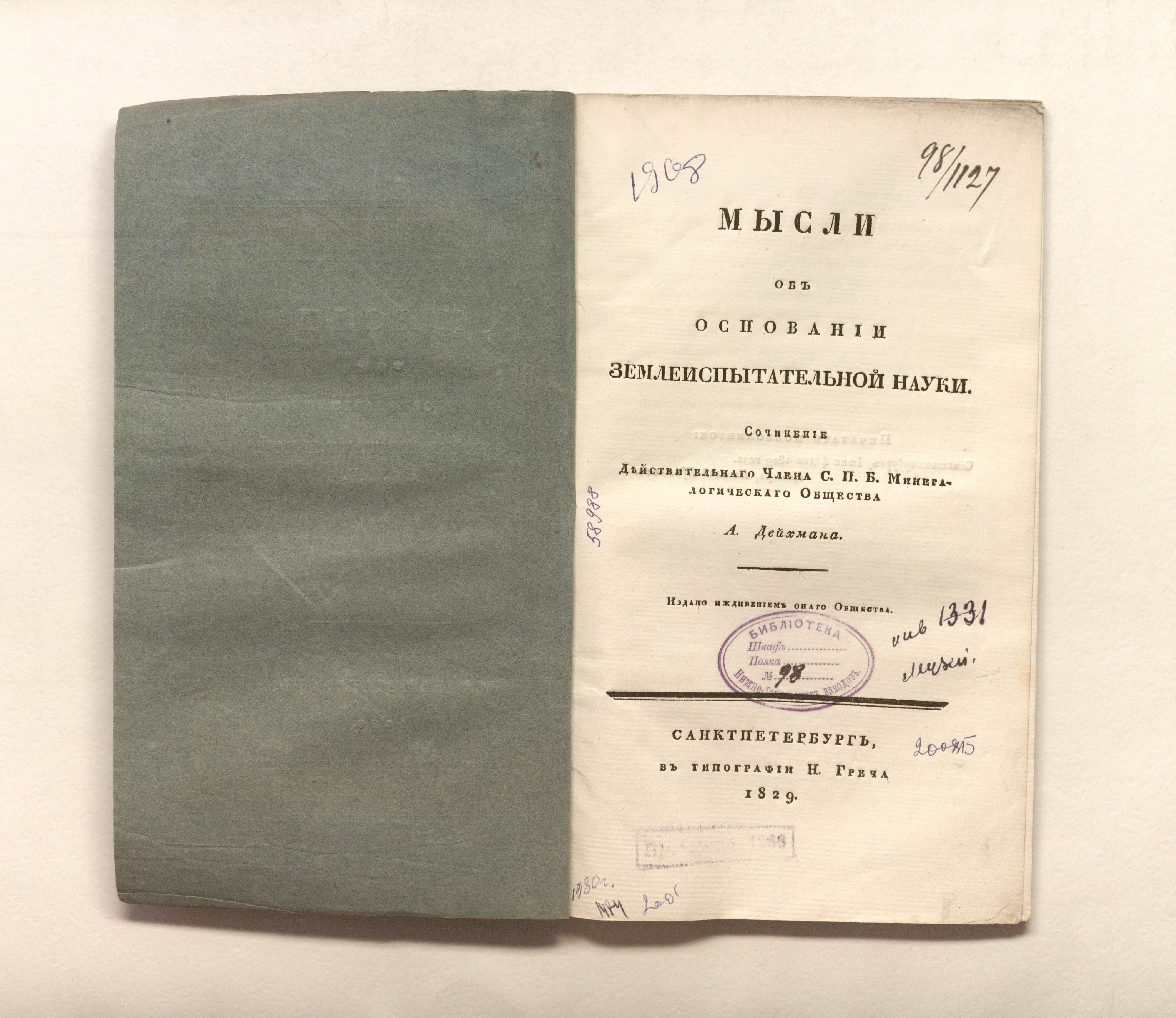 Дейхман, Александр Андреевич (1784- не ранее 1830). Мысли об основании землеиспытательной науки / соч. действ. чл. С. П. Б. минерал. о-ва А. Дейхмана ; изд. иждивением оного О-ва. – Санкт-Петербург : тип. Н. Греча, 1829. – 39 с. ; 24,5х14,5 см.