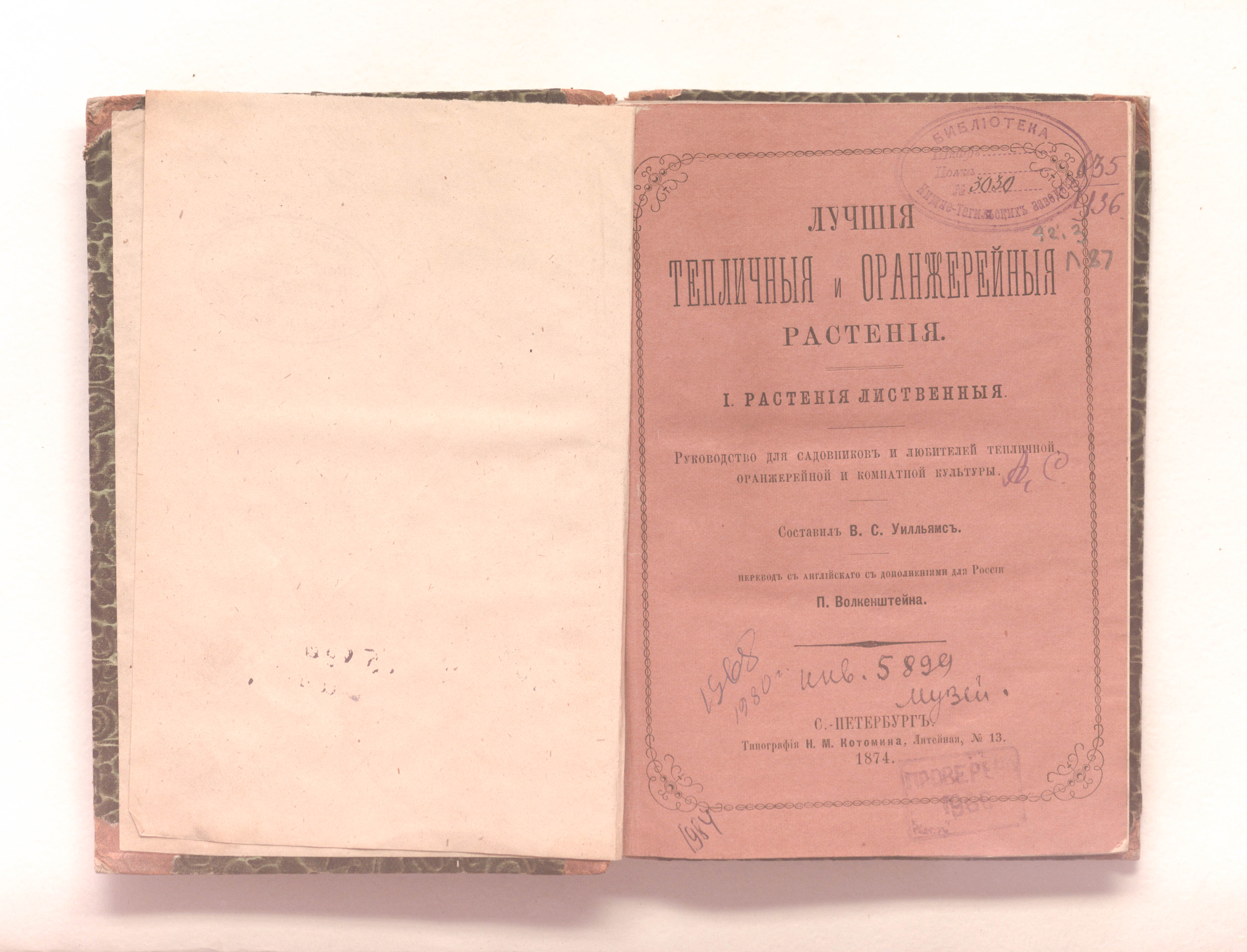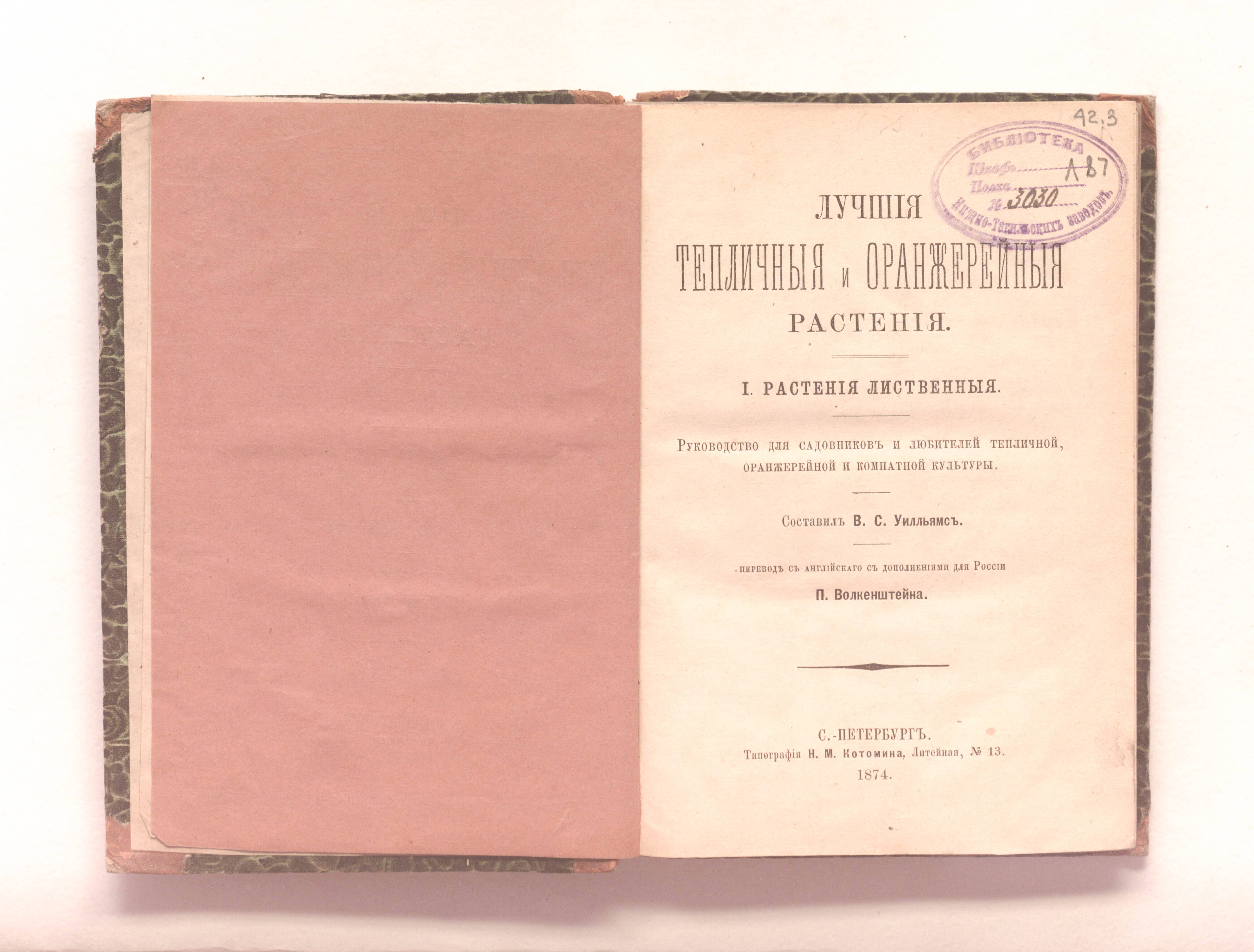 Лучшие тепличные и оранжерейные растения. Раздел 1. Растения лекарственные : руководство для садовников и любителей тепличной, оранжерейной и комнатной культуры / сост. В. С. Уилльямс; пер. с англ. Волкенштейна. — Санкт-Петербург : Типография Н. М. Котомина, 1874. — 284 с. ; 18х12,5 см.