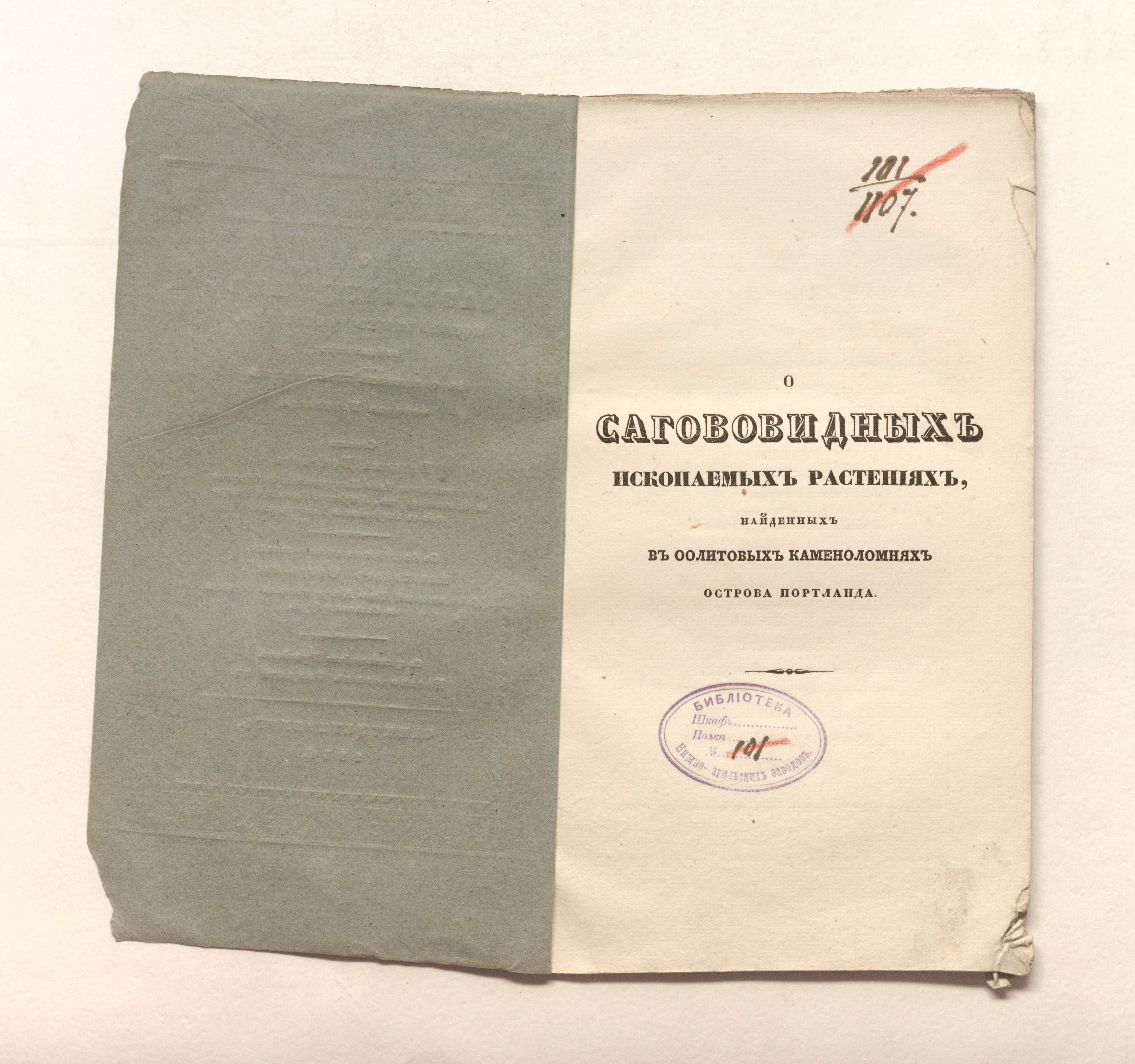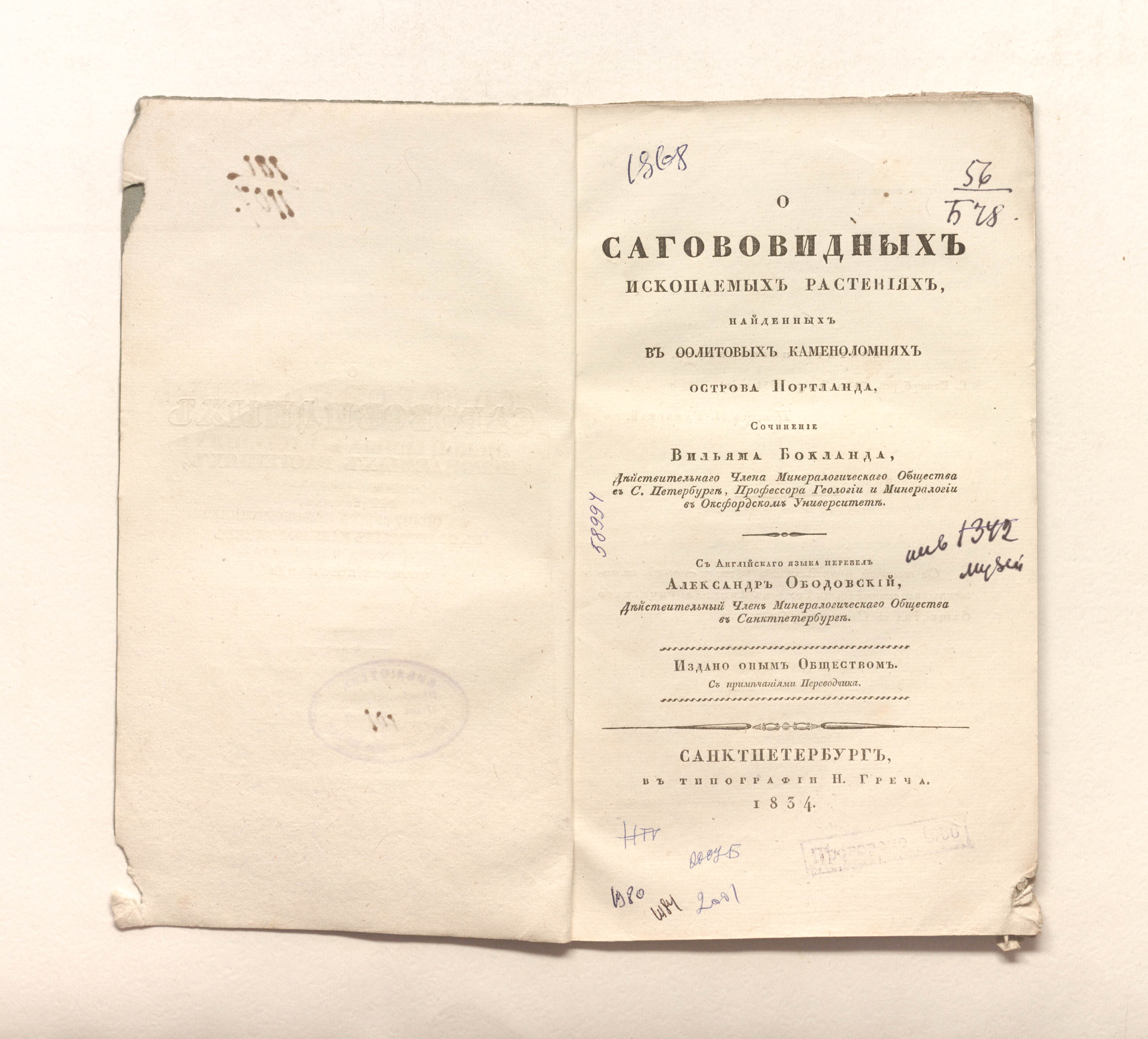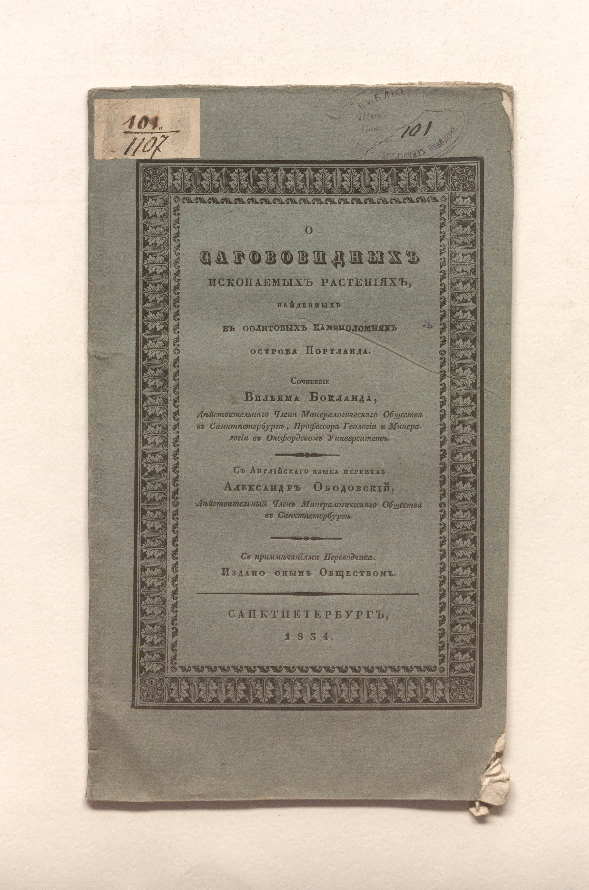 Бокланд, Вильям. О сагововидных ископаемых растениях, найденных в оолитовых каменоломнях острова Портланда / соч. Вильяма Бокланда, д. чл. Минерал. о-ва в С.-Петербурге, проф. геологии и минералогии в Оксфорд. ун-те ; с англ. яз. пер. Александр Ободовский, д. чл. Минерал. о-ва в Санкт-Петербурге ; изд. оным О-вом с примеч. переводчика. – Санкт-Петербург : тип. Н. Греча, 1834. – 23, [1] с. : 4 л. ил. ; 24,5х14,5 см.