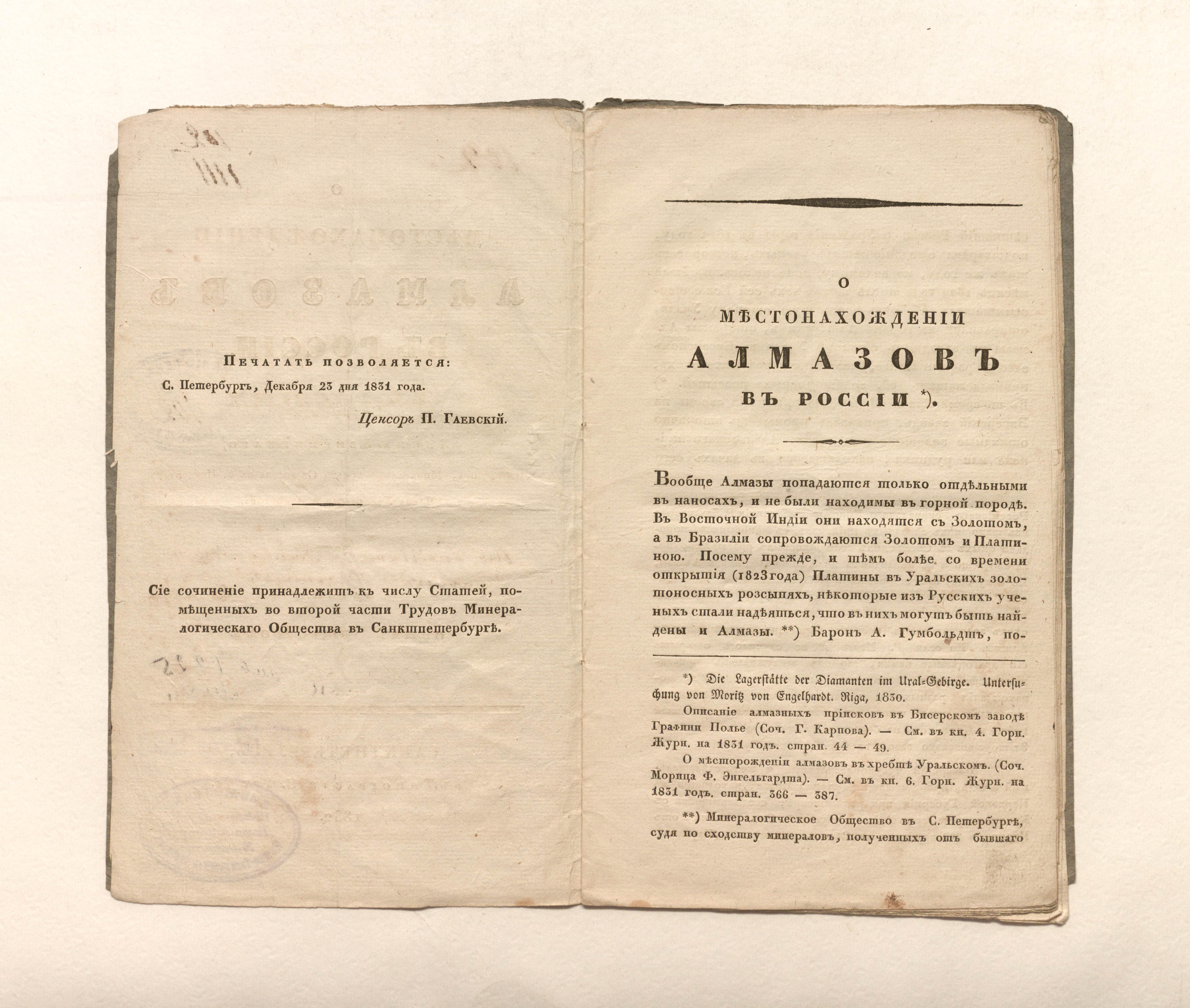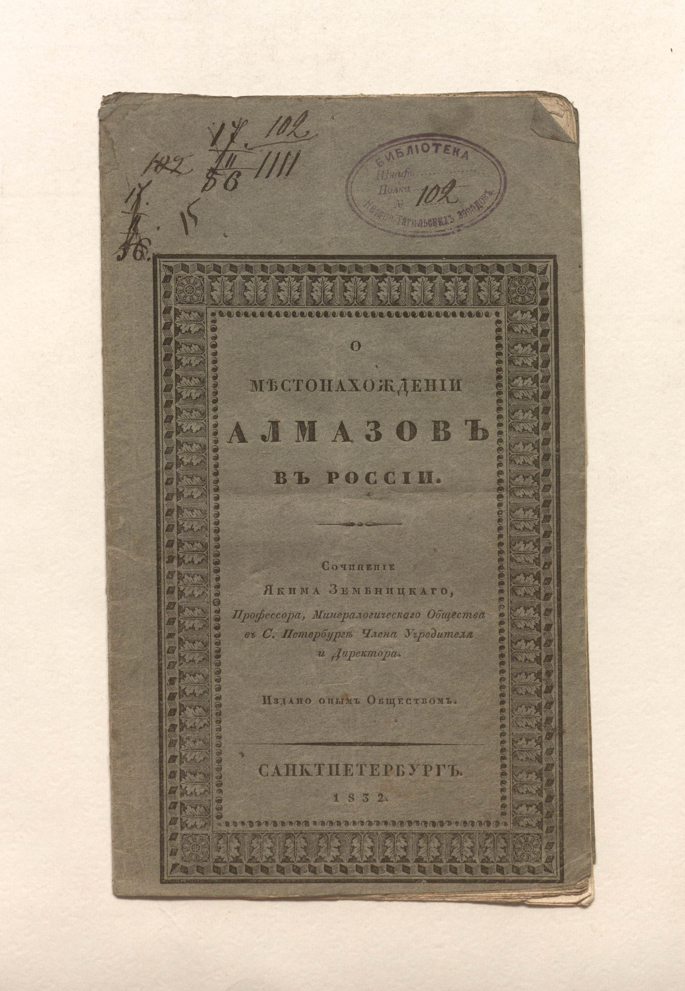 Зембницкий, Я. Г. (1784-1851). О местонахождении алмазов в России / соч. Я. Зембницкого, проф., Минерал. о-ва в С.-Петербурге члена учредителя и директора. ; изд. оным О-вом. – Санкт-Петербург : тип. Н. Греча, 1832. – 16 с. ; 23х13,7 см.