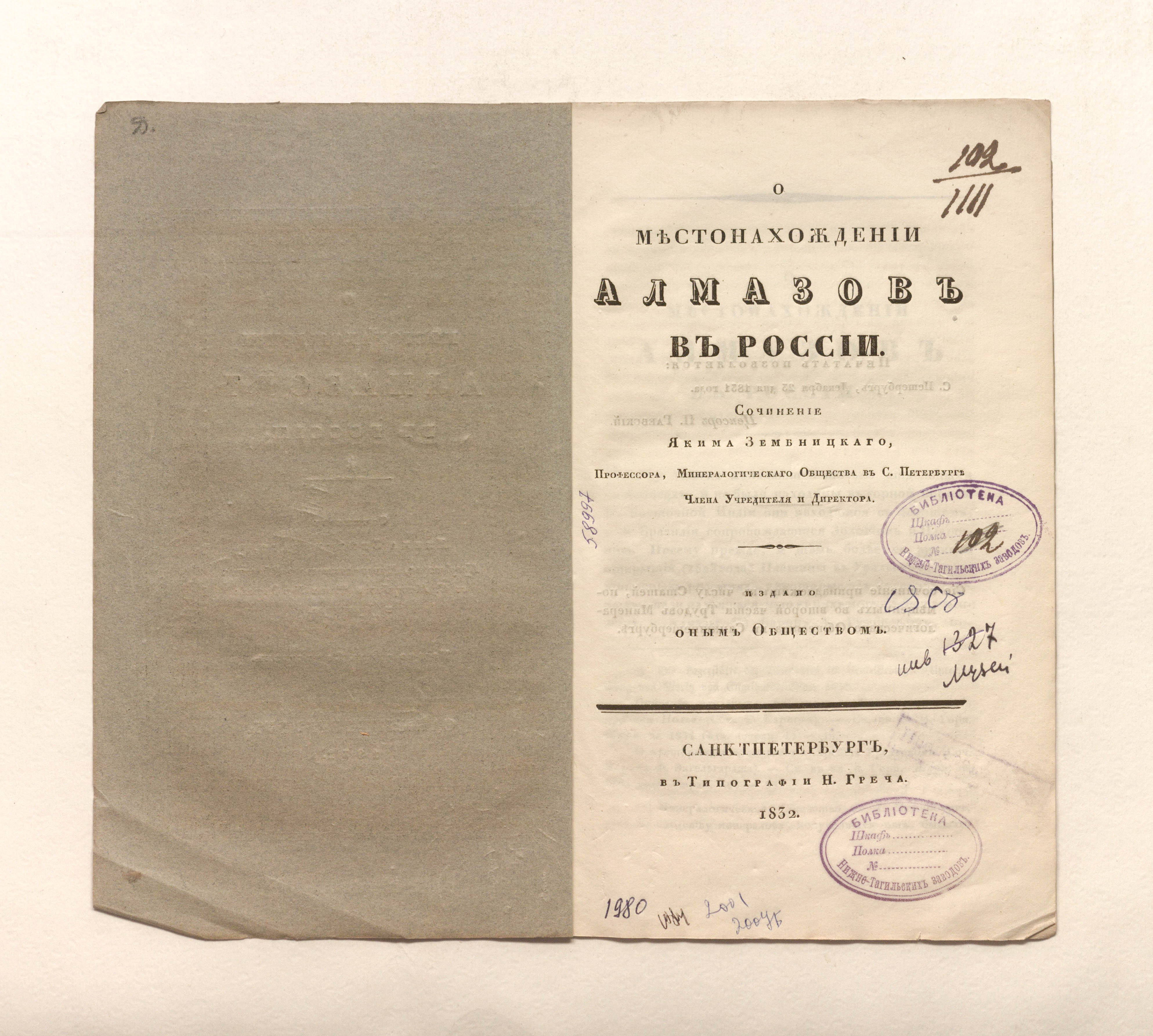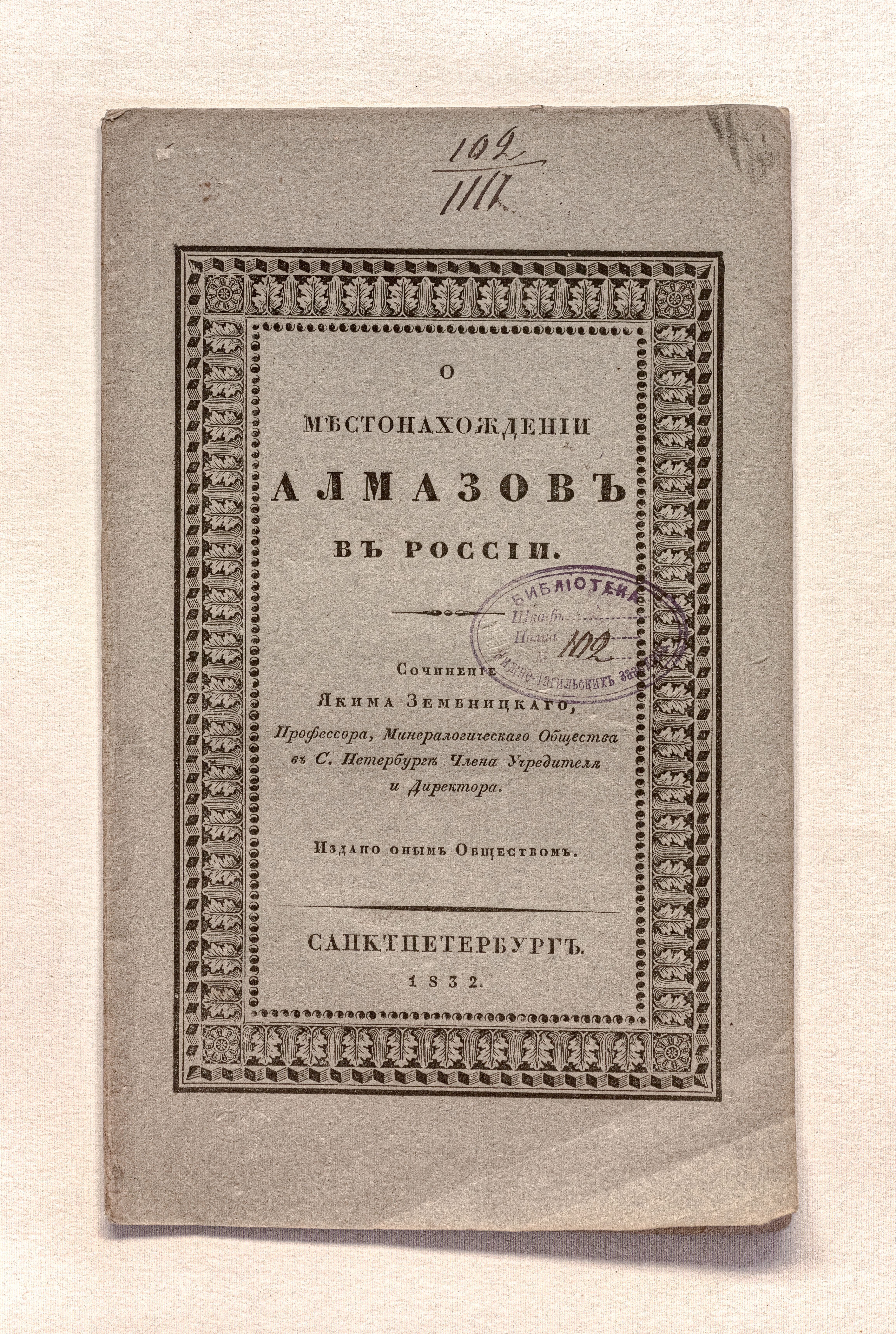 Зембницкий, Я. Г. (1784-1851). О местонахождении алмазов в России / соч. Я. Зембницкого, проф., Минерал. о-ва в С.-Петербурге члена учредителя и директора. ; изд. оным О-вом. – Санкт-Петербург : тип. Н. Греча, 1832. – 16 с. ; 24х14,7 см.