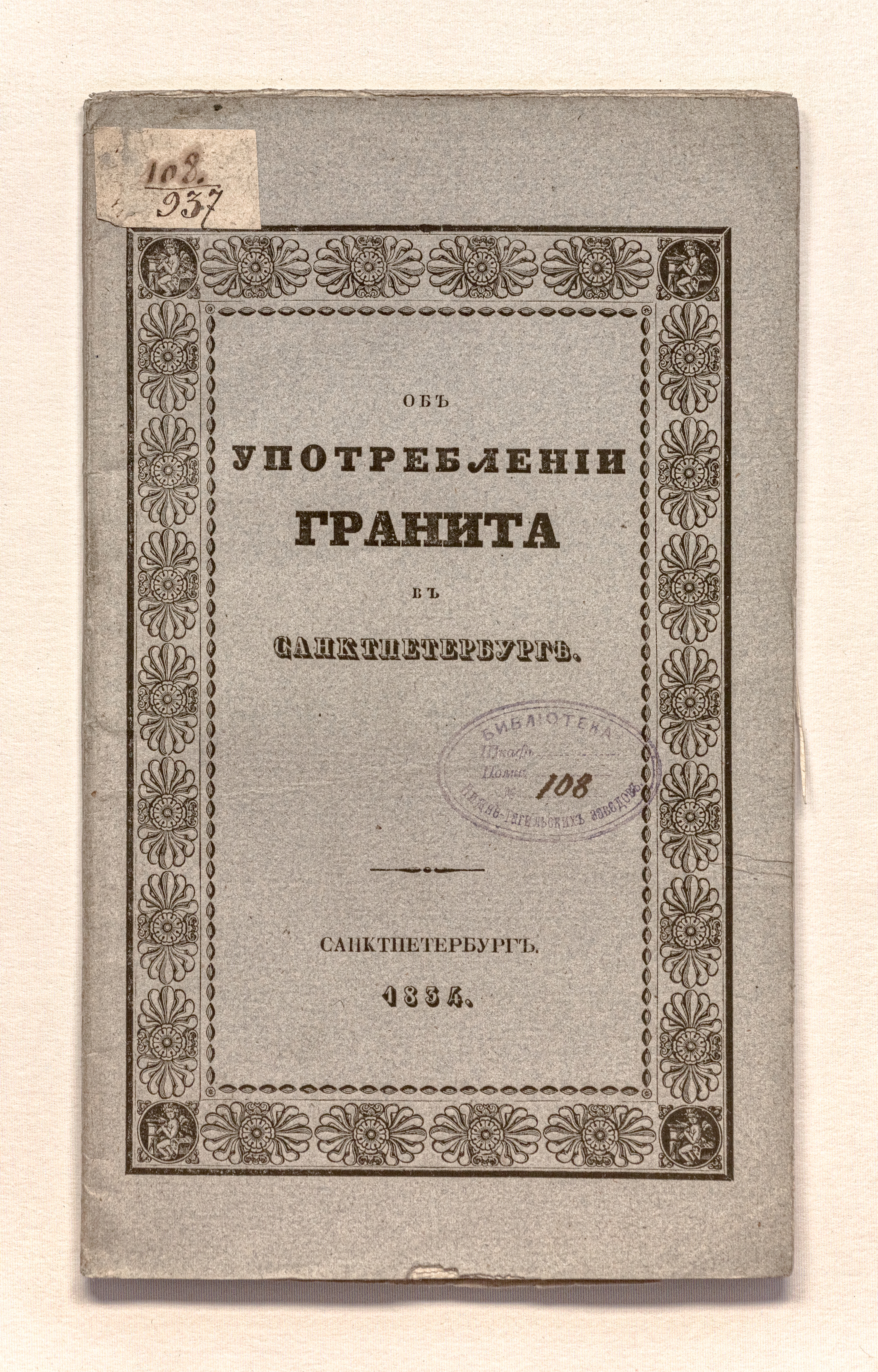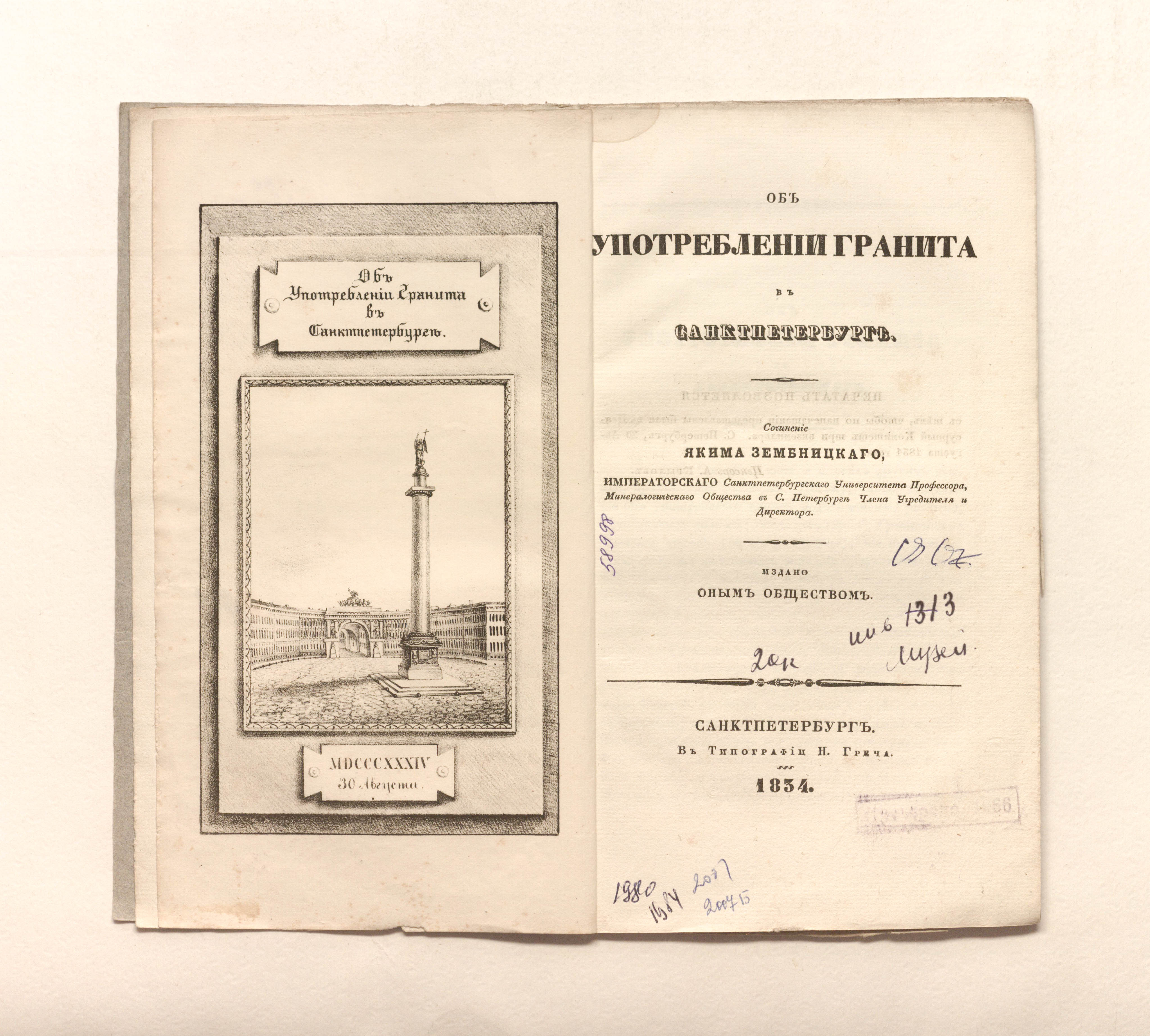 Зембницкий, Я. Г. (1784-1851). Об употреблении гранита в Санктпетербурге / соч. Я. Зембницкого, Имп. Санктпетерб ун-та проф., Минерал. о-ва в С.-Петербурге члена учредителя и директора ; Изд. оным О-вом – Санкт-Петербург : тип. Н. Греча, 1834. – [2], 28 с. : 1 л. грав., 1 л. ил. ; 24,5х14,5 см.