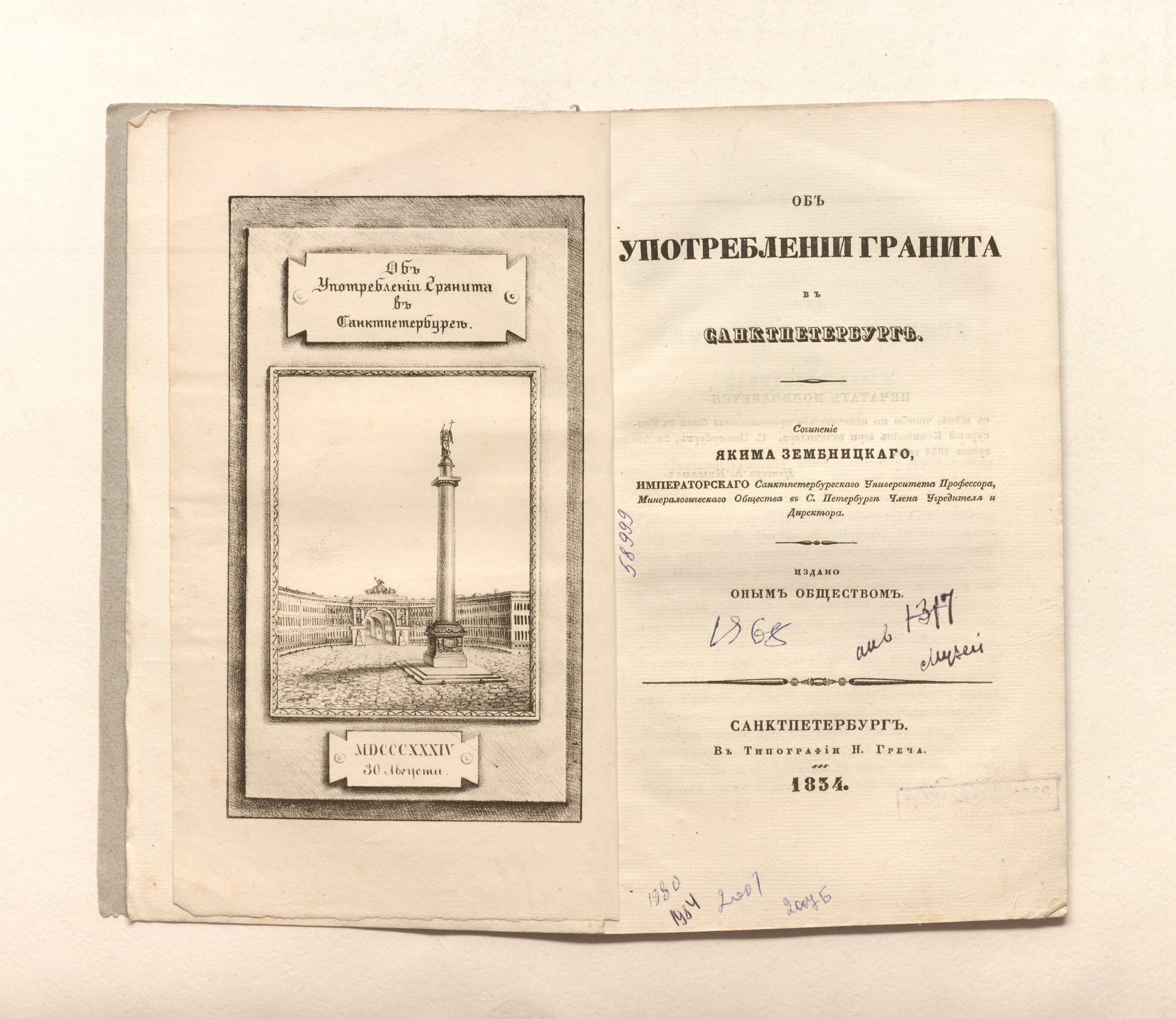 Зембницкий, Я. Г. (1784-1851). Об употреблении гранита в Санктпетербурге / соч. Я. Зембницкого, Имп. Санктпетерб ун-та проф., Минерал. о-ва в С.-Петербурге члена учредителя и директора ; Изд. оным О-вом – Санкт-Петербург : тип. Н. Греча, 1834. – [2], 28 с. : 1 л. грав., 1 л. ил. ; 24,5х14,5 см.