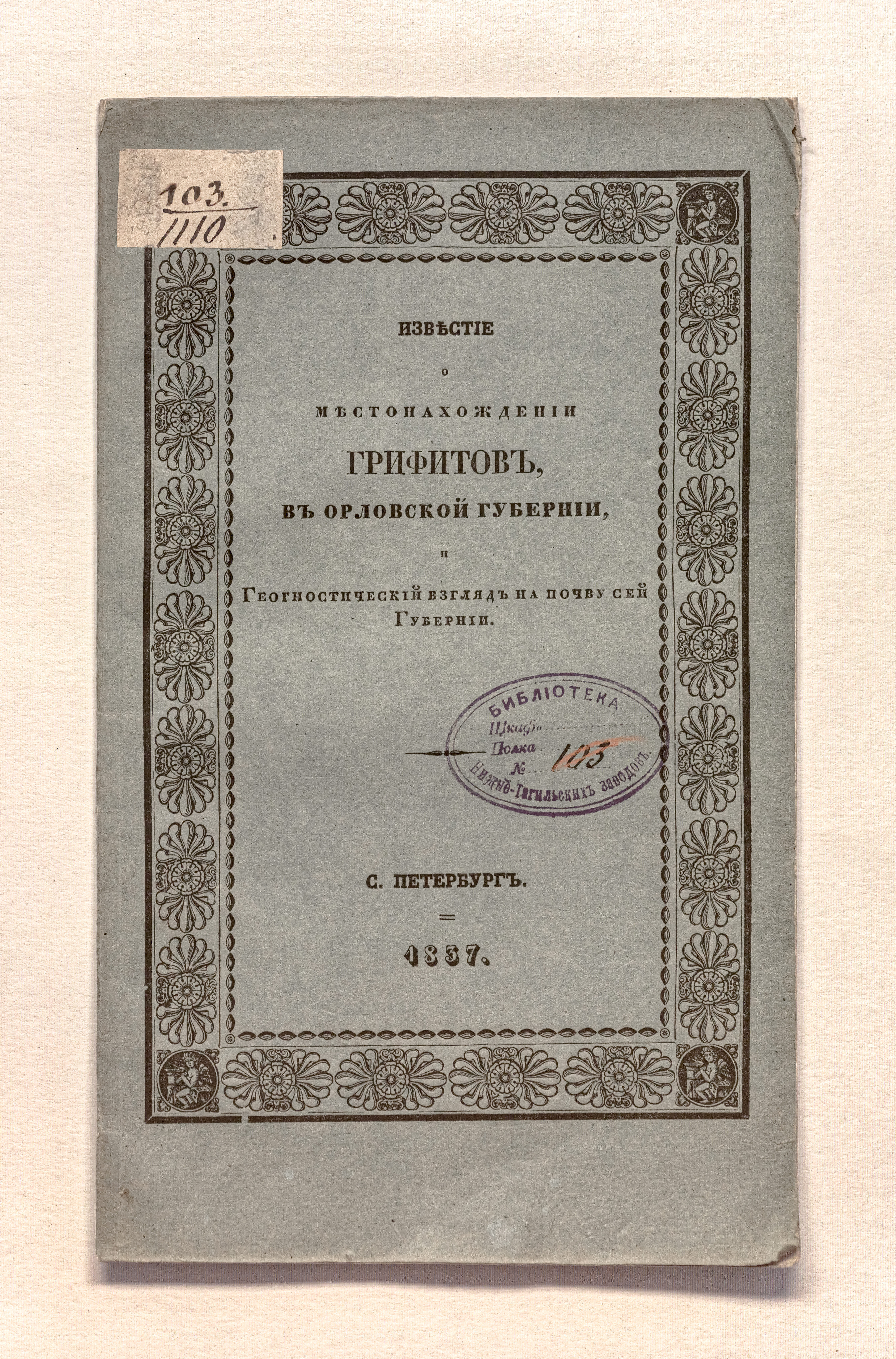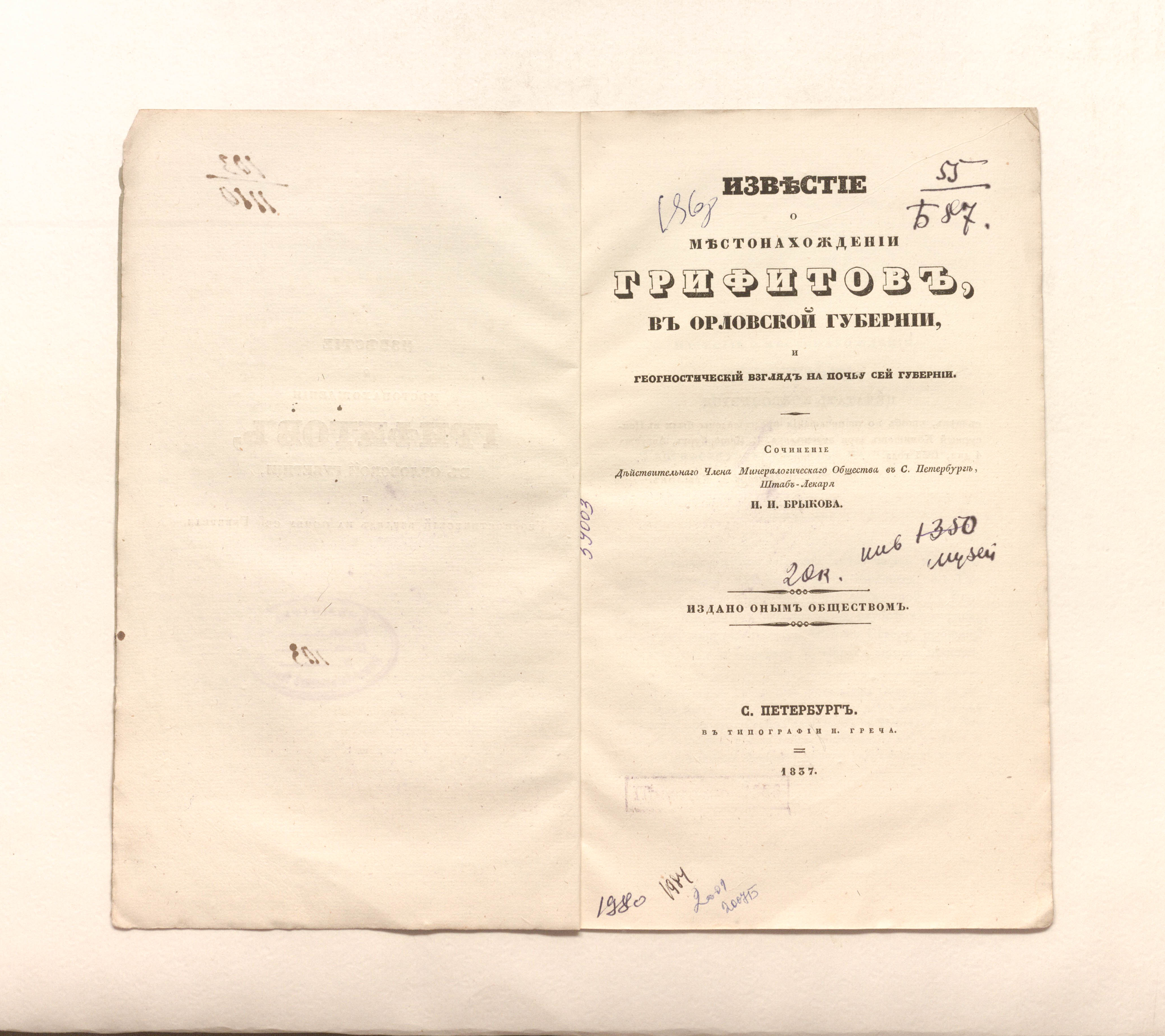 Брыков, И. И. (1795-1870). Известие о местонахождении грифитов в Орловской губернии и геогностический взгляд на почву этой губернии / соч. д. чл. Минерал. о-ва Спб., штаб-лекаря И. И. Брыкова – Санкт-Петербург : тип. Н. Греча, 1837. – 11 с. : 1 л. ил. ; 24х14,5 см.