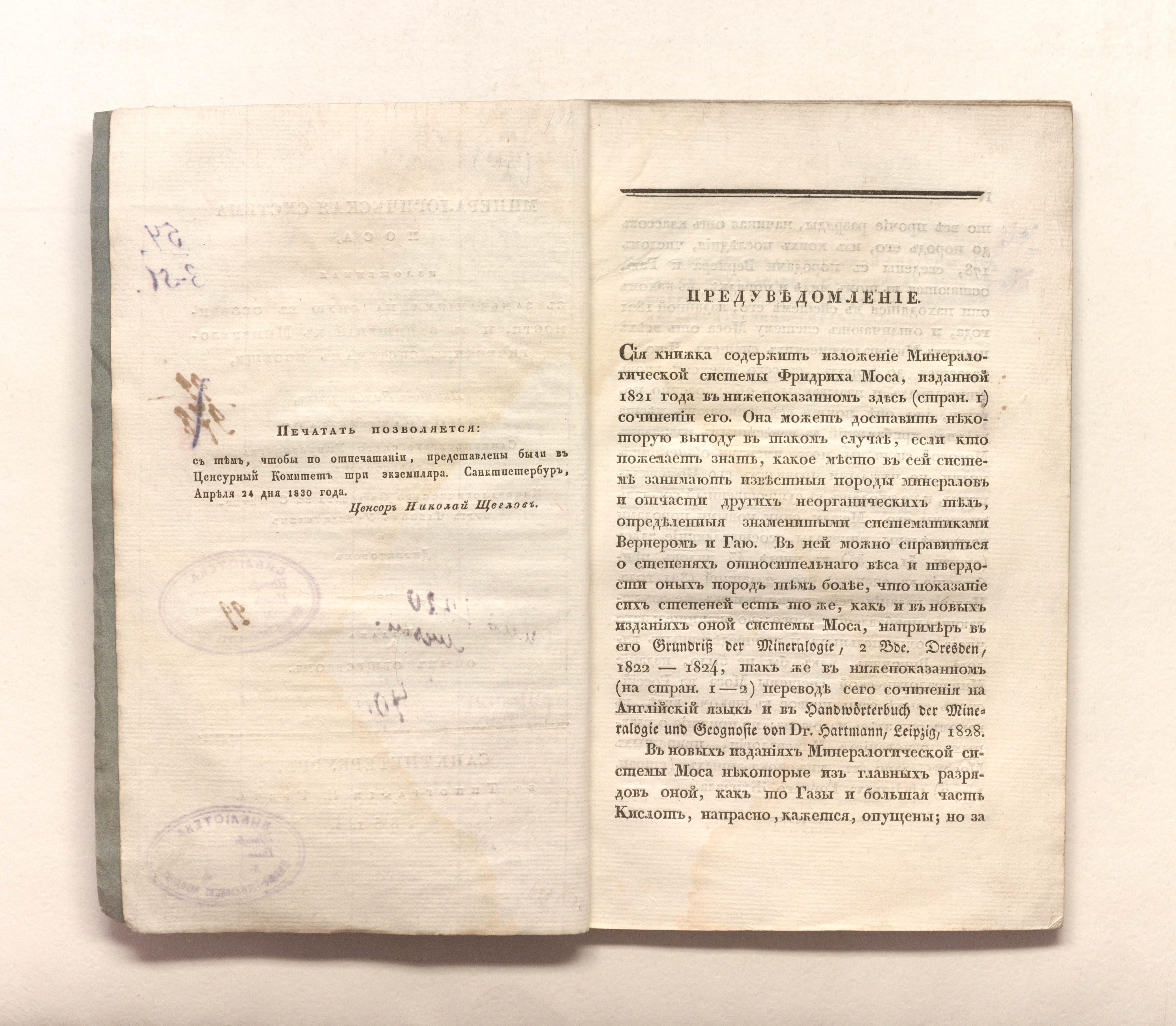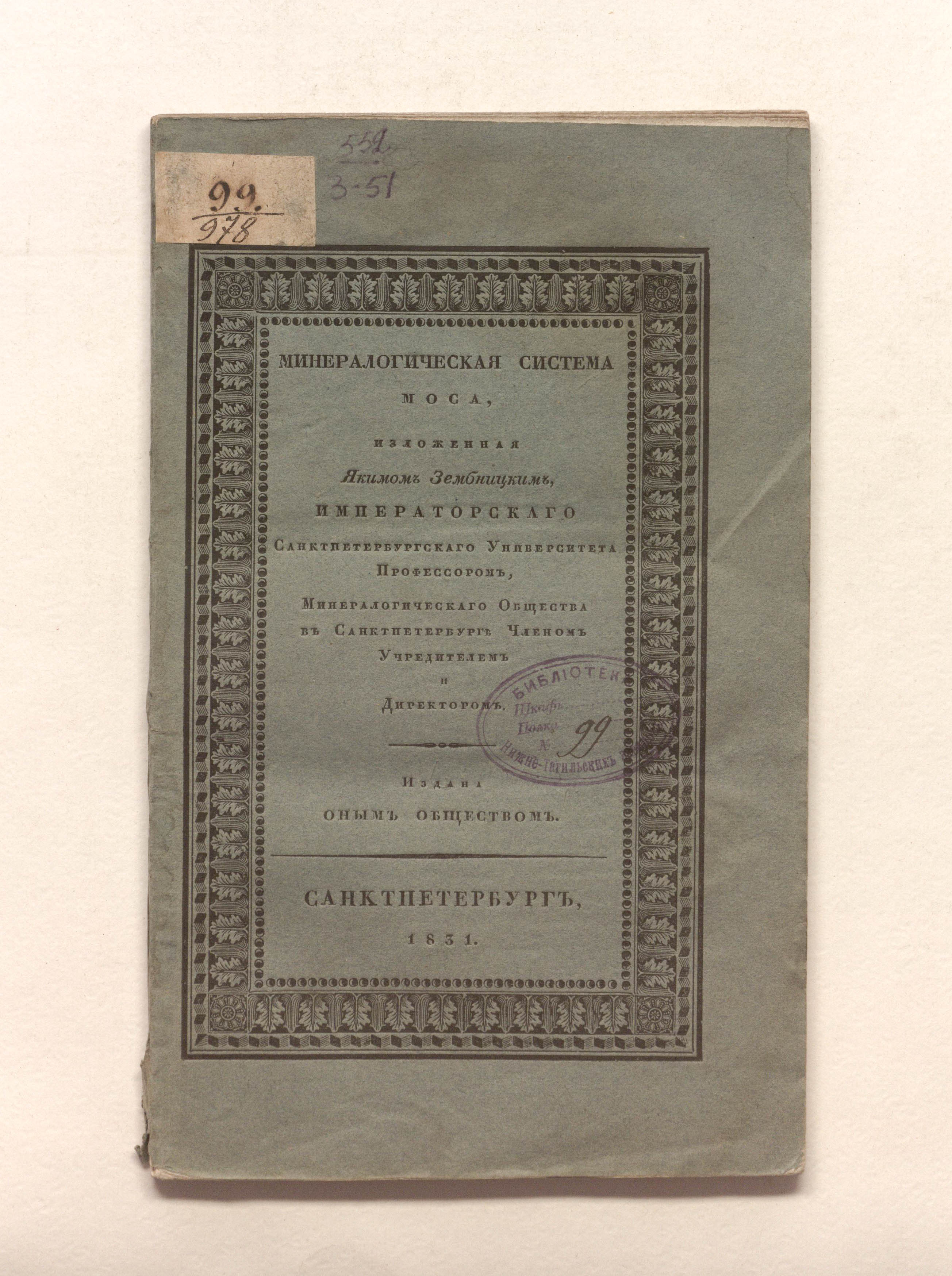 Зембницкий, Яким Григорьевич (1784-1851). Минералогическая система Моса, изложенная с замечаниями на оную в особенности, и в отношении к минералогическим системам вообще, Якимом Зембницким, Императорского Санктпетербургского университета профессором, Минералогического общества в Санкт-Петербурге членом учредителем и директором : изд. оным Обществом. — Санкт-Петербург, 1831. — IV, 71 с. ; 24х15 см.