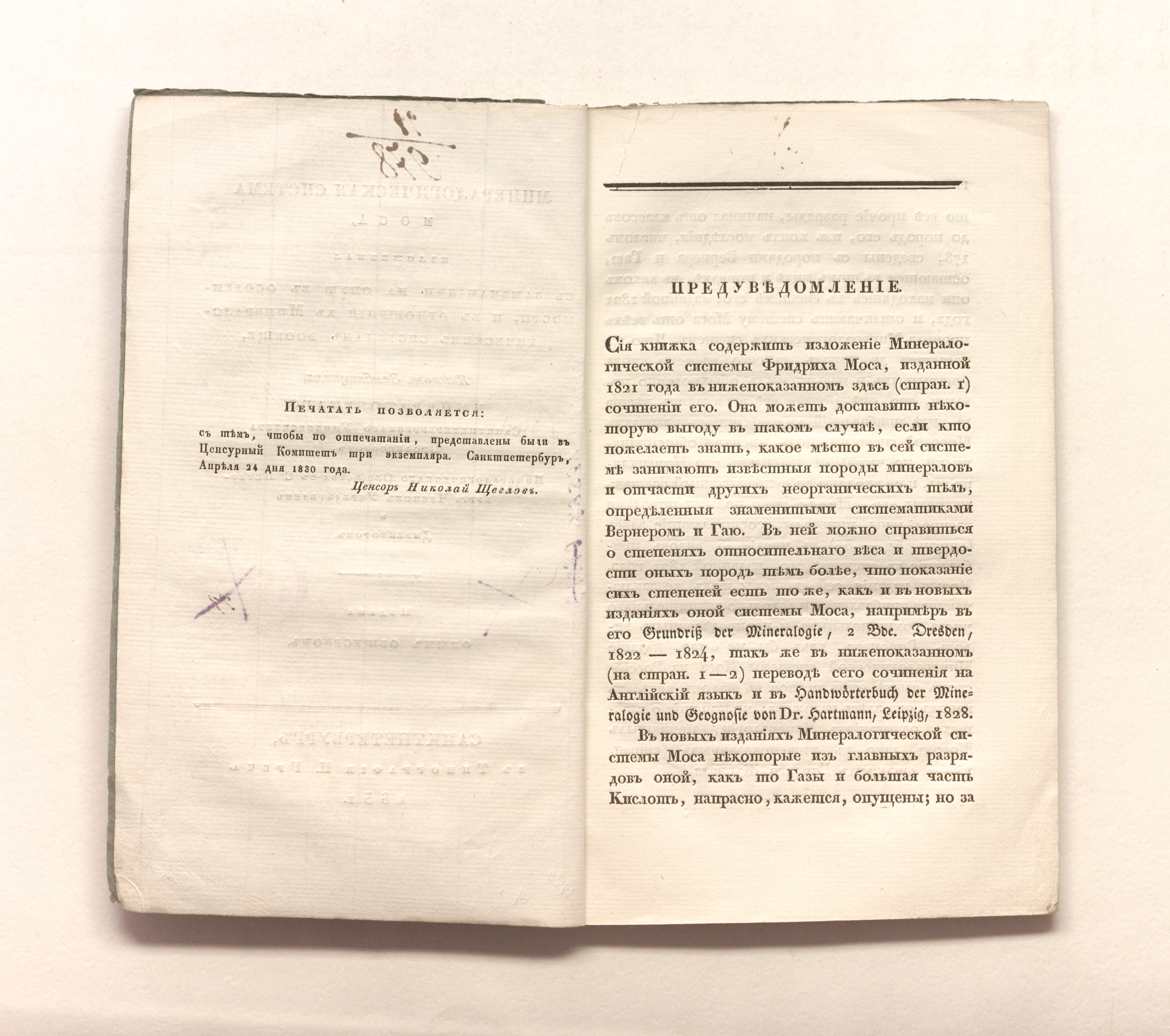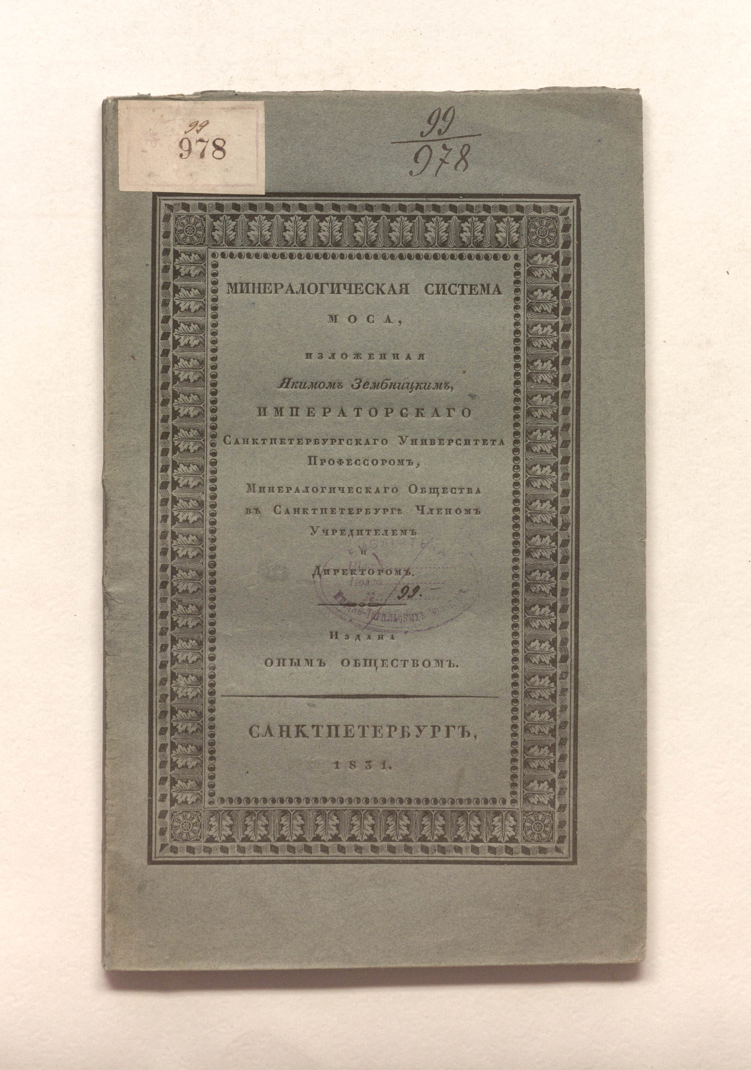 Зембницкий, Яким Григорьевич (1784-1851). Минералогическая система Моса, изложенная с замечаниями на оную в особенности, и в отношении к минералогическим системам вообще, Якимом Зембницким, Императорского Санктпетербургского университета профессором, Минералогического общества в Санкт-Петербурге членом учредителем и директором : изд. оным Обществом. — Санкт-Петербург, 1831. — IV, 71 с. ; 24х15 см.
