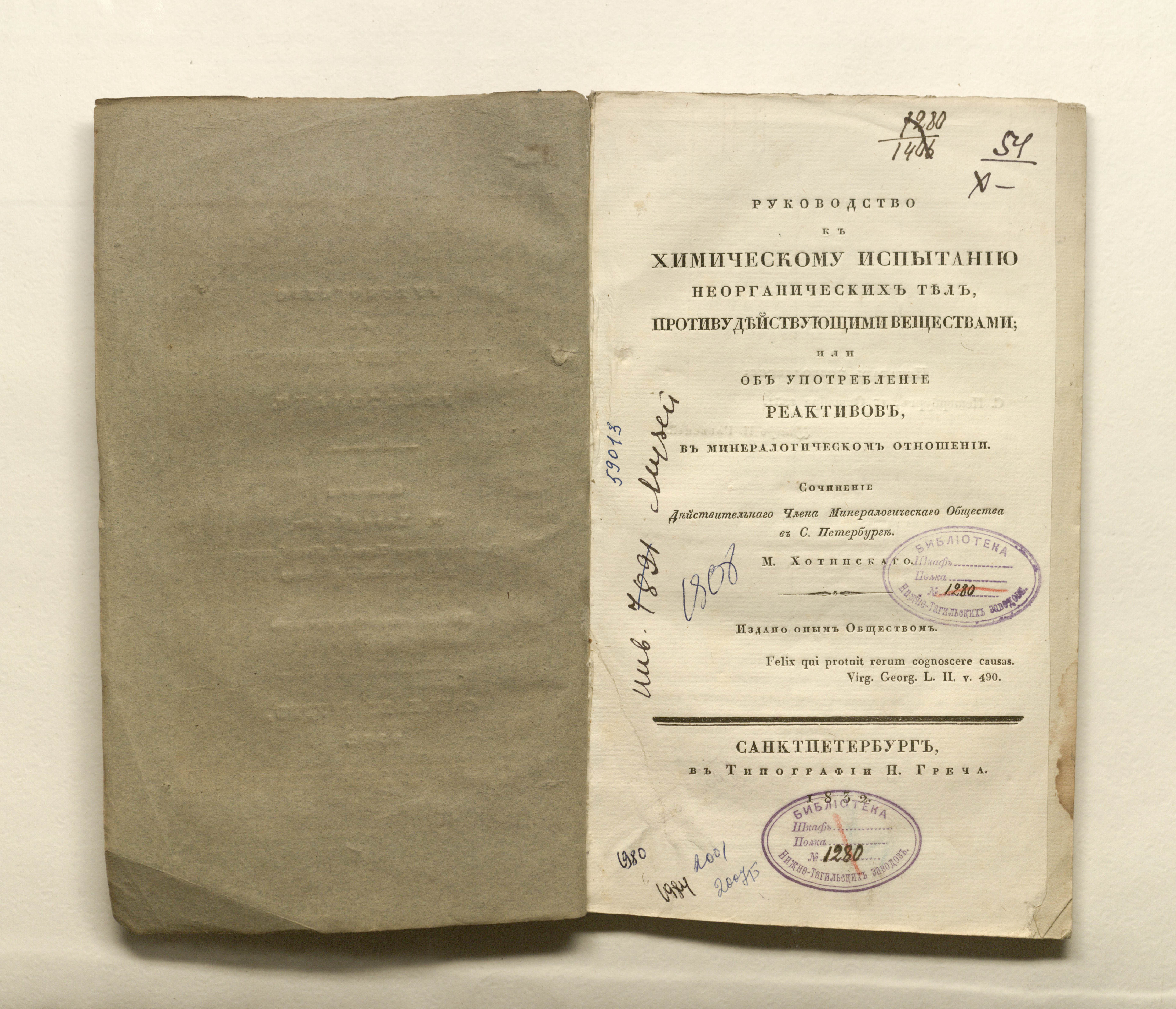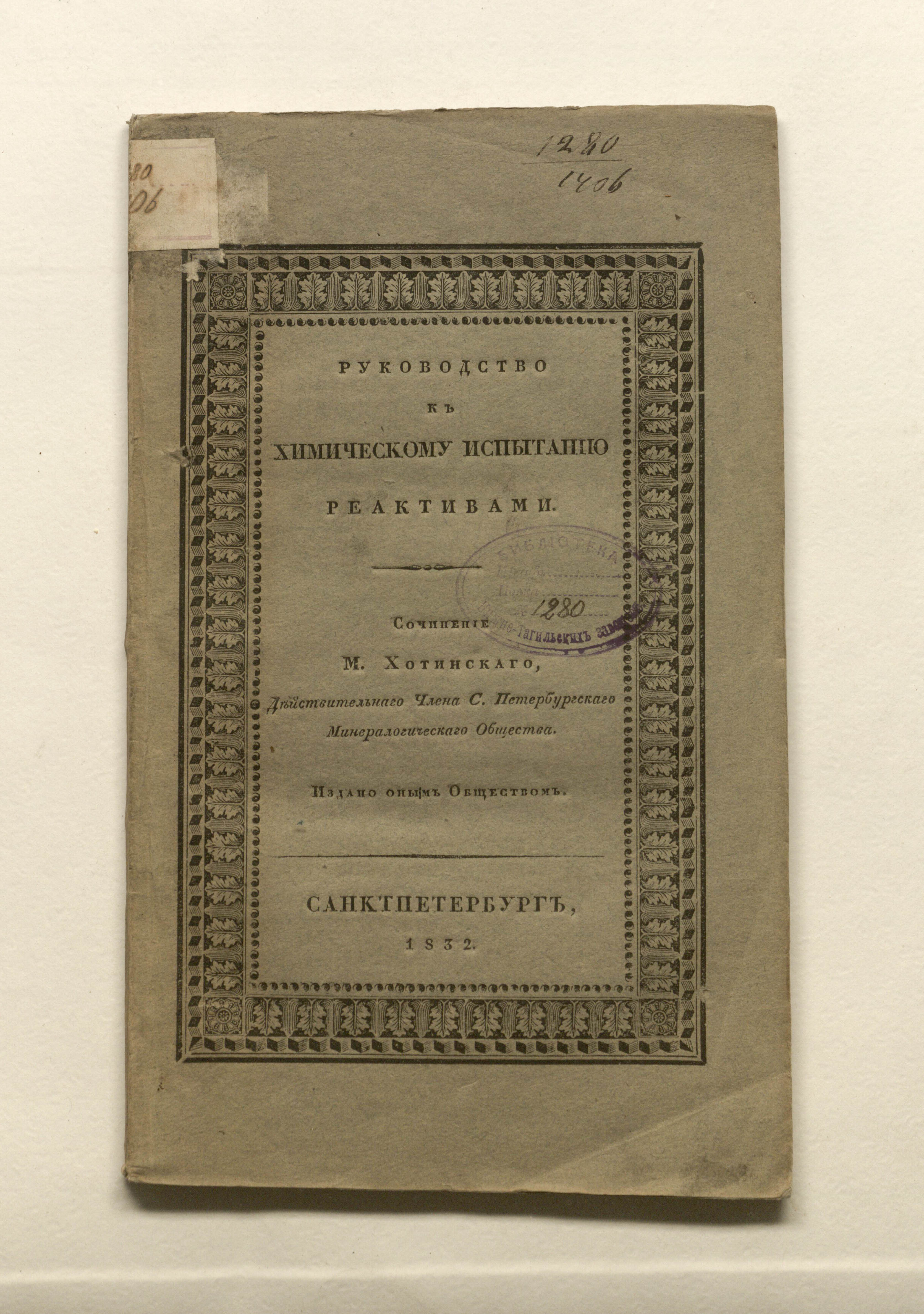 Хотинский, Матвей Степанович (1810-1866). Руководство к химическому испытанию неорганических тел, противодействующими веществами, или об употреблении реактивов, в минералогическом отношении / Соч. М. Хотинского. — Санкт-Петербург : тип. Н. Греча, 1832. — 93 с. ; 24,5Х15 см.