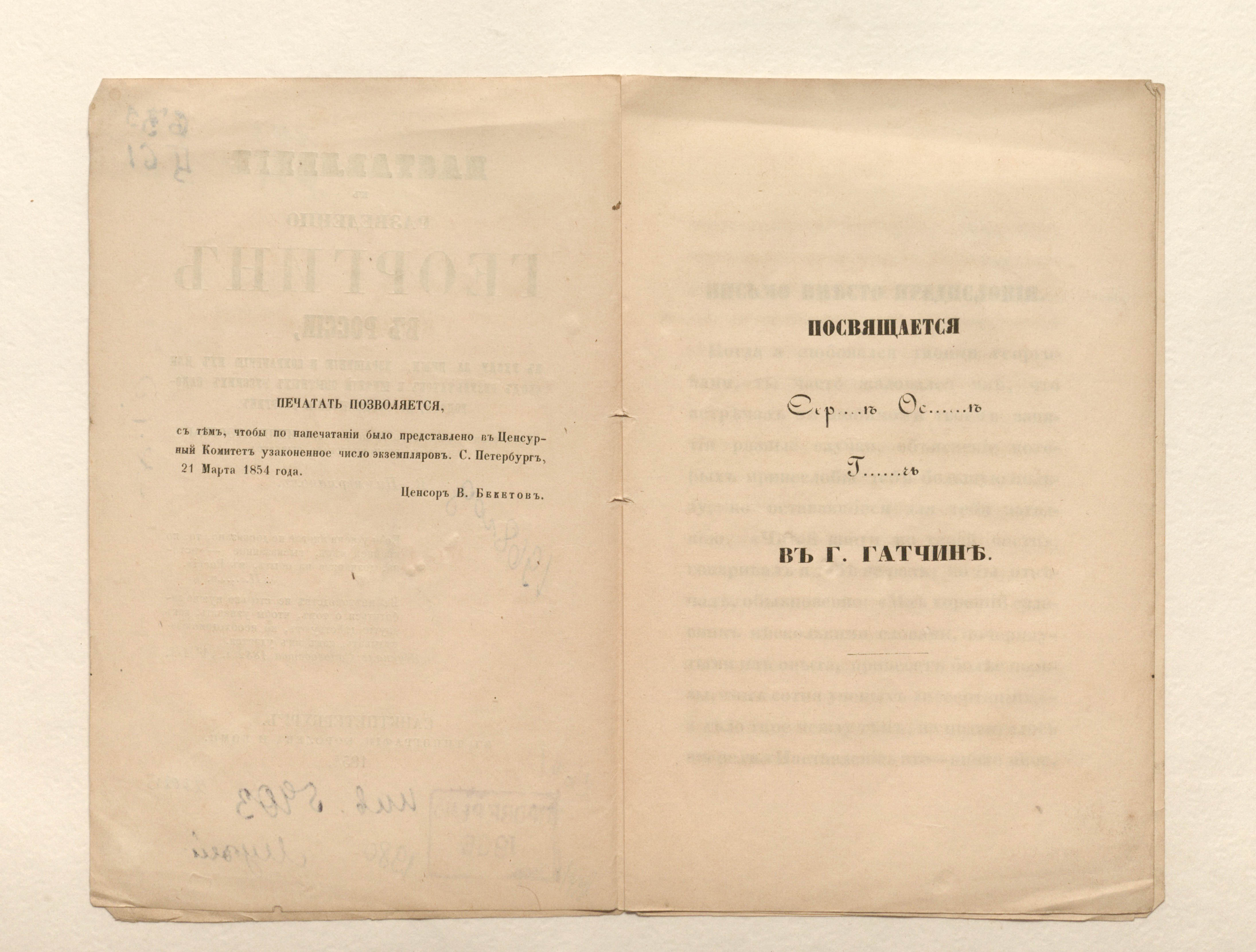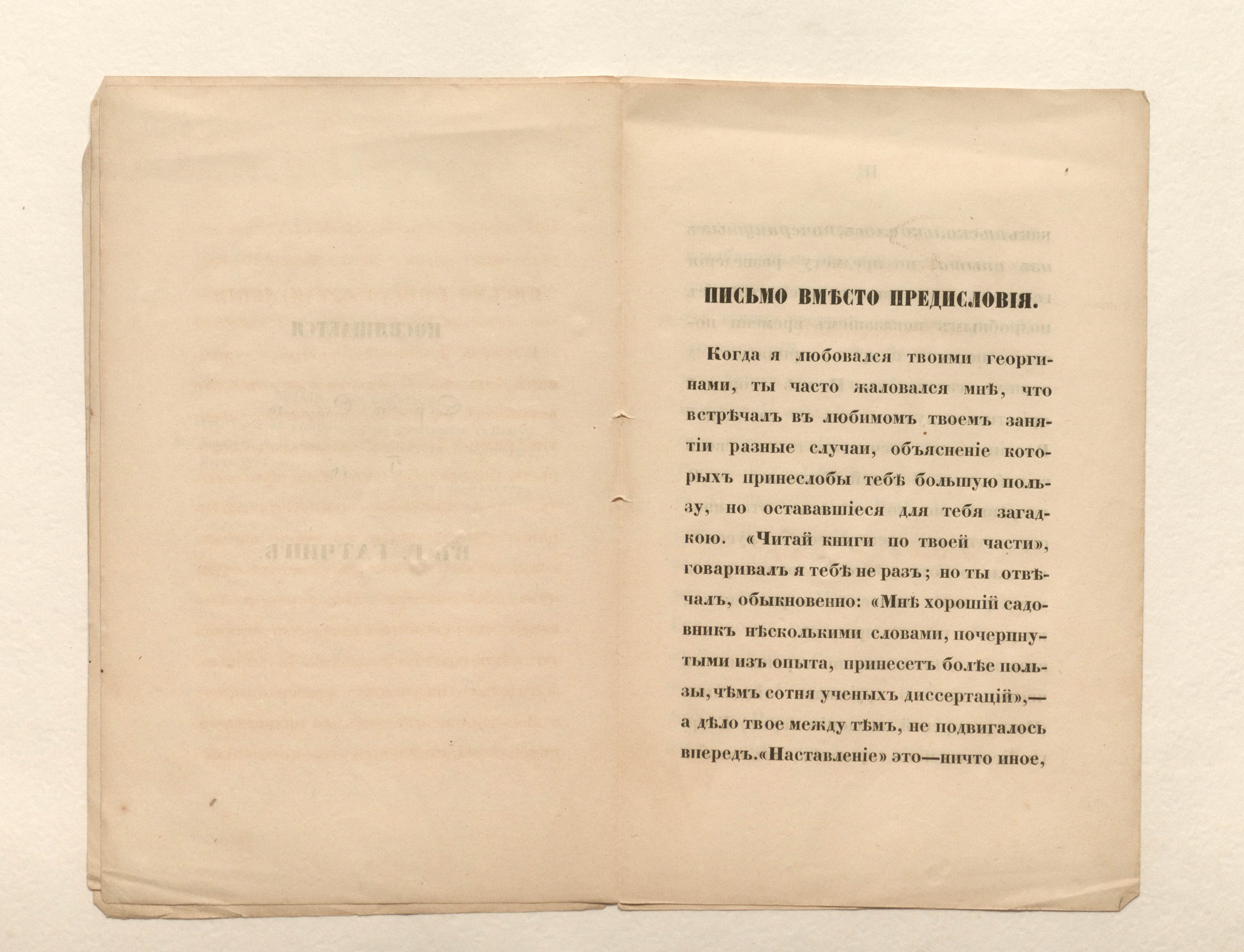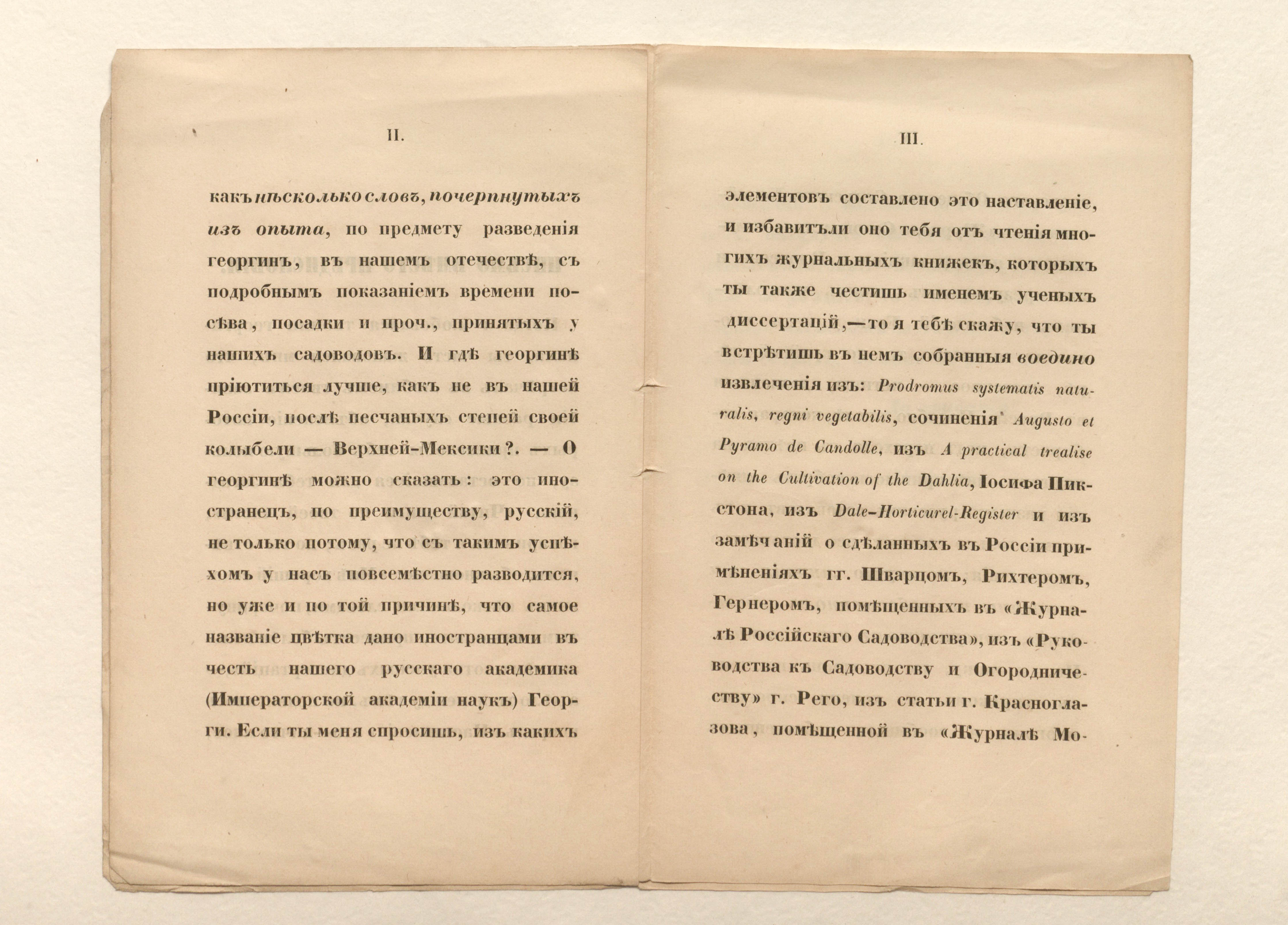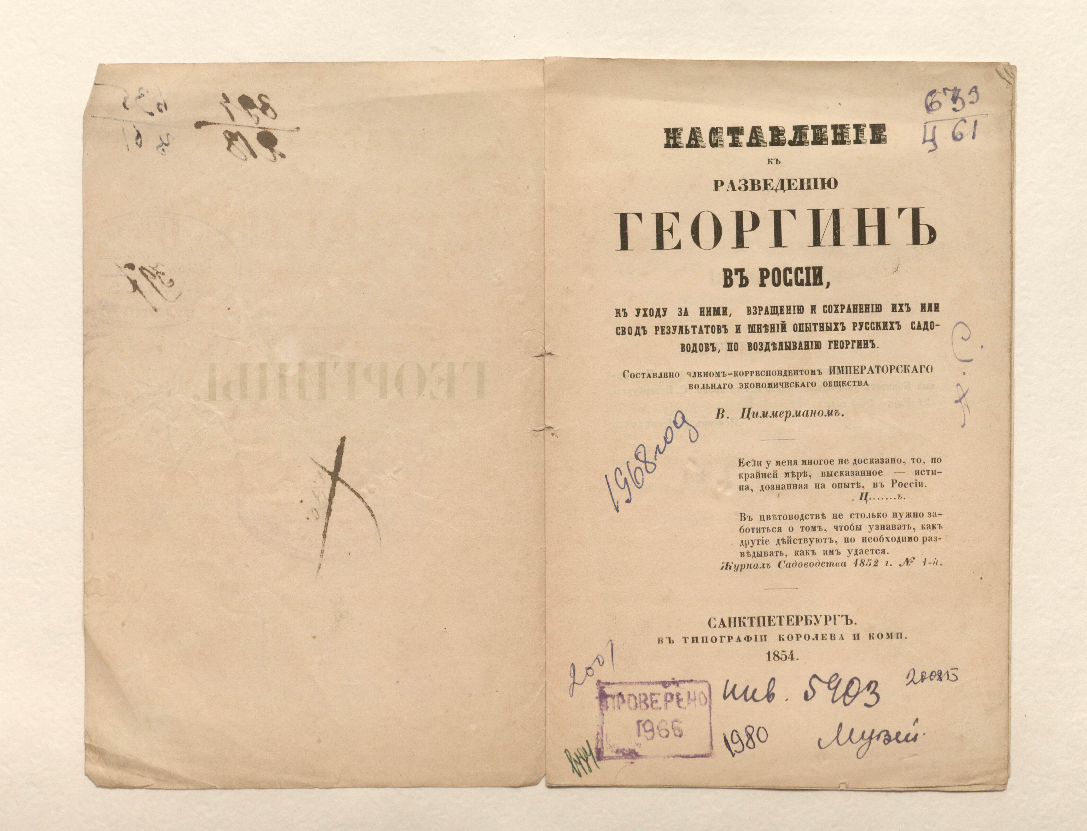 Наставление к разведению георгин в России : к уходу за ними, взращению и сохранению их или свод результатов и мнений опытных русских садоводов по возделыванию георгин / В. А. Циммерман. — Санкт-Петербург : Тип. Королева и К°, 1854. — [5], V с. ; 18х11,7 см.