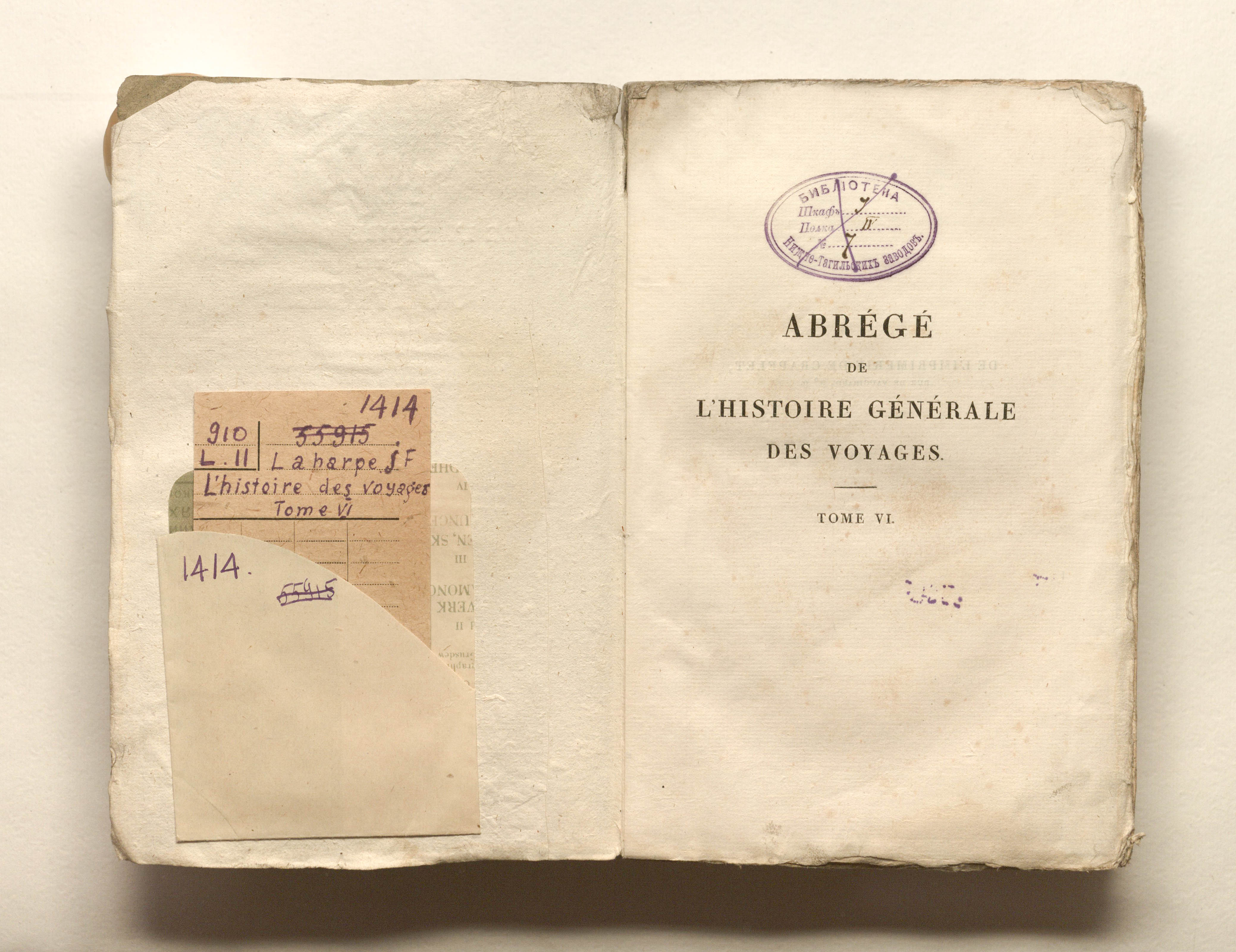 Лагарп Жан Франсуа де. Краткая всеобщая история путешествий, содержащая всё самое замечательное, самое полезное и лучше всего проверенное в странах, куда проникли путешественники: нравы жителей, религия, обычаи, искусство и наука, торговля, промышленное производство. Г-на де Лагарпа. Новое издание. Том шестой. - Париж: Ледентю, 1825. - 435, [1] с. : грав. фронт. ; 13,5х21 см.