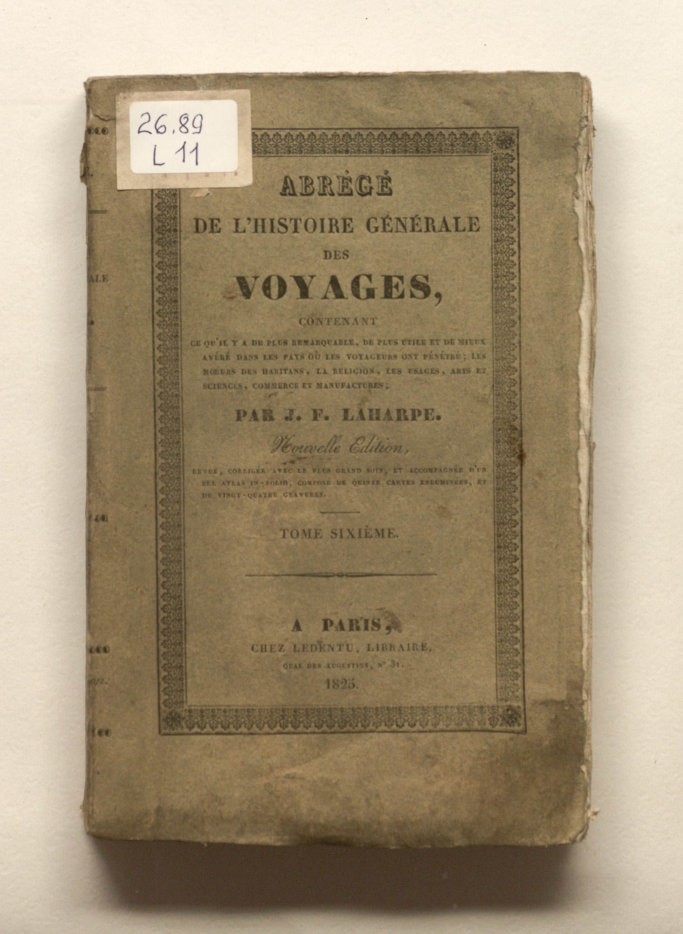 La Harpe, Jean Francois de (1739-1803). Abrege de l'histoire generale des voyages, contenant ce qu'il y a de plus remarquable, de plus utile et de mieux avere dans les pays ou les voyageurs ont penetre ; les moeurs des habitans, la religion, les usages, arts et sciences, commerce, manufactures. Par M. de La Harpe. Nouvelle edition. Tome sixieme. - T. 6 (En 24). - Nouv. ed. - Paris : Ledentu, 1825. - 435, [1] p. : grav. front. ; 13,5х21cm.