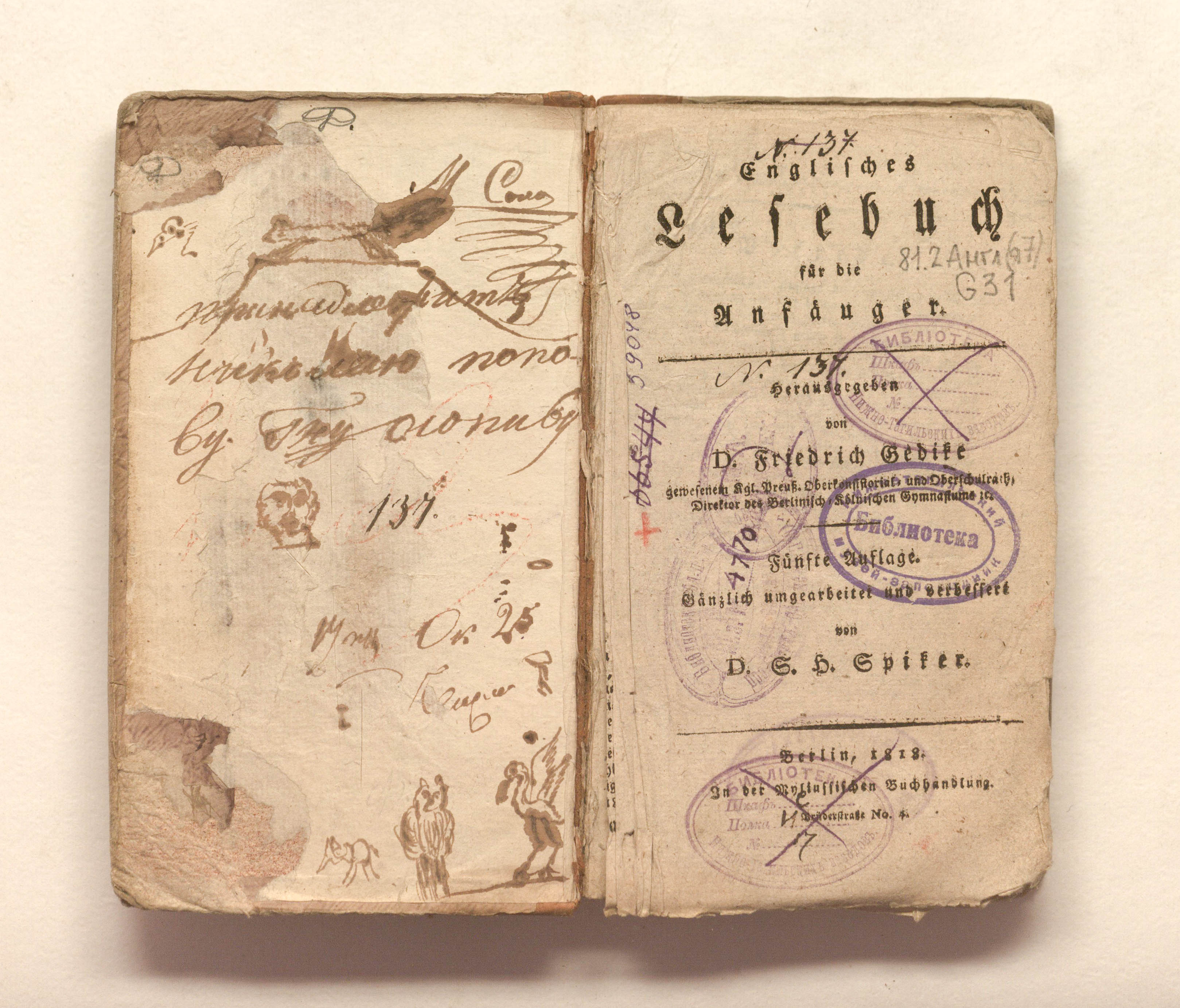 Гедике, Фридрих (1754-1803) Английский язык для начинающих (Книга для чтения на английском языке для начинающих). Под редакцией Д. Фридриха Гедике ... Издание пятое. Переработано и улучшено Д. Г. Х. Шпикером. – Берлин: Август Мюлиус, 1818. – IV, 281 с.; 10х18 см.