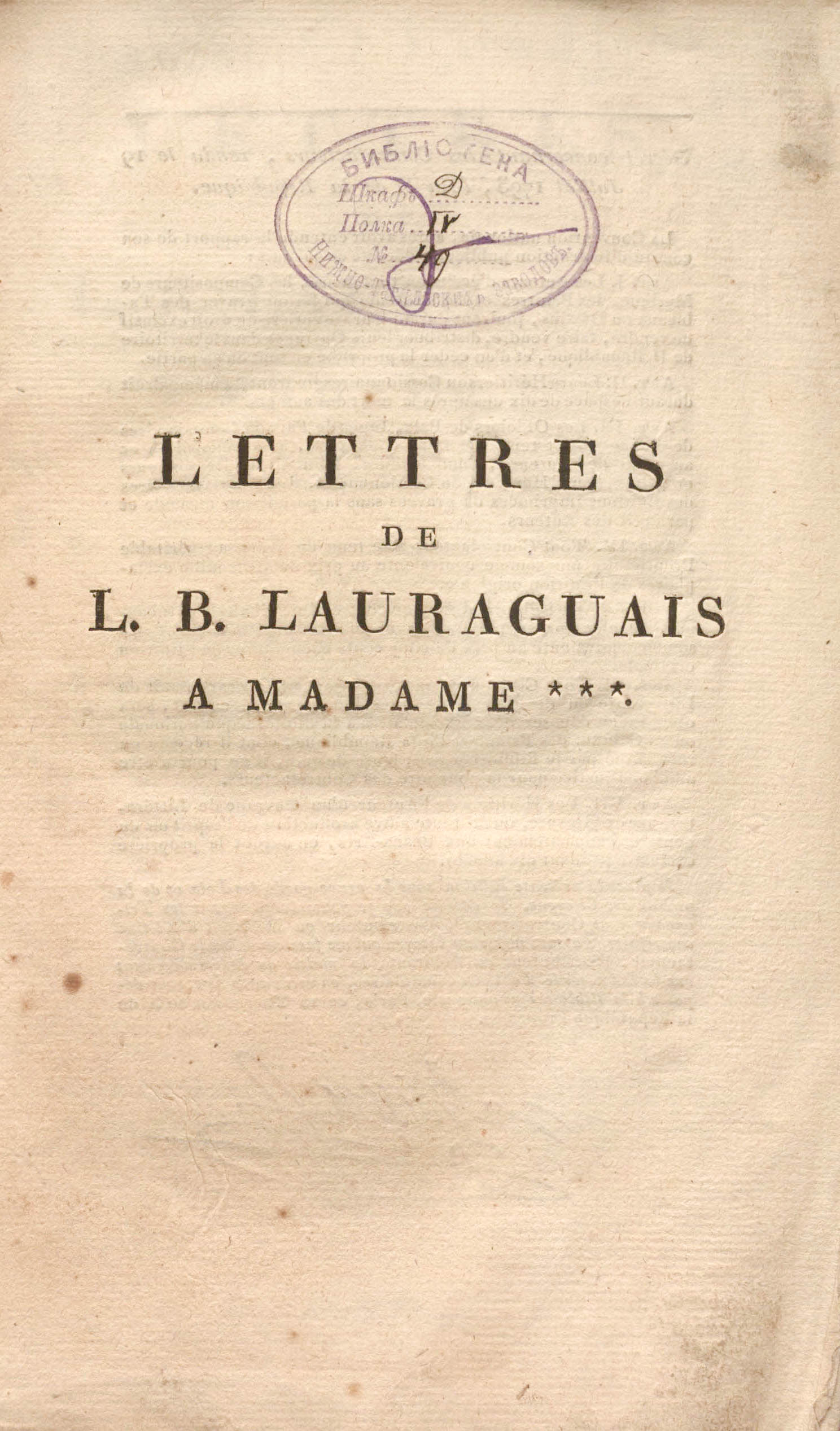 Lettres de L.-B. Lauraguais a     madame***, dans lesquelles on trouve des jugemens sur quelques ouvrages, la vie de l'abbe de Voisenon, une conversation de Champfort sur l'abbe Syeyes, et un fragment historique des memoires de madame de Brancas sur Louis XV et madame de Chateauroux. - Paris : F. Buisson, 1802. - 250, [1] p.; 14х22 cm.