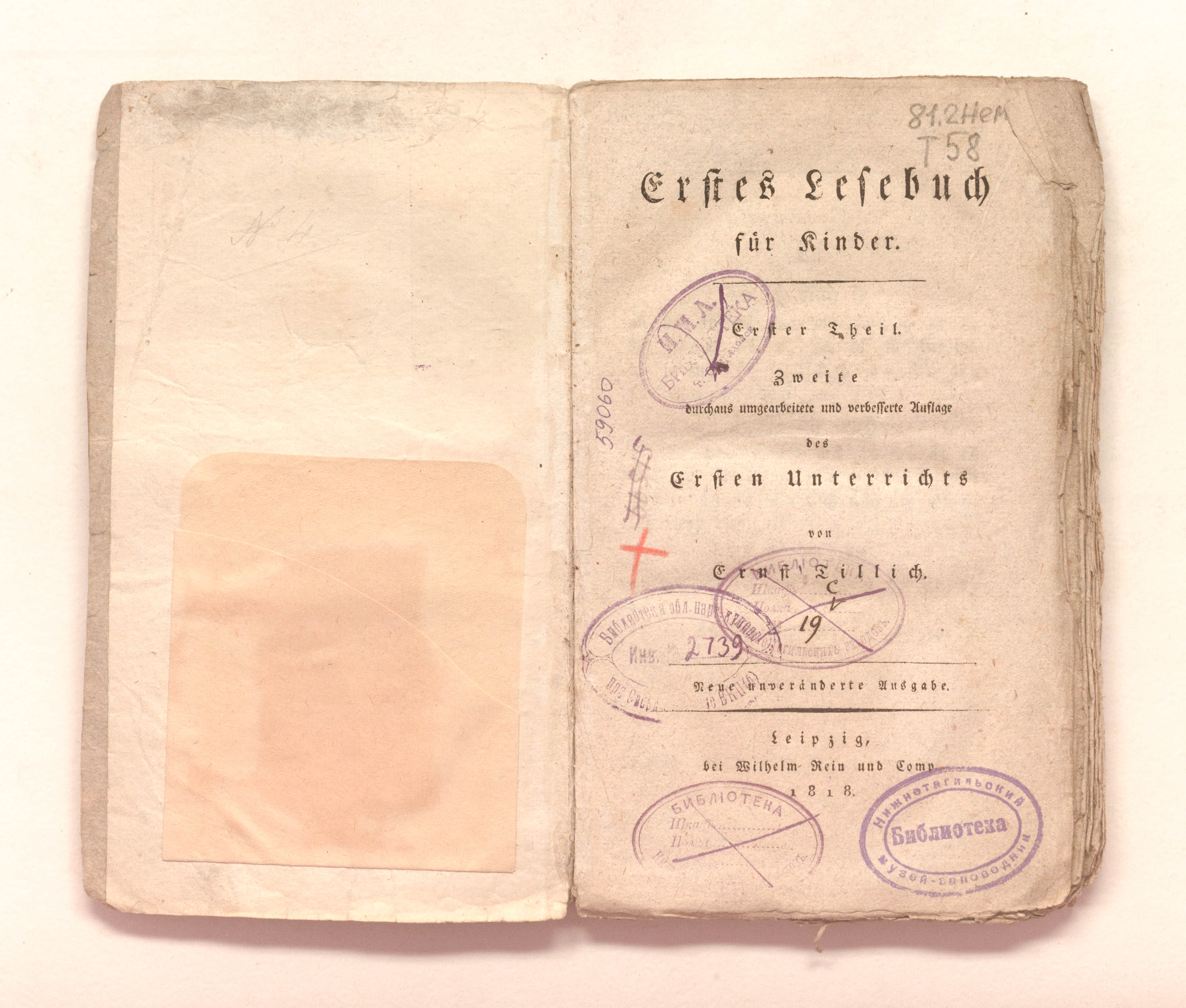 Тиллих, Эрнст. Первая книга для чтения для детей. Первая часть. Второе полностью переработанное и улучшенное издание первого урока Эрнста Тиллиха. Новая неизмененная редакция. – Лейпциг: Вильгельм Рейн и Ко., 1818. – 142 (из 158-ми) с.; 12х20 см.