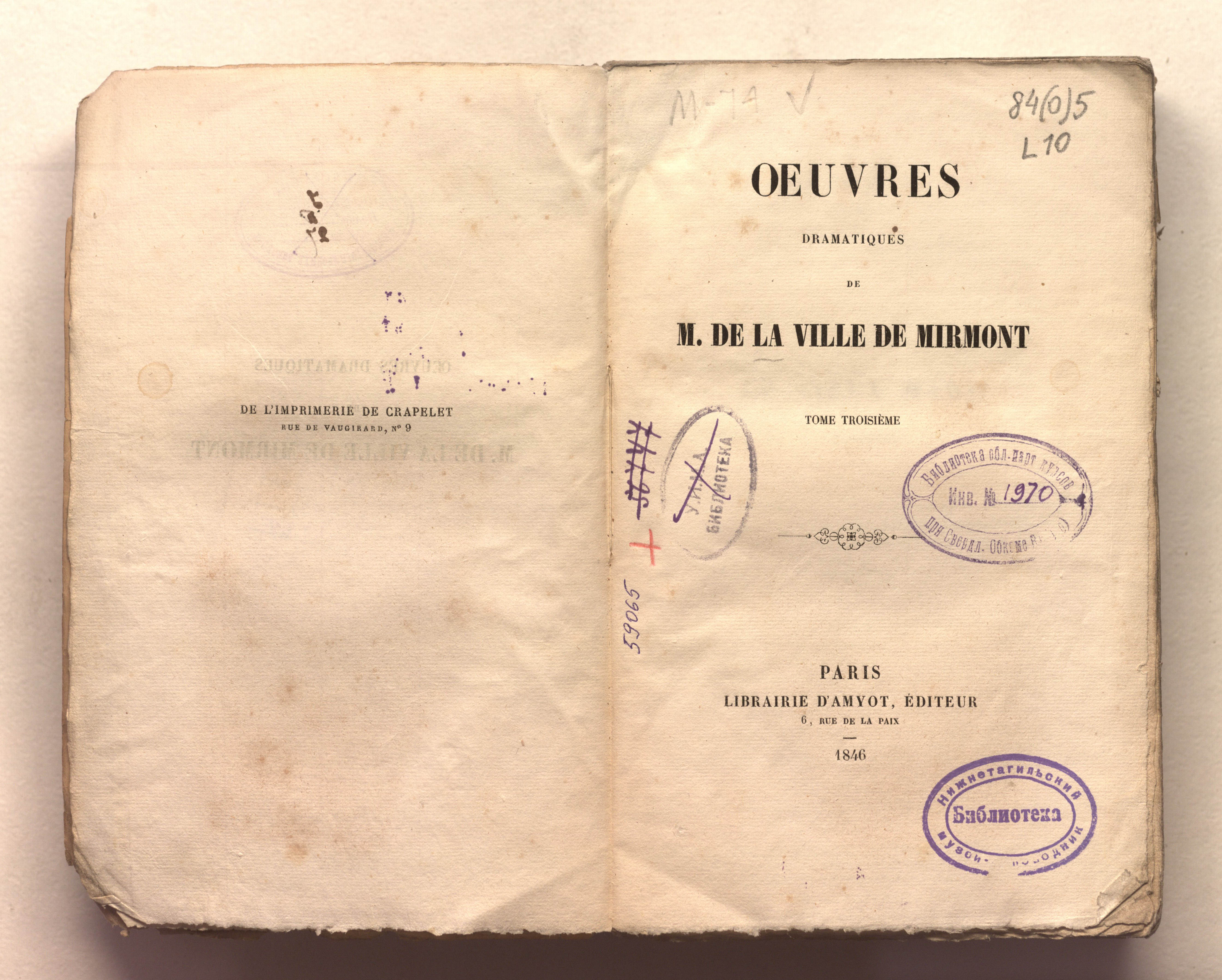Драматические сочинения г-на де Ла Виль де Мирмонт. – 4 т. – Т. 3. – Париж : Амио, 1846. – 631, [1] с.; 14х23 см.