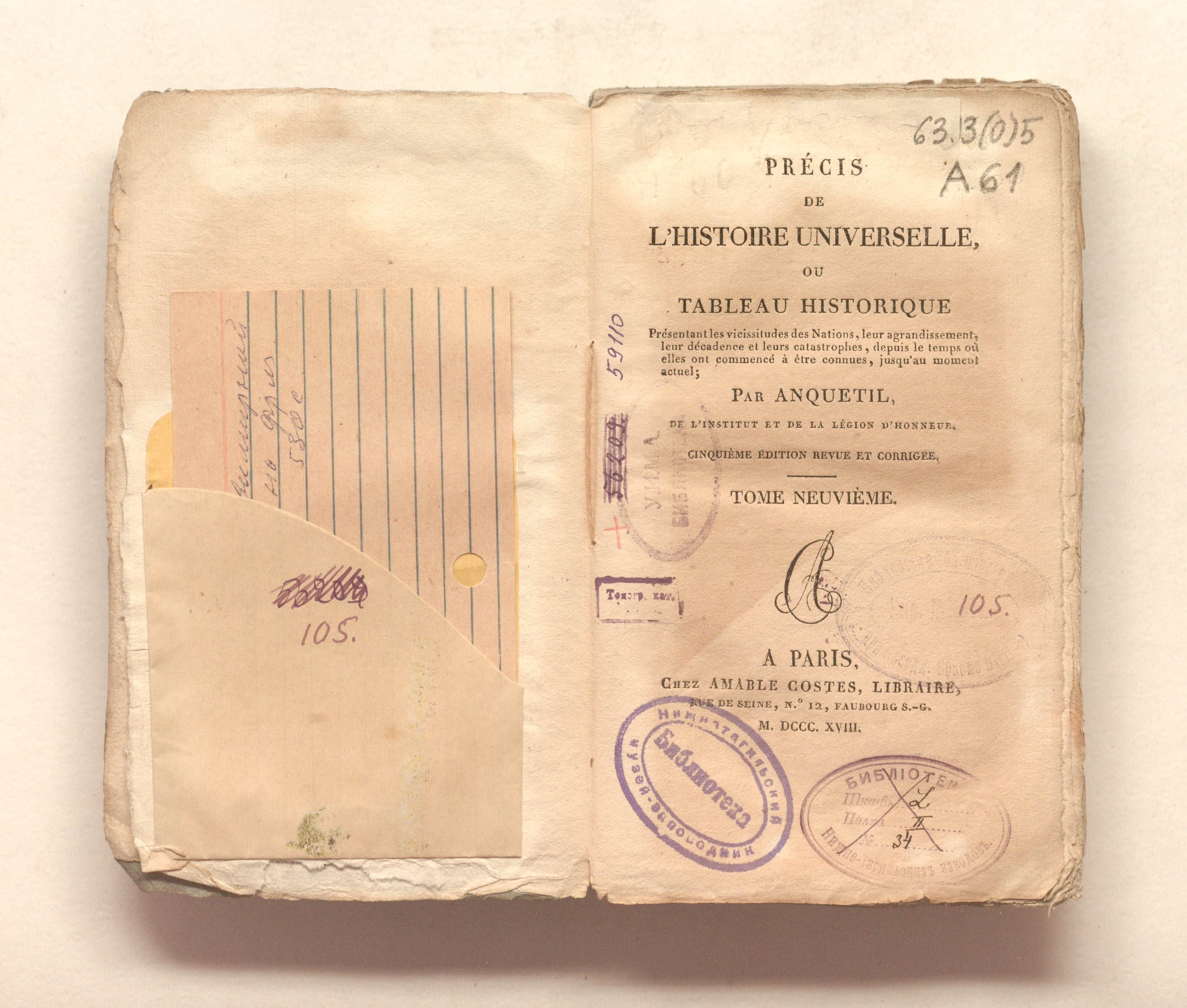 Anquetil, Louis-Pierre (1723-1806). Precis de l'histoire universelle, ou Tableau historique presentant les vicissitudes des nations... par Anquetil,... Cinquieme edition,... Tome neuvieme. - Paris : A. Costes, 1818. - 330, [1] p.; 11х18 cm.