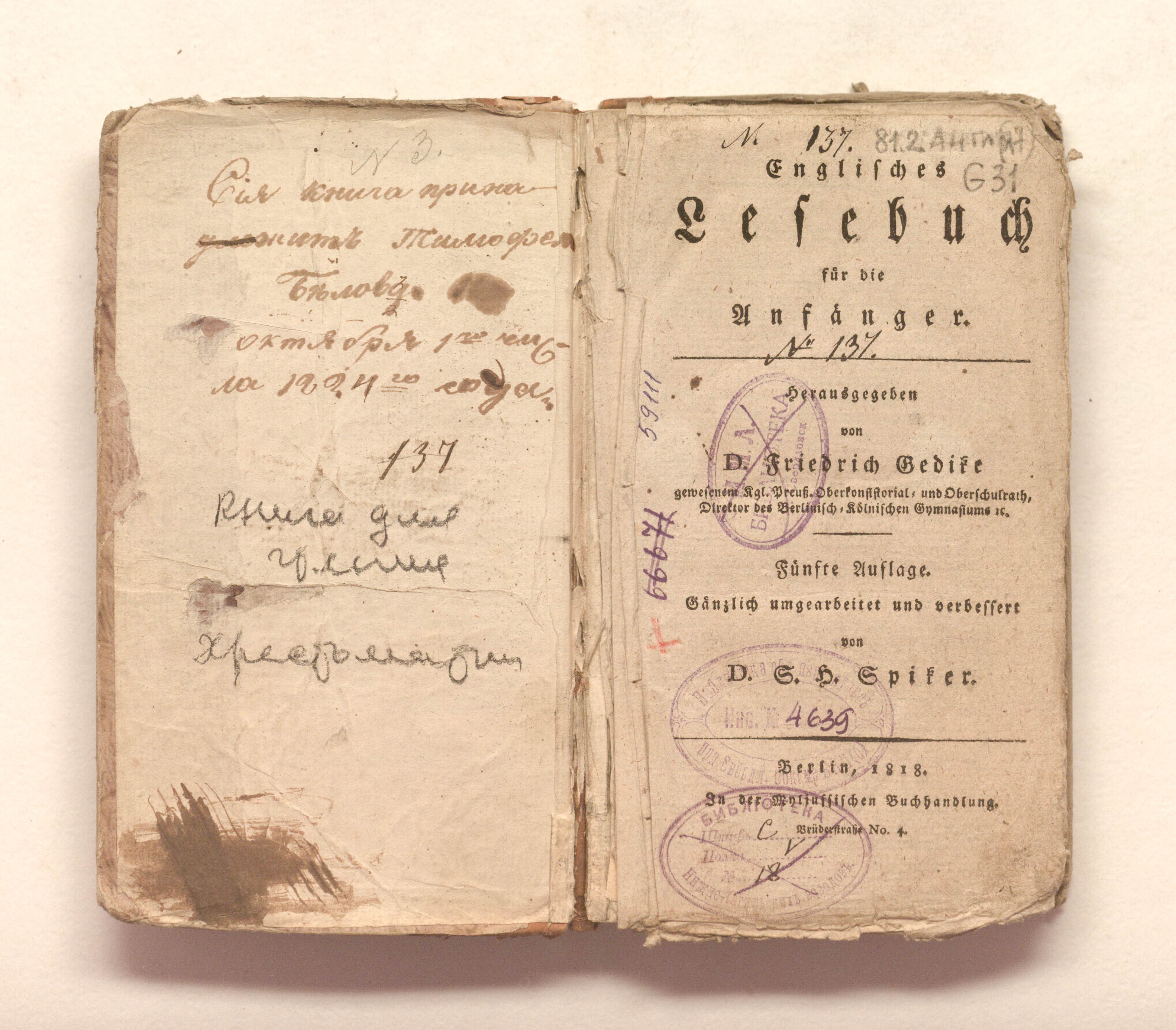 Гедике, Фридрих (1754-1803) Английский язык для начинающих (Книга для чтения на английском языке для начинающих). Под редакцией Д. Фридриха Гедике ... Издание пятое. Переработано и улучшено Д. Г. Х. Шпикером. – Берлин: Август Мюлиус, 1818. – IV, 281 с.; 10х18 см.