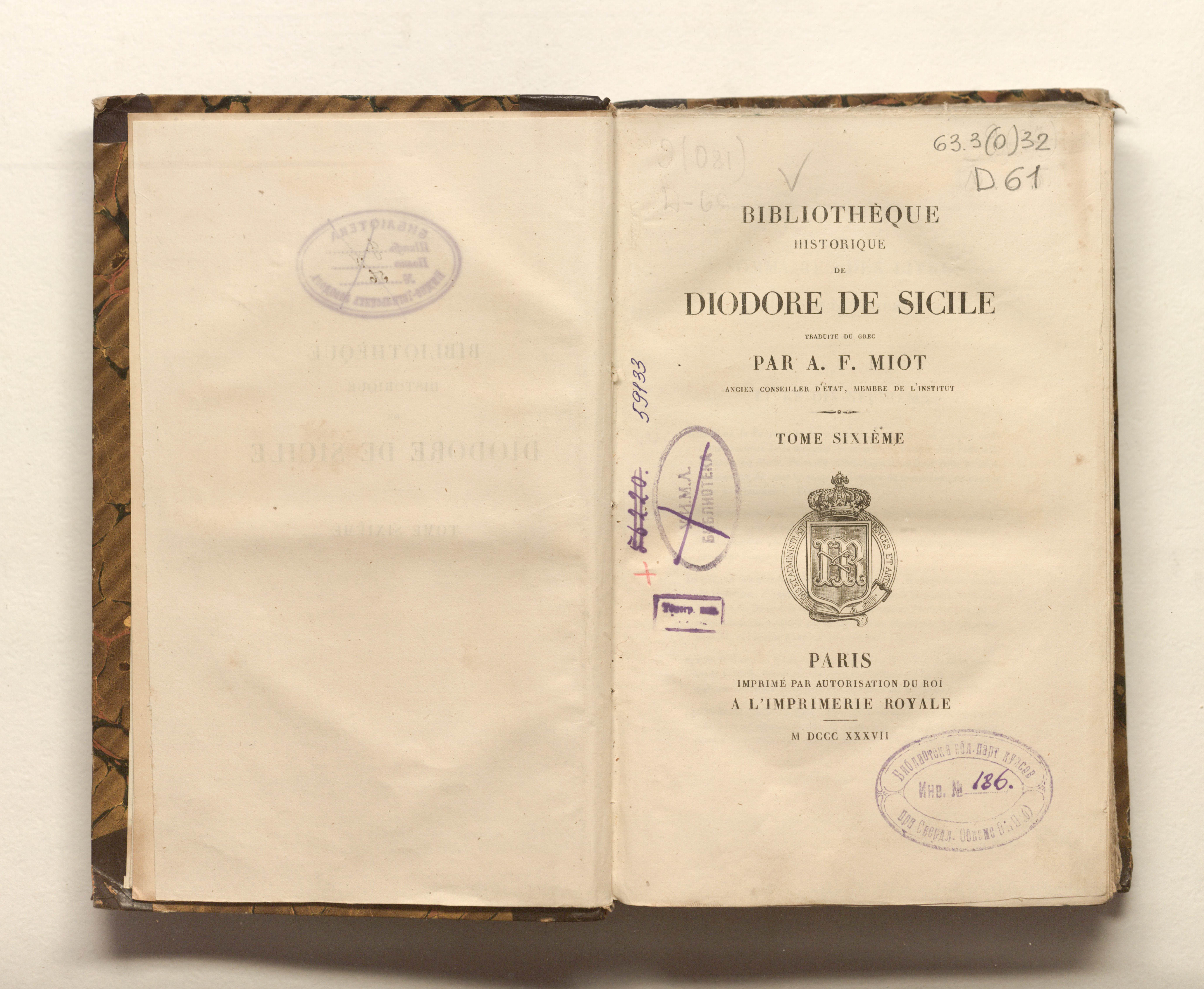Diodore de Sicile (90-20 B.C.). Bibliotheque historique de Diodore de Sicile, traduite du grec par A.-F. Miot ... - Tome sixieme. - Paris : Imprimerie royale, 1835. - XXVII, 523, [1]  p. ; 14х22,5cm.