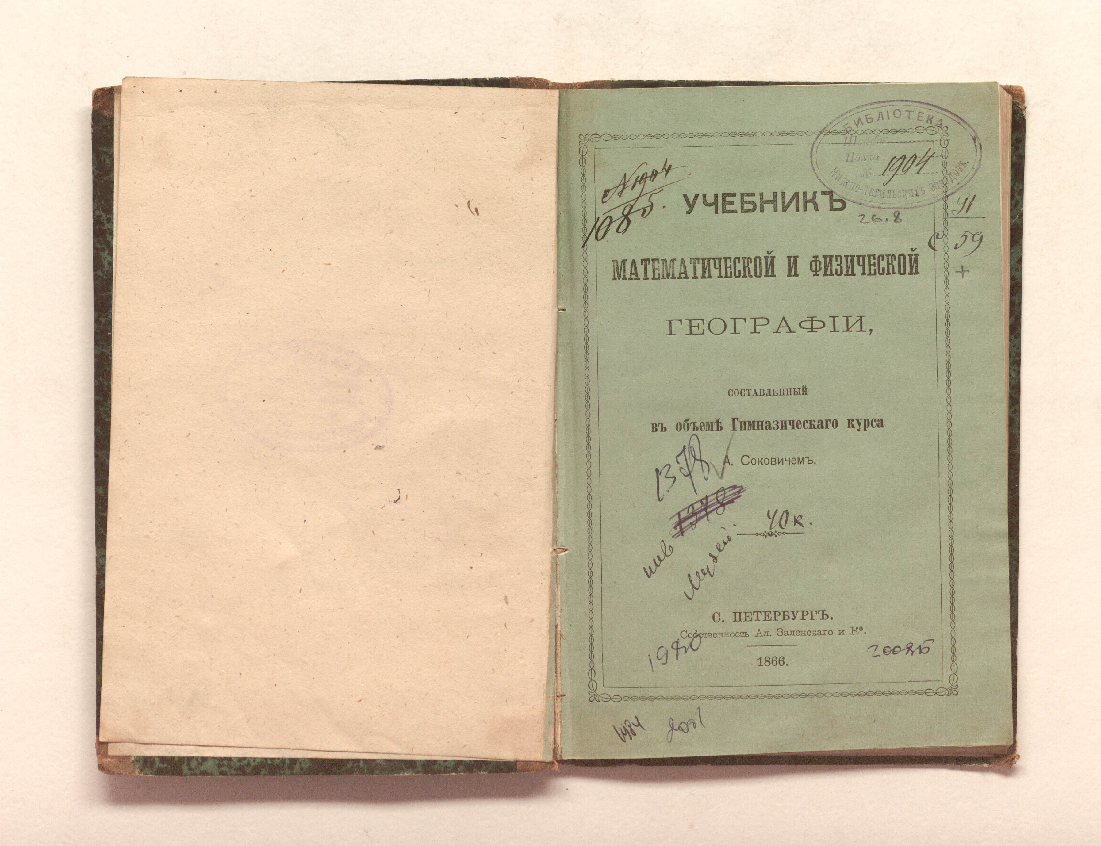 Учебник математической и физической географии / составленный в объеме гимназического курса А. Соковичем. — Санкт-Петербург : тип. Н. Тиблена и Комп., 1866. — 163 с. ; 18,5х12,5 см.